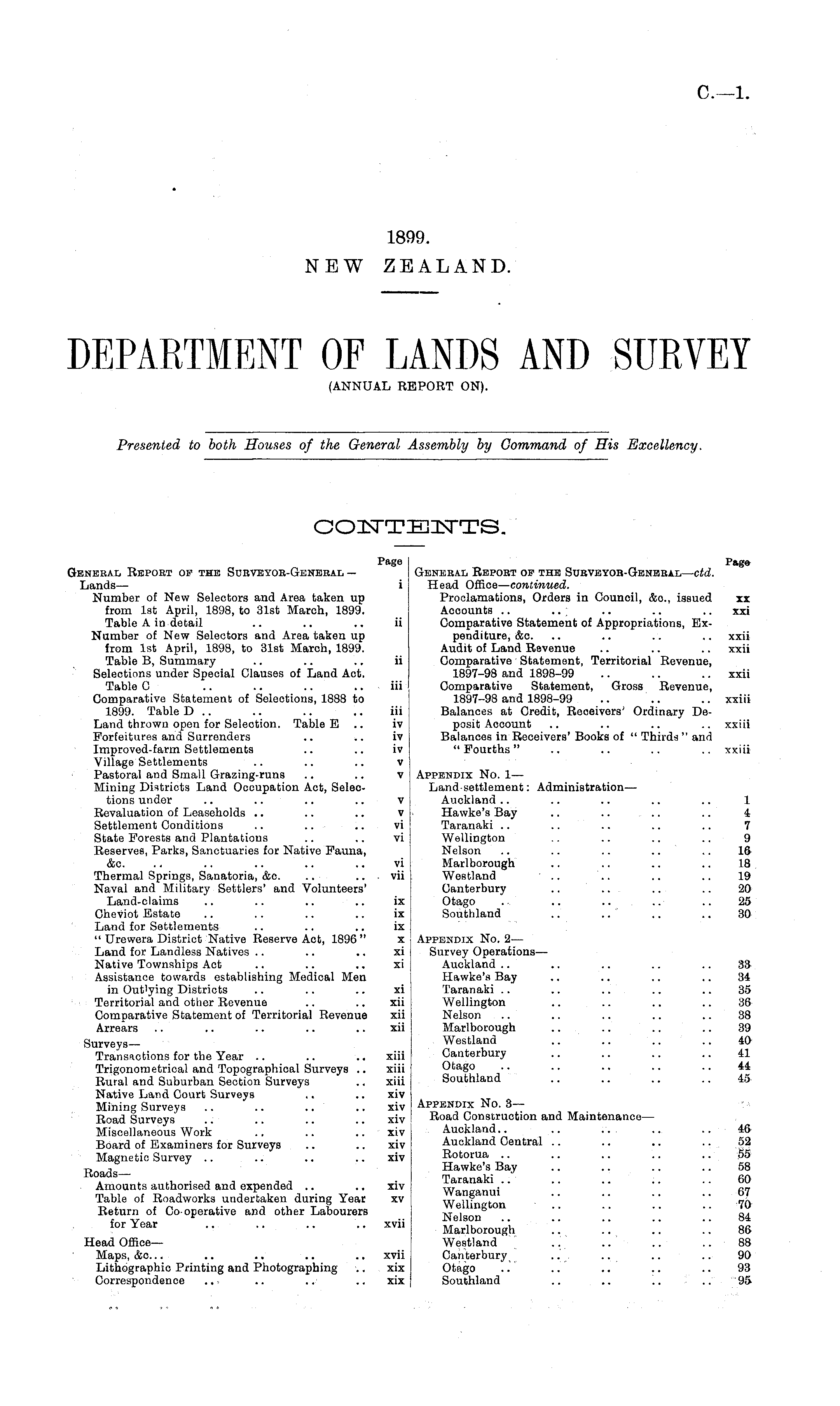 Page General Report op the Surveyor-General — Lands — i Number of New Selectors and Area taken up from Ist April, 1898, to 31st March, 1899. Table A in detail .. .. .. ii Number of New Selectors and Area taken up from Ist April, 1898, to 31st March, 1899. Table B, Summary .. .. .. ii Selections under Special Glauses of Land Act. Table 0 .. .. .. .. iii Comparative Statement of Selections, 1888 to 1899. Table D .. .. .. .. iii Land thrown open for Selection. Table B .. iv Forfeitures and Surrenders .. .. iv Improved-farm Settlements .. .. iv Village Settlements .. .. .. v Pastoral and Small Grazing-runs .. .. v Mining Districts Land Occupation Act, Selections under .. .. .. .. v Revaluation of Leaseholds .. .. .. v Settlement Conditions .. .... vi State Forests and Plantations .. .. vi Reserves, Parks, Sanctuaries for Native Fauna, &c. .. .. .. .. .. vi Thermal Springs, Sanatoria, &c. .. .. . vii Naval and Military Settlers' and Volunteers' Land-claims .. .. .. .. ix Cheviot Estate .. .. .. .. ix Land for Settlements .. .. .. ix " Urewera District Native Reserve Act, 1896" x Land for Landless Natives .. .. .. xi Native Townships Act .. .. .. xi Assistance towards establishing Medical Men in Outlying Districts .. .. .. xi Territorial and other Revenue .. .. xii Comparative Statement of Territorial Revenue xii Arrears .. .. .. .. .. xii SurveysTransactions for the Year .. .. .. xiii Trigonometrical and Topographical Surveys .. xiii Rural and Suburban Section Surveys .. xiii Native Land Court Surveys .. .. xiv Mining Surveys .. .. .. .. xiv Road Surveys .. .. .. .. xiv Miscellaneous Work .. .. .. xiv Board of Examiners for Surveys .. .. xiv Magnetic Survey .. .. .. .. xiv Roads— Amounts authorised and expended .. .. xiv Table of Roadworks undertaken during Year xv Return of Co-operative and other Labourers for Year .. .. .. .. xvii Head OfficeMaps, &c... .. .. .. .. xvii Lithographic Printing and Photographing .. xix Correspondence ... .. .. .. xix