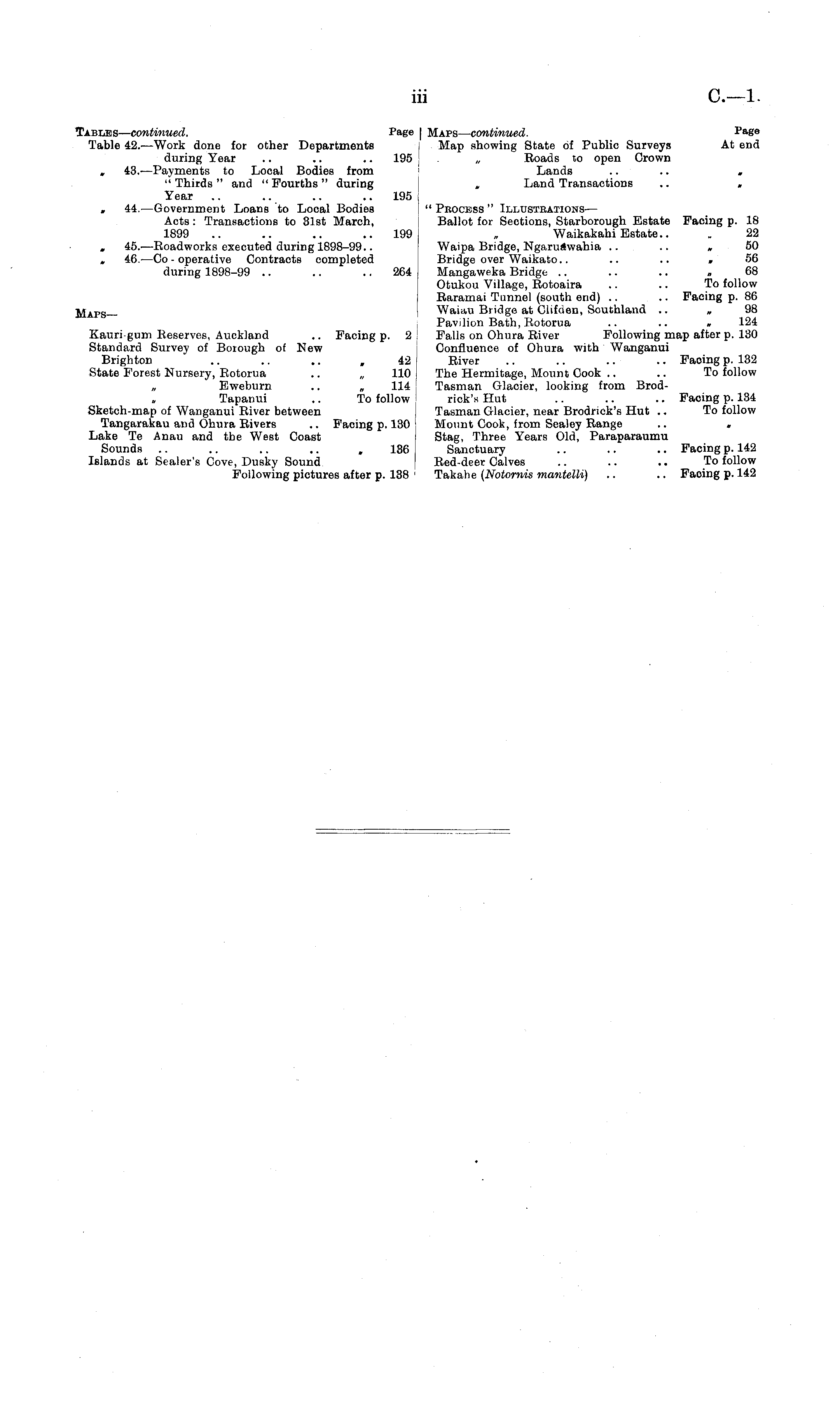 Tables— continued. Page Table 42.—Work done for other Departments during Year .. .. .. 195 , 43. —Payments to Local Bodies from "Thirds" and "Fourths" during Year .. .. .. ..195 » 44.—Government Loanß to Local Bodies Acts : Transactions to 31st March, 1899 .. .. .. ..199 45.-—Roadworks executed during 1898-99.. » 46.—C0 - operative Contracts completed during 1898-99 .. .. 264 Maps— Kauri-gum Reserves, Auckland .. Facing p. 2 Standard Survey of Borough of New Brighton .. .. .. , 42 j State Forest Nursery, Rotorua .. „ 110 I Eweburn .. „ 114 Tapanui .. To follow Sketch-map of Wanganui River between Tangarakau and Ohura Rivers .. Facing p. 130 Lake Te Anau and the West Coast Sounds .. .. .. .. , 136 Islands at Sealer's Cove, Dusky Sound Following pictures after p. 138
