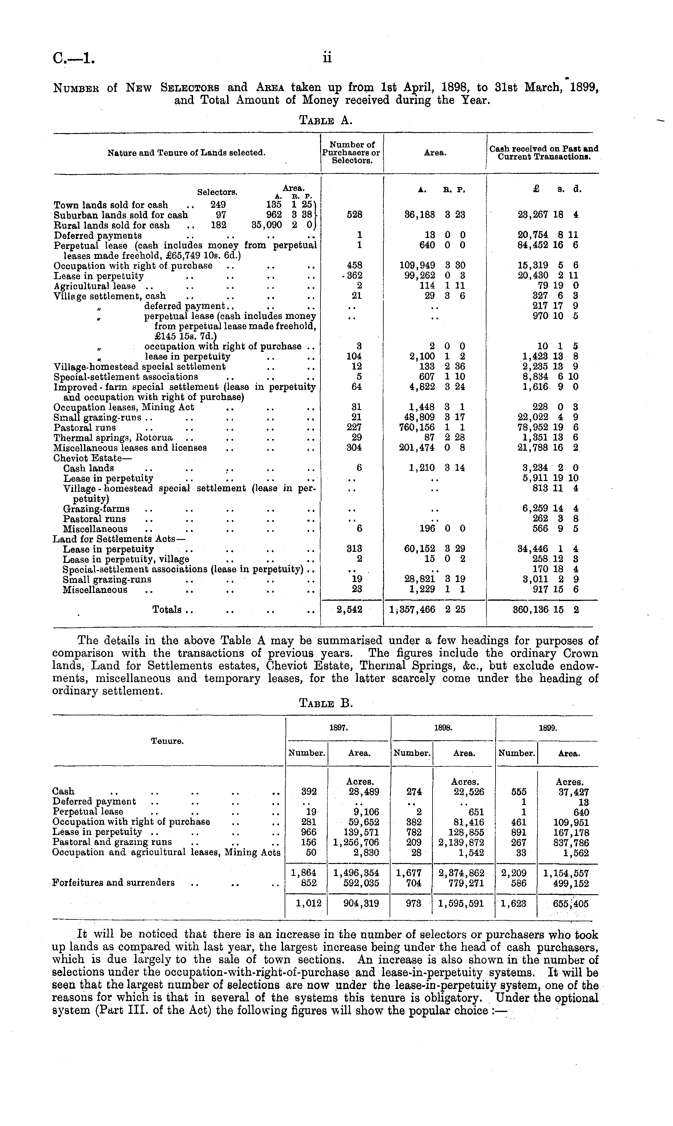 The details in the above Table A may be summarised under a few headings for purposes of comparison with the transactions of previous years. The figures include the ordinary Crown lands, Land for Settlements estates, Cheviot Estate, Thermal Springs, &c, but exclude endowments, miscellaneous and temporary leases, for the latter scarcely come under the heading of ordinary settlement.