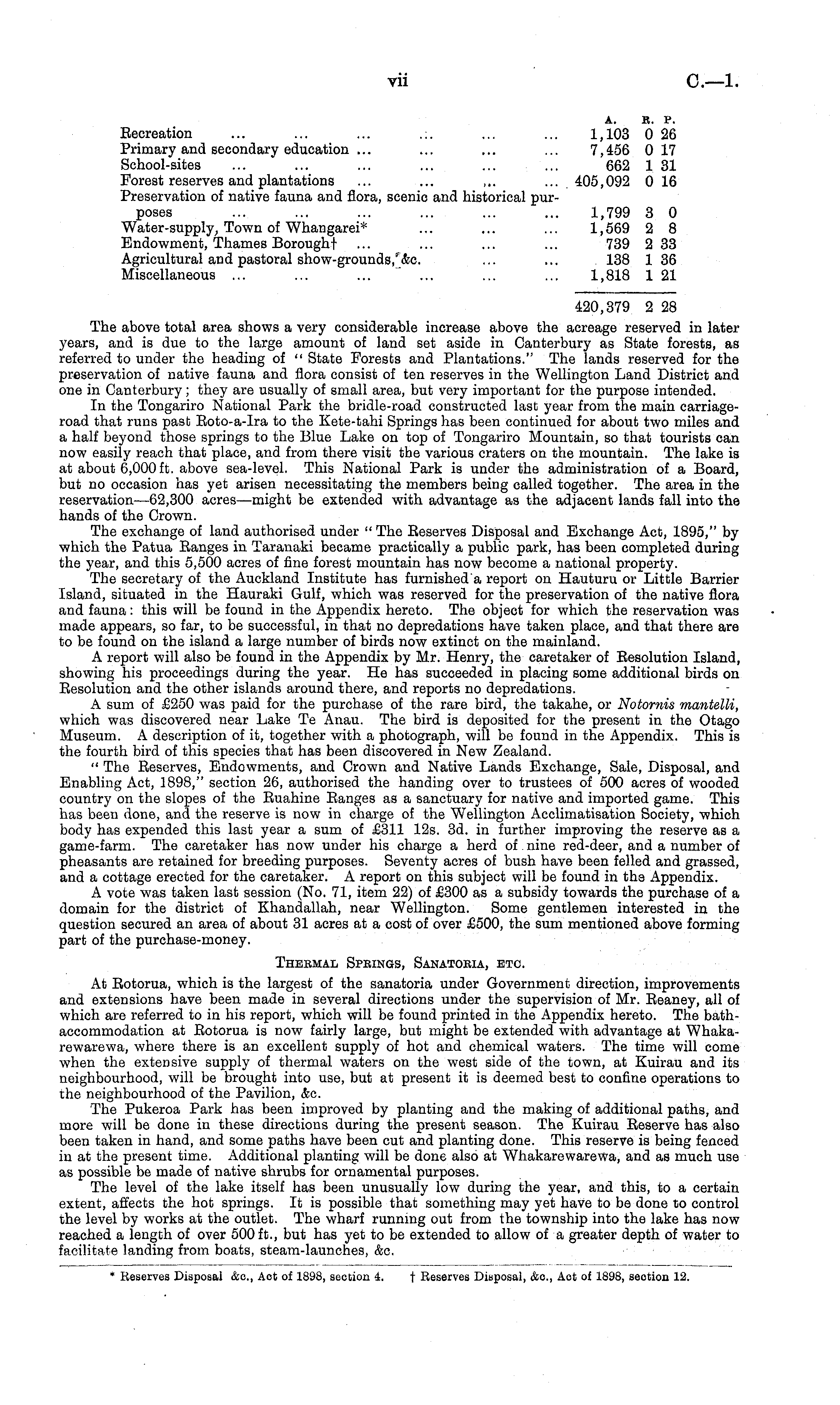 A. E. P. Eecreation ... ... ... ... ... ... 1,103 0 26 Primary and secondary education ... ... ... ... 7,456 0 17 School-sites ... ... ... ... ... ... 662 1 31 Forest reserves and plantations ... ... ... ... 405,092 016 Preservation of native fauna and flora, scenic and historical purposes ... ... ... ... ... ... 1,799 3 0 Water-supply, Town of Whangarei* ... ... ... 1,569 2 8 Endowment, Thames Borought ... ... ... ... 739 233 Agricultural and pastoral show-grounds, 1 &o. ... ... 138 1 36 Miscellaneous ... ... ... ... ... ... 1,818 1 21 420,379 2 28 The above total area shows a very considerable increase above the acreage reserved in later years, and is due to the large amount of land set aside in Canterbury as State forests, as referred to under the heading of " State Forests and Plantations." The lands reserved for the preservation of native fauna and flora consist of ten reserves in the Wellington Land District and one in Canterbury; they are usually of small area, but very important for the purpose intended. In the Tongariro National Park the bridle-road constructed last year from the main carriageroad that runs past Boto-a-Ira to the Kete-tahi Springs has been continued for about two miles and a half beyond those springs to the Blue Lake on top of Tongariro Mountain, so that tourists can now easily reach that place, and from there visit the various craters on the mountain. The lake is at about 6,000 ft. above sea-level. This National Park is under the administration of a Board, but no occasion has yet arisen necessitating the members being called together. The area in the reservation —62,300 acres—might be extended with advantage as the adjacent lands fall into the hands of the Crown. The exchange of land authorised under " The Eeserves Disposal and Exchange Act, 1895," by which the Patua Eanges in Taranaki became practically a public park, has been completed during the year, and this 5,500 acres of fine forest mountain has now become a national property. The secretary of the Auckland Institute has furnished'a report on Hauturu or Little Barrier Island, situated in the Hauraki Gulf, which was reserved for the preservation of the native flora and fauna: this will be found in the Appendix hereto. The object for which the reservation was made appears, so far, to be successful, in that no depredations have taken place, and that there are to be found on the island a large number of birds now extinct on the mainland. A report will also be found in the Appendix by Mr. Henry, the caretaker of Besolution Island, showing his proceedings during the year. He has succeeded in placing some additional birds on Eesolution and the other islands around there, and reports no depredations. A sum of £250 was paid for the purchase of the rare bird, the takahe, or Notornis mantelli, which was discovered near Lake Te Anau. The bird is deposited for the present in the Otago Museum. A description of it, together with a photograph, will be found in the Appendix. This is the fourth bird of this species that has been discovered in New Zealand. " The Eeserves, Endowments, and Crown and Native Lands Exchange, Sale, Disposal, and Enabling Act, 1898," section 26, authorised the handing over to trustees of 500 acres of wooded country on the slopes of the Euahine Eanges as a sanctuary for native and imported game. This has been done, and the reserve is now in charge of the Wellington Acclimatisation Society, which body has expended this last year a sum of £311 12s. 3d. in further improving the reserve as a game-farm. The caretaker has now under his charge a herd of nine red-deer, and a number of pheasants are retained for breeding purposes. Seventy acres of bush have been felled and grassed, and a cottage erected for the caretaker. A report on this subject will be found in the Appendix. A vote was taken last session (No. 71, item 22) of £300 as a subsidy towards the purchase of a domain for the district of Khandallah, near Wellington. Some gentlemen interested in the question secured an area of about 31 acres at a cost of over £500, the sum mentioned above forming part of the purchase-money. Theemal Speings, Sanatoeia, etc. At Eotorua, which is the largest of the sanatoria under Government direction, improvements and extensions have been made in several directions under the supervision of Mr. Eeaney, all of which are referred to in his report, which will be found printed in the Appendix hereto. The bathaccommodation at Eotorua is now fairly large, but might be extended with advantage at Whakarewarewa, where there is an excellent supply of hot and chemical waters. The time will come when the extensive supply of thermal waters on the west side of the town, at Kuirau and its neighbourhood, will be brought into use, but at present it is deemed best to confine operations to the neighbourhood of the Pavilion, &c. The Pukeroa Park has been improved by planting and the making of additional paths, and more will be done in these directions during the present season. The Kuirau Eeserve has also been taken in hand, and some paths have been cut and planting done. This reserve is being fenced in at the present time. Additional planting will be done also at Whakarewarewa, and as much use as possible be made of native shrubs for ornamental purposes. The level of the lake itself has been unusually low during the year, and this, to a certain extent, affects the hot springs. It is possible that something may yet have to be done to control the level by works at the outlet. The wharf running out from the township into the lake has now reached a length of over 500 ft., but has yet to be extended to allow of a greater depth of water to facilitate landing from boats, steam-launches, &c.