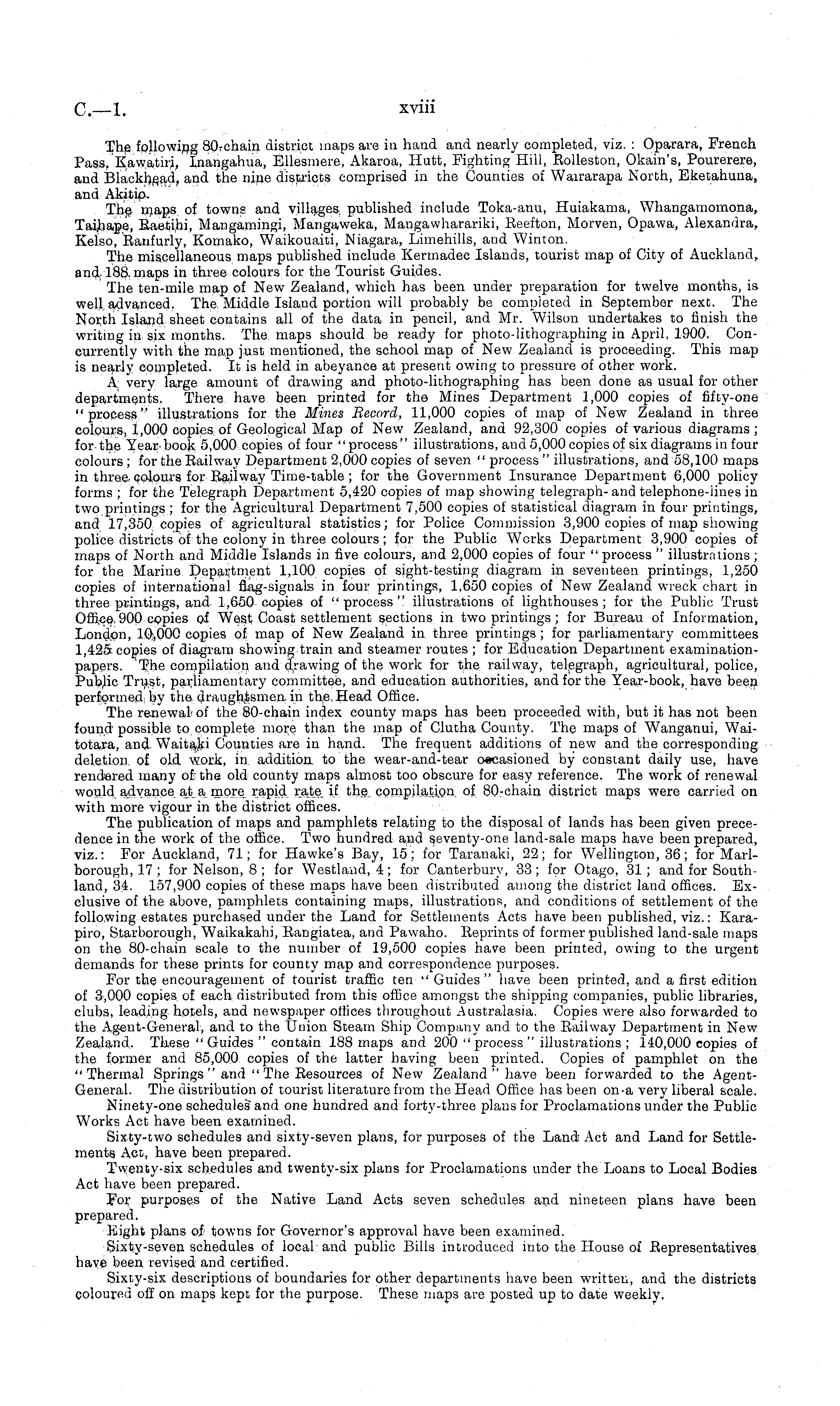 The following 80-chain district maps are in hand and nearly completed, viz. : Oparara, French Pass, Kawatiri, Inangahua, Ellesmere, Akaroa, Hutt, Fighting Hill, Eolleston, Okain's, Pourerere, and Blackhead, and the nine districts comprised in the Counties of Wairarapa North, Eketahuna, and Akitio. The maps of towns and villages published include Toka-anu, Huiakama, Whangamomona, Taihape, Eaetihi, Mangamingi, Mangaweka, Mangawharariki, Eeefton, Morven, Opawa, Alexandra, Kelso, Banfurly, Komako, Waikouaiti, Niagara, Limehills, and Winton. The miscellaneous maps published include Kermadec Islands, tourist map of City of Auckland, and, 188, maps in three colours for the Tourist Guides. The ten-mile map of New Zealand, which has been under preparation for twelve months, is well advanced. The Middle Island portion will probably be completed in September next. The North Island sheet contains all of the data in pencil, and Mr. Wilson undertakes to finish the writing in six months. The. map 3 should be ready for photo-lithographing in April, 1900. Concurrently with the map just mentioned, the school map of New Zealand is proceeding. This map is nearly completed. It is held in abeyance at present owing to pressure of other work. A very large amount of drawing and photo-lithographing has been done as usual for other departments. There have been printed for the Mines Department 1,000 copies of fifty-one "process" illustrations for the Mines Record, 11,000 copies of map of New Zealand in three colours, 1,000 copies of Geological Map of New Zealand, and 92,300 copies of various diagrams; for the Yearbook 5,000 copies of four "process" illustrations, and 5,000 copies of six diagrams in four colours ; for the Eailway Department 2,000 copies of seven " process " illustrations, and 58,100 maps in three colours for Eailway Time-table ; for the Government Insurance Department 6,000 policy forms ; for the Telegraph Department 5,420 copies of map showing telegraph- and telephone-lines in two printings ; for the Agricultural Department 7,500 copies of statistical diagram in four printings, and 17,350 copies of agricultural statistics; for Police Commission 3,900 copies of map showing police districts of the colony in three colours ; for the Public Works Department 3,900 copies of maps of North and Middle Islands in five colours, and 2,000 copies of four "process " illustrations ; for the Marine Department 1,100 copies of sight-testing diagram in seventeen printings, 1,250 copies of international flag-signals in four printings, 1,650 copies of New Zealand wreck chart in three printings, and 1,650 copies of "process" illustrations of lighthouses; for the Public Trust Office 900 copies of West Coast settlement sections in two printings; for Bureau of Information, London, 10,000 copies of map of New Zealand in three printings; for parliamentary committees 1,425 copies of diagram showing train and steamer routes ; for Education Department examinationpapers. The compilation and drawing of the work for the railway, telegraph, agricultural, police, Pubjic Trust, parliamentary committee, and education authorities, and for the Year-book, have been performed by the draughtsmen in the Head Office. The renewal of the 80-chain index county maps has been proceeded with, but it has not been found possible to complete more than the map of Clutha County. The maps of Wanganui, Waitotara, and Waitaki Counties are in hand. The frequent additions of new and the corresponding deletion of old work, in addition to the wear-and-tear occasioned by constant daily use, have rendered many of the old county maps almost too obscure for easy reference. The work of renewal would advance at a, more rapid rate- if the compilation of 80-chain district maps were carried on with more vigour in the district offices. The publication of maps and pamphlets relating to the disposal of lands has been given precedence in the work of the office. Two hundred and seventy-one land-sale maps have been prepared, viz.: For Auckland, 71; for Hawke's Bay, 15; for Taranaki, 22; for Wellington, 36; for Marlborough, 17 ; for Nelson, 8 ; for Westland, 4; for Canterbury, 33; for Otago, 31 ; and for Southland, 34. 157,900 copies of these maps have been distributed among the district land offices. Exclusive of the above, pamphlets containing maps, illustrations, and conditions of settlement of the following estates purchased under the Land for Settlements Acts have been published, viz.: Karapiro, Starborough, Waikakahi, Eangiatea, and Pawaho. Eeprints of former published land-sale maps on the 80-chain scale to the number of 19,500 copies have been printed, owing to the urgent demands for these prints for county map and correspondence purposes. For the encouragement of tourist traffic ten " Guides " have been printed, and a first edition of 3,000 copies of each distributed from this office amongst the shipping companies, public libraries, clubs, leading hotels, and newspaper offices throughout .Australasia. Copies were also forwarded to the Agent-General, and to the Union Steam Ship Company and to the Eailway Department in New Zealand. These " Guides " contain 188 maps and 200 " process " illustrations ; 140,000 copies of the former and 85,000 copies of the latter having been printed. Copies of pamphlet on the "Thermal Springs " and " The Eesources of New Zealand " have been forwarded to the AgentGeneral. The distribution of tourist literature from the Head Office has been on-a very liberal scale. Ninety-one schedules and one hundred and forty-three plans for Proclamations under the Public Works Act have been examined. Sixty-two schedules and sixty-seven plans, for purposes of the Land Act and Land for Settlements Act, have been prepared. Twenty-six schedules and twenty-six plans for Proclamations under the Loans to Local Bodies Act have been prepared. For purposes of the Native Land Acts seven schedules and nineteen plans have been prepared. Eight plans of towns for Gove