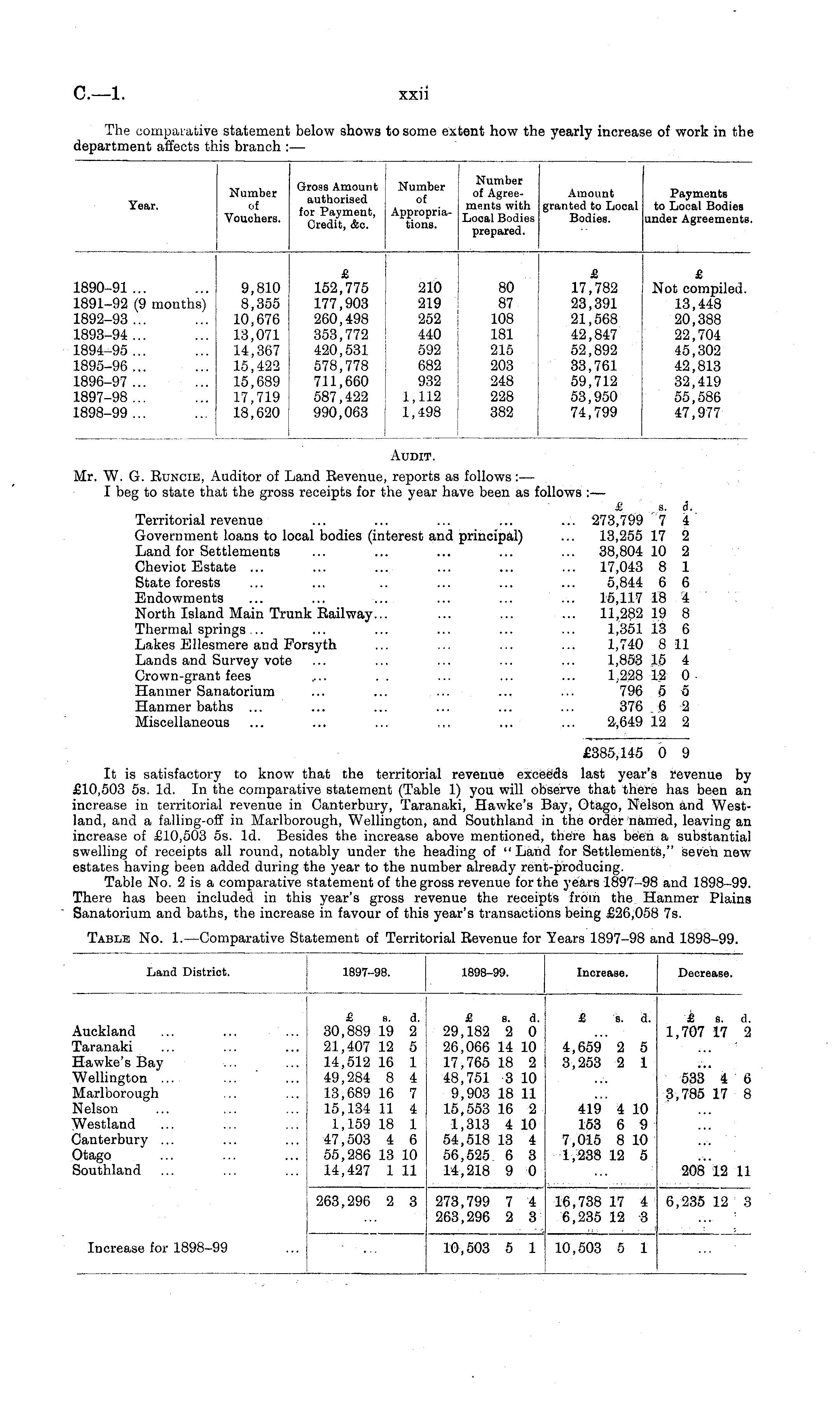Audit. Mr. W. G. Euncie, Auditor of Land Eevenue, reports as follows :— I beg to state that the gross receipts for the year have been as follows :— £ s. 6. Territorial revenue ... ... ... ... ... 273,799 7 4 Government loans to local bodies (interest and principal) ... 13,255 17 2 Land for Settlements ... ... ... ... ... 38,804 10 2 Cheviot Estate ... ... ... ... ... ... 17,043 8 1 State forests ... ... .. ... ... ... 5,844 6 6 Endowments ... ... ... ... ... ... 15,117 18 4 North Island Main Trunk Eailway... ... ... ... 11,282 19 8 Thermal springs... ... ... ... ... ... 1,35113 6 Lakes Ellesmere and Forsyth ... ... ... ... 1,740 8 11 Lands and Survey vote ... ... ... ... ... 1,853 15 4 Crown-grant fees .... ... ... ... ... 1,228 12 0 Hanmer Sanatorium ... ... ... ... ... 796 5 5 Hanmer baths ... ... ... ... ... ... 376 6 2 Miscellaneous ... ... ... ~. ... ... 2,649 12 2 £385,145 0 9 It is satisfactory to know that the territorial revenue exceeds last year's revenue by £10,503 ss. Id. In the comparative statement (Table 1) you will observe that there has been an increase in territorial revenue in Canterbury, Taranaki, Hawke's Bay, Otago, Nelson and Westland, and a falling-off in Marlborough, Wellington, and Southland in the order named, leaving an increase of £10,503 ss. Id. Besides the increase above mentioned, there has been a substantial swelling of receipts all round, notably under the heading of "Land for Settlements," seven new estates having been added during the year to the number already rent-producing. Table No. 2 is a comparative statement of the gross revenue for the years 1897-98 and 1898-99. There has been included in this year's gross revenue the receipts from the Hanmer Plains Sanatorium and baths, the increase in favour of this year's transactions being £26,058 7s.