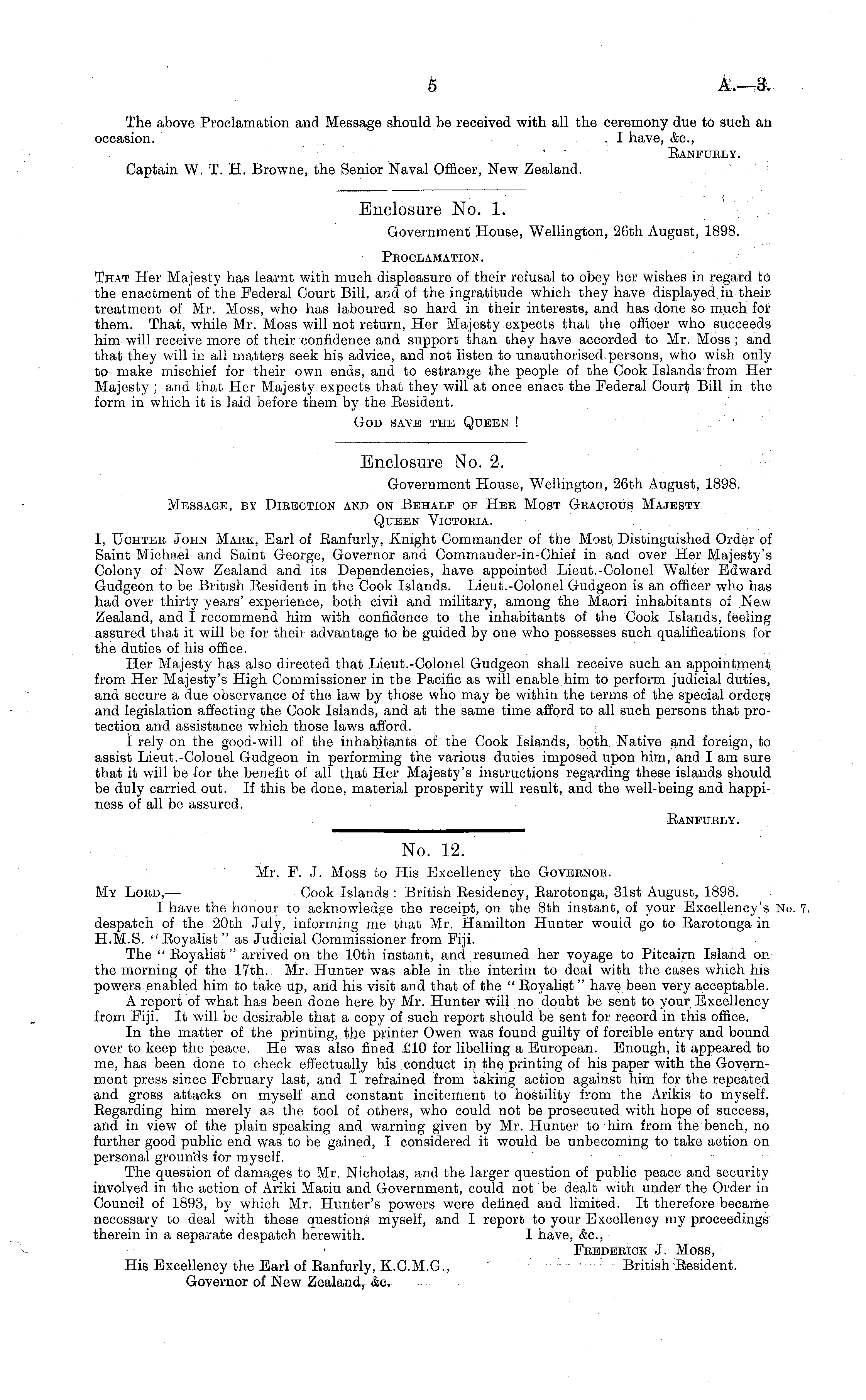 Enclosure No. 2. Government House, Wellington, 26th August, 1898. Message, by Dieection and on Behalf of Heb Most Gbacious Majesty Queen Victobia. I, Uchteb John Mabk, Earl of Eanfurly, flnight Commander of the Most Distinguished Order of Saint Michael and Saint George, Governor and Commander-in-Chief in and over Her Majesty's Colony of New Zealand and ios Dependencies, have appointed Lieut.-Colonel Walter Edward Gudgeon to be British Eesident in the Cook Islands. Lieut.-Colonel Gudgeon is an officer who has had over thirty years' experience, both civil and military, among the Maori inhabitants of New Zealand, and I recommend him with confidence to the inhabitants of the Cook Islands, feeling assured that it will be for their advantage to be guided by one who possesses such qualifications for the duties of his office. Her Majesty has also directed that Lieut.-Colonel Gudgeon shall receive such an appointment from Her Majesty's High Commissioner in the Pacific as will enable him to perform judicial duties, and secure a due observance of the law by those who may be within the terms of the special orders and legislation affecting the Cook Islands, and at the same time afford to all such persons that protection and assistance which those laws afford. I rely on the good-will of the inhabitants of the Cook Islands, both Native and foreign, to assist Lieut.-Colonel Gudgeon in performing the various duties imposed upon him, and I am sure that it will be for the benefit of all that Her Majesty's instructions regarding these islands should be duly carried out. If this be done, material prosperity will result, and the well-being and happiness of all be assured. Banfuely.