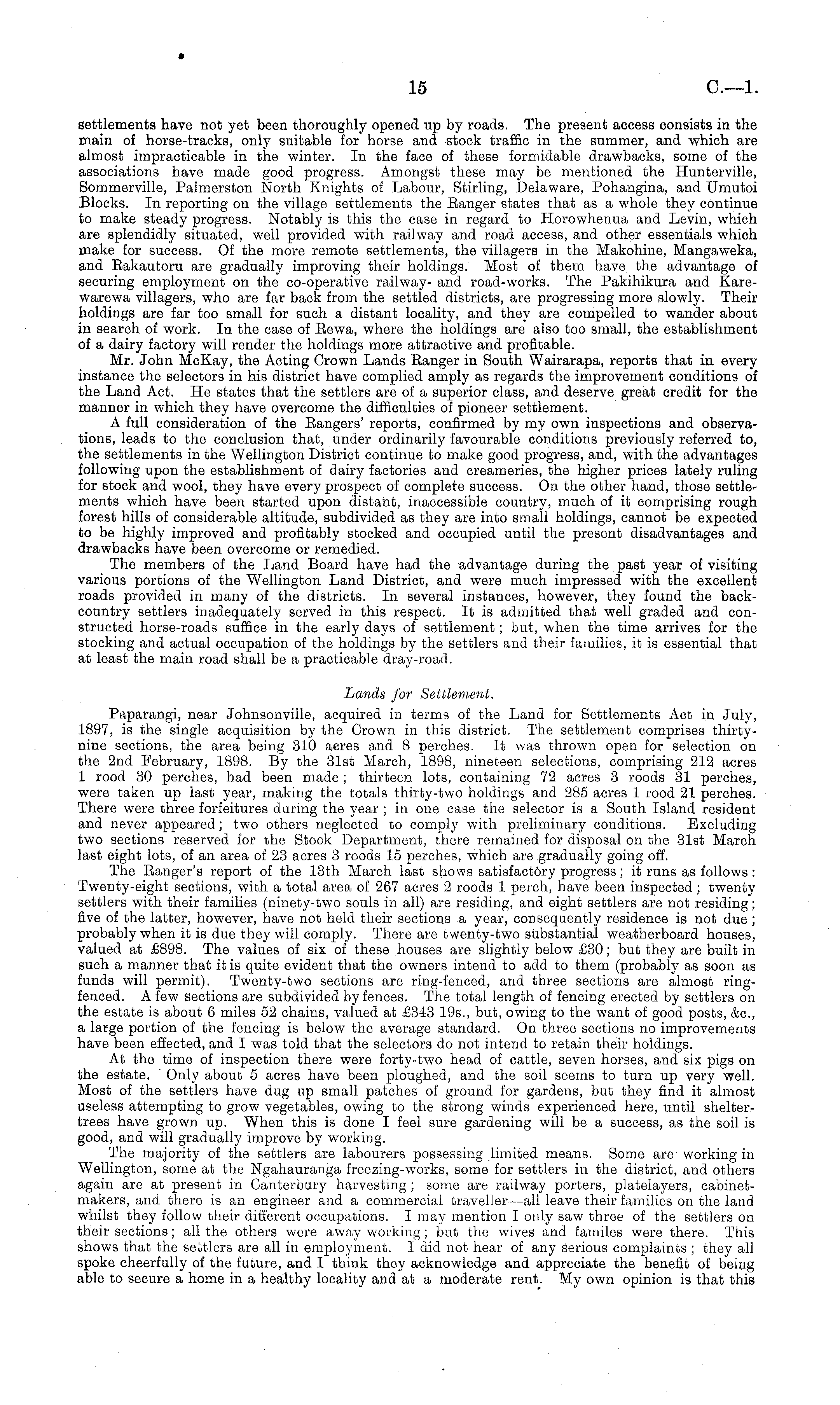 settlements have not yet been thoroughly opened up by roads. The present access consists in the main of horse-tracks, only suitable for horse and stock traffic in the summer, and which are almost impracticable in the winter. In the face of these formidable drawbacks, some of the associations have made good progress. Amongst these may be mentioned the Hunterville, Sommerville, Palmerston North Knights of Labour, Stirling, Delaware, Pohangina, and Umutoi Blocks. In reporting on the village settlements the Eanger states that as a whole they continue to make steady progress. Notably is this the case in regard to Horowhenua and Levin, which are splendidly situated, well provided with railway and road access, and other essentials which make for success. Of the more remote settlements, the villagers in the Makohine, Mangaweka, and Eakautoru are gradually improving their holdings. Most of them have the advantage of securing employment on the co-operative railway- and road-works. The Pakihikura and Karewarewa villagers, who are far back from the settled districts, are progressing more slowly. Their holdings are far too small for such a distant locality, and they are compelled to wander about in search of work. In the case of Eewa, where the holdings are also too small, the establishment of a dairy factory will render the holdings more attractive and profitable. Mr. John McKay, the Acting Crown Lands Ranger in South Wairarapa, reports that in every instance the selectors in his district have complied amply as regards the improvement conditions of the Land Act. He states that the settlers are of a superior class, and deserve great credit for the manner in which they have overcome the difficulties of pioneer settlement. A full consideration of the Rangers' reports, confirmed by my own inspections and observations, leads to the conclusion that, under ordinarily favourable conditions previously referred to, the settlements in the Wellington District continue to make good progress, and, with the advantages following upon the establishment of dairy factories and creameries, the higher prices lately ruling for stock and wool, they have every prospect of complete success. On the other hand, those settlements which have been started upon distant, inaccessible country, much of it comprising rough forest hills of considerable altitude, subdivided as they are into small holdings, cannot be expected to be highly improved and profitably stocked and occupied until the present disadvantages and drawbacks have been overcome or remedied. The members of the Land Board have had the advantage during the past year of visiting various portions of the Wellington Land District, and were much impressed with the excellent roads provided in many of the districts. In several instances, however, they found the backcountry settlers inadequately served in this respect. It is admitted that well graded and constructed horse-roads suffice in the early days of settlement; but, when the time arrives for the stocking and actual occupation of the holdings by the settlers and their families, it is essential that at least the main road shall be a practicable dray-road. Lands for Settlement. Paparangi, near Johnsonville, acquired in terms of the Land for Settlements Act in July, 1897, is the single acquisition by the Crown in this district. The settlement comprises thirtynine sections, the area being 310 acres and 8 perches. It was thrown open for selection on the 2nd February, 1898. By the 31st March, 1898, nineteen selections, comprising 212 acres 1 rood 30 perches, had been made; thirteen lots, containing 72 acres 3 roods 31 perches, were taken up last year, making the totals thirty-two holdings and 285 acres 1 rood 21 perches. There were three forfeitures during the year ; in one case the selector is a South Island resident and never appeared; two others neglected to comply with preliminary conditions. Excluding two sections reserved for the Stock Department, there remained for disposal on the 31st March last eight lots, of an area of 23 acres 3 roods 15 perches, which are .gradually going off. The Ranger's report of the 13th March last shows satisfact6ry progress; it runs as follows : Twenty-eight sections, with a total area of 267 acres 2 roods 1 perch, have been inspected ; twenty settlers with their families (ninety-two souls in all) are residing, and eight settlers are not residing; five of the latter, however, have not held their sections a year, consequently residence is not due ; probably when it is due they will comply. There are twenty-two substantial weatherboard houses, valued at £898. The values of six of these houses are slightly below £30; but they are built in such a manner that it is quite evident that the owners intend to add to them (probably as soon as funds will permit). Twenty-two sections are ring-fenced, and three sections are almost ringfenced. A few sections are subdivided by fences. The total length of fencing erected by settlers on the estate is about 6 miles 52 chains, valued at £343 195., but, owing to the want of good posts, &c, a large portion of the fencing is below the average standard. On three sections no improvements have been effected, and I was told that the selectors do not intend to retain their holdings. At the time of inspection there were forty-two head of cattle, seven horses, and six pigs on the estate. ' Only about 5 acres have been ploughed, and the soil seems to turn up very well. Most of the settlers have dug up small patches of ground for gardens, but they find it almost useless attempting to grow vegetables, owing to the strong winds experienced here, until sheltertrees have grown up. When this is done I feel sure gardening will be a success, as the soil is good, and will gradually improve by working. The majority of the settlers are labourers possessing limited means. Some are working in Wellington, some at the Ngahauranga freezing-works, some for settlers in the district, and ot
