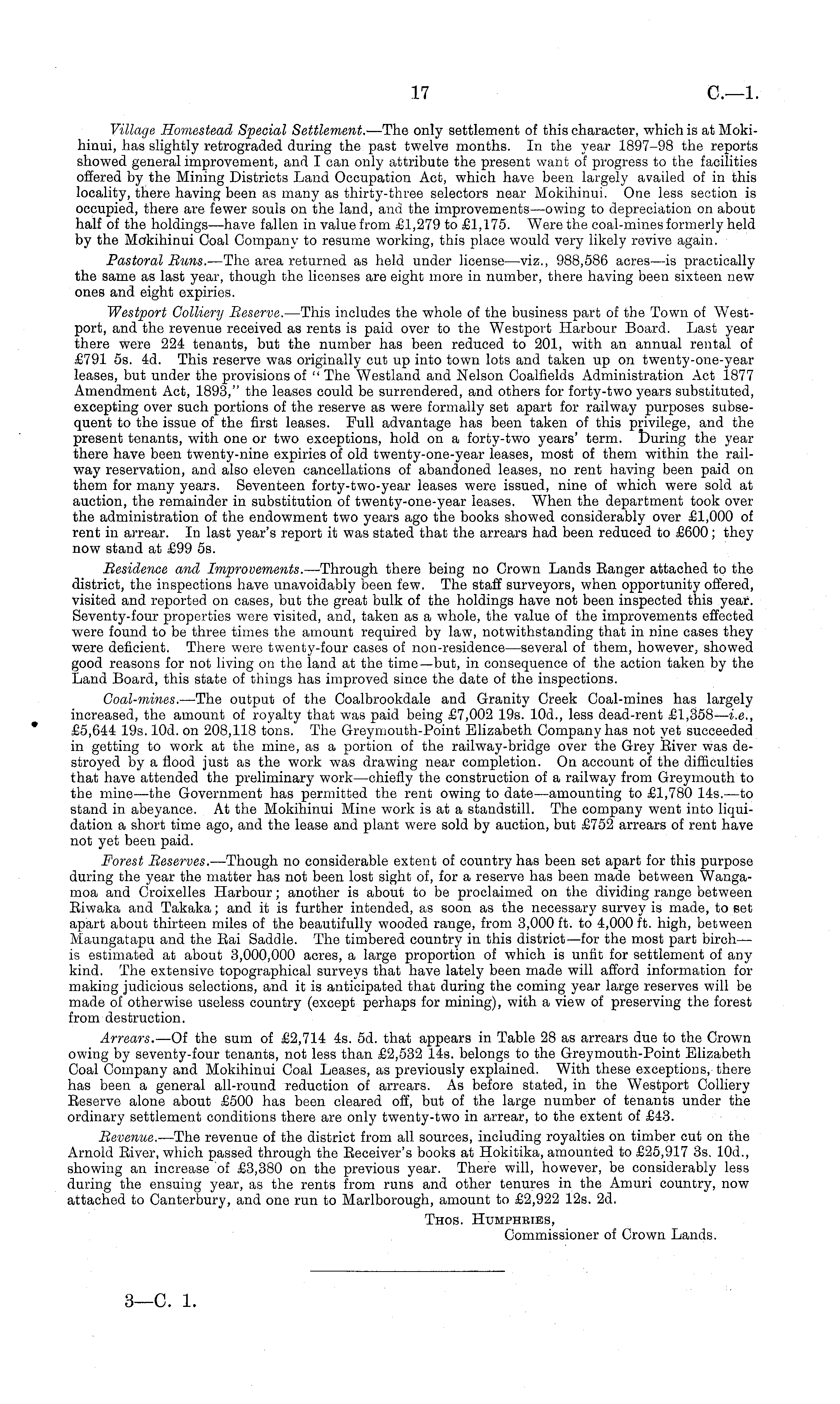 Village Homestead Special Settlement. —The only settlement of this character, which is at Mokihinui, has slightly retrograded during the past twelve months. In the year 1897-98 the reports showed general improvement, and I can only attribute the present want of progress to the facilities offered by the Mining Districts Land Occupation Act, which have been largely availed of in this locality, there having been as many as thirty-three selectors near Mokihinui. One less section is occupied, there are fewer souls on the land, and the improvements —owing to depreciation on about half of the holdings—have fallen in value from £1,279 to £1,175. Were the coal-mines formerly held by the Mokihinui Coal Company to resume working, this place would very likely revive again. Pastoral Runs. —The area returned as held under license —viz., 988,586 acres —is practically the same as last year, though the licenses are eight more in number, there having been sixteen new ones and eight expiries. Westport Colliery Reserve. —This includes the whole of the business part of the Town of Westport, and the revenue received as rents is paid over to the Westport Harbour Board. Last year there Were 224 tenants, but the number has been reduced to 201, with an annual rental of £791 ss. 4d. This reserve was originally cut up into town lots and taken up on twenty-one-year leases, but under the provisions of " The Westland and Nelson Coalfields Administration 3-ict 1877 Amendment Act, 1893," the leases could be surrendered, and others for forty-two years substituted, excepting over such portions of the reserve as were formally set apart for railway purposes subsequent to the issue of the first leases. Full advantage has been taken of this privilege, and the present tenants, with one or two exceptions, hold on a forty-two years' term. During the year there have been twenty-nine expiries of old twenty-one-year leases, most of them within the railway reservation, and also eleven cancellations of abandoned leases, no rent having been paid on them for many year 3. Seventeen forty-two-year leases were issued, nine of which were sold at auction, the remainder in substitution of twenty-one-year leases. When the department took over the administration of the endowment two years ago the books showed considerably over £1,000 of rent in arrear. In last year's report it was stated that the arrears had been reduced to £600; they now stand at £99 ss. Residence and Improvements. —Through there being no Crown Lands Ranger attached to the district, the inspections have unavoidably been few. The staff surveyors, when opportunity offered, visited and reported on cases, but the great bulk of the holdings have not been inspected this year. Seventy-four properties were visited, and, taken as a whole, the value of the improvements effected were found to be three times the amount required by law, notwithstanding that in nine cases they were deficient. There were twenty-four cases of non-residence —several of them, however, showed good reasons for not living on the land at the time—but, in consequence of the action taken by the Land Board, this state of things has improved since the date of the inspections. Coal-mines. —The output of the Coalbrookdale and Granity Creek Coal-mines has largely increased, the amount of royalty that was paid being £7,002 19s. 10d., less dead-rent £1,358 — i.e., £5,644 19s. lOd. on 208,118 tons. The Greymouth-Point Elizabeth Company has not yet succeeded in getting to work at the mine, as a portion of the railway-bridge over the Grey River was destroyed by a flood just as the work was drawing near completion. On account of the difficulties that have attended the preliminary work —chiefly the construction of a railway from Greymouth to the mine—the Government has permitted the rent owing to date —amounting to £1,780 14s.—to stand in abeyance. At the Mokihinui Mine work is at a standstill. The company went into liquidation a short time ago, and the lease and plant were sold by auction, but £752 arrears of rent have not yet been paid. Forest Reserves. —Though no considerable extent of country has been set apart for this purpose during the year the matter has not been lost sight of, for a reserve has been made between Wangamoa and Croixelles Harbour; another is about to be proclaimed on the dividing range between Eiwaka and Takaka; and it is further intended, as soon as the necessary survey is made, to set apart about thirteen miles of the beautifully wooded range, from 3,000 ft. to 4,000 ft. high, between Maungatapu and the Rai Saddle. The timbered country in this district —for the most part birch— is estimated at about 3,000,000 acres, a large proportion of which is unfit for settlement of any kind. The extensive topographical surveys that have lately been made will afford information for making judicious selections, and it is anticipated that during the coming year large reserves will be made of otherwise useless country (except perhaps for mining), with a view of preserving the forest from destruction. Arrears. —Of the sum of £2,714 4s. sd. that appears in Table 28 as arrears due to the Crown owing by seventy-four tenants, not less than £2,532 14s. belongs to the Greymouth-Point Elizabeth Coal Company and Mokihinui Coal Leases, as previously explained. With these exceptions, there has been a general all-round reduction of arrears. As before stated, in the Westport Colliery Reserve alone about £500 has been cleared off, but of the large number of tenants under the ordinary settlement conditions there are only twenty-two in arrear, to the extent of £43. Revenue. —The revenue of the district from all sources, including royalties on timber cut on the Arnold River, which passed through the Receiver's books at Hokitika, amounted to £25,917 3s. 10d., showing an increase of £3,380 on the previous year. There will, however, be considerably less during the ensuing year, as