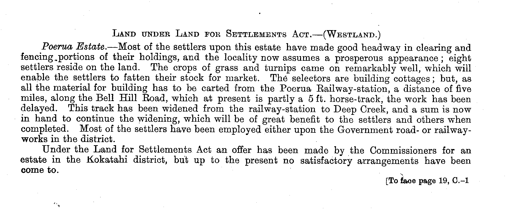 Land undee Land foe Settlements Act.—(Westland.) Poerua Estate. —Most of the settlers upon this estate have made good headway in clearing and fencing portions of their holdings, and the locality now assumes a prosperous appearance ; eight settlers reside on the land. The crops of grass and turnips came on remarkably well, which will enable the settlers to fatten their stock for market. The selectors are building cottages; but, as all the material for building has to be carted from the Poerua Eailway-station, a distance of five miles, along the Bell Hill Eoad, which at present is partly a 5 ft. horse-track, the work has been delayed. This track has been widened from the railway-station to Deep Creek, and a sum is now in hand to continue the widening, which will be of great benefit to the settlers and others when completed. Most of the settlers have been employed either upon the Government road- or railwayworks in the district. Under the Land for Settlements Act an offer has been made by the Commissioners for an estate in the Kokatahi district, but up to the present no satisfactory arrangements have been come to. [To faoe page 19, G.-l