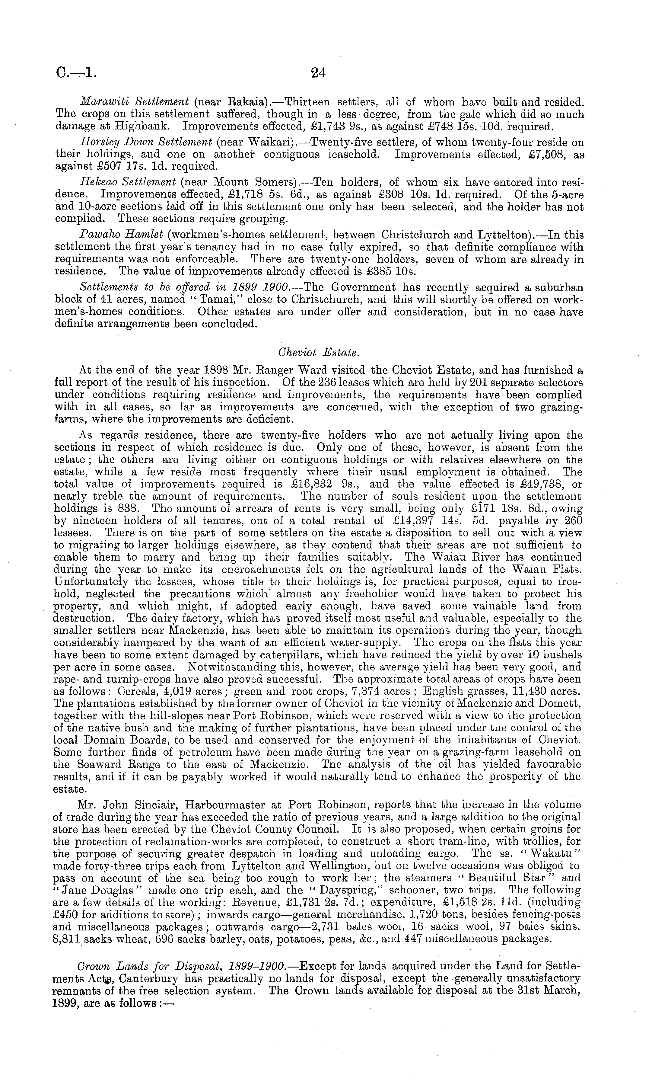 Marawiti Settlement (near Eakaia). —Thirteen settlers, all of whom have built and resided. The crops on this settlement suffered, though in a less-degree, from the gale which did so much damage at Highbank. Improvements effected, £1,743 95., as against £748 15s. lOd. required. Horsley Down Settlement (near Waikari). —Twenty-five settlers, of whom twenty-four reside on their holdings, and one on another contiguous leasehold. Improvements effected, £7,508, as against £507 17s. Id. required. Hekeao Settlement (near Mount Somers). —Ten holders, of whom six have entered into residence. Improvements effected, £1,718 ss. 6d., as against £308 10s. Id. required. Of the 5-acre and 10-acre sections laid off in this settlement one only has been selected, and the holder has not complied. These sections require grouping. Pawaho Hamlet (workmen's-homes settlement, between Christchurch and Lyttelton).—ln this settlement the first year's tenancy had in no case fully expired, so that definite compliance with requirements was not enforceable. There are twenty-one holders, seven of whom are already in residence. The value of improvements already effected is £385 10s. Settlements to be offered in 1899-1900. —The Government has recently acquired a suburban block of 41 acres, named " Tamai," close to Christchurch, and this will shortly be offered on work-men's-homes conditions. Other estates are under offer and consideration, but in no case have definite arrangements been concluded. Cheviot Estate. At the end of the year 1898 Mr. Eanger Ward visited the Cheviot Estate, and has furnished a full report of the result of his inspection. Of the 236 leases which are held by 201 separate selectors under conditions requiring residence and improvements, the requirements have been complied with in all cases, so far as improvements are concerned, with the exception of two grazingfarms, where the improvements are deficient. As regards residence, there are twenty-five holders who are not actually living upon the sections in respect of which residence is due. Only one of these, however, is absent from the estate ; the others are living either on contiguous holdings or with relatives elsewhere on the estate, while a few reside most frequently where their usual employment is obtained. The total value of improvements required is £16,832 95., and the value effected is £49,738, or nearly treble the amount of requirements. The number of souls resident upon the settlement holdings is 838. The amount of arrears of rents is very small, being only £171 18s. Bd., owing by nineteen holders of all tenures, out of a total rental of £14,397 14s. od. payable by 260 lessees. There is on the part of some settlers on the estate a disposition to sell out with a view to migrating to larger holdings elsewhere, as they contend that their areas are not sufficient to enable them to marry and bring up their families suitably. The Waiau River has continued during the year to make its encroachments felt on the agricultural lands of the Waiau Flats. Unfortunately the lessees, whose title to their holdings is, for practical purposes, equal to freehold, neglected the precautions which almost any freeholder would have taken to protect his property, and which might, if adopted early enough, have saved some valuable land from destruction. The dairy factory, which has proved itself most useful and valuable, especially to the smaller settlers near Mackenzie, has been able to maintain its operations during the year, though considerably hampered by the want of an efficient water-supply. The crops on the flats this year have been to some extent damaged by caterpillars, which have reduced the yield by over 10 bushels per acre in some cases. Notwithstanding this, however, the average yield has been very good, and rape- and turnip-crops have also proved successful. The approximate total areas of crops have been as follows : Cereals, 4,019 acres; green and root crops, 7,374 acres ; English grasses, 11,430 acres. The plantations established by the former owner of Cheviot in the vicinity of Mackenzie and Domett, together with the hill-slopes near Port Robinson, which were reserved with a view to the protection of the native bush and the making of further plantations, have been placed under the control of the local Domain Boards, to be used and conserved for the enjoyment of the inhabitants of Cheviot. Some further finds of petroleum have been made during the year on a grazing-farm leasehold on the Seaward Bange to the east of Mackenzie. The analysis of the oil has yielded favourable results, and if it can be payably worked it would naturally tend to enhance the prosperity of the estate. Mr. John Sinclair, Harbourmaster at Port Eobinson, reports that the increase in the volume of trade during the year has exceeded the ratio of previous years, and a large addition to the original store has been erected by the Cheviot County Council. It is also proposed, when certain groins for the protection of reclamation-works are completed, to construct a short tram-line, with trollies, for the purpose of securing greater despatch in loading and unloading cargo. The ss. " Wakatu " made forty-three trips each from Lyttelton and Wellington, but on twelve occasions was obliged to pass on account of the sea being too rough to work her ; the steamers " Beautiful Star " and "Jane Douglas" made one trip each, and the " Dayspring," schooner, two trips. The following are a few details of the working: Eevenue, £1,731 2s. 7d.; expenditure, £1,518 2s. lid. (including £450 for additions to store) ; inwards cargo —general merchandise, 1,720 tons, besides fencing-posts and miscellaneous packages ; outwards cargo —2,731 bales wool, 16 sacks wool, 97 bales skins, 8,811 sacks wheat, 696 sacks barley, oats, potatoes, peas, &c.,and 447 miscellaneous packages. Crown Lands for Disposal, 1899-1900. —Except for lands acquired under the Land for Settlements Actg, Canterbury has 