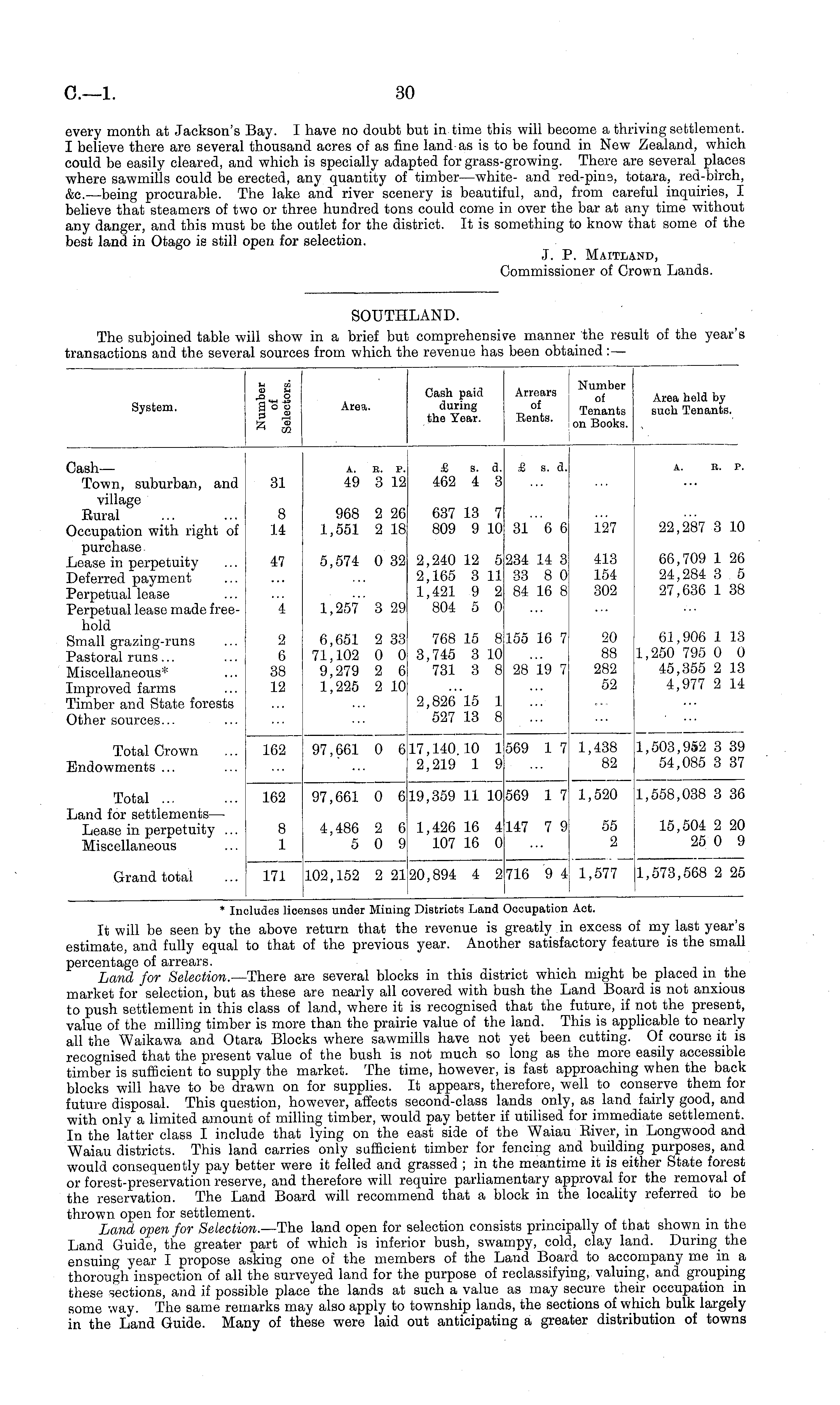 every month at Jackson's Bay. I have no doubt but in time this will become a thriving settlement. I believe there are several thousand acres of as fine land-as is to be found in New Zealand, which could be easily cleared, and which is specially adapted for grass-growing. There are places where sawmills could be erected, any quantity of timber —white- and red-pins, totara, red-birch, &, c , —being procurable. The lake and river scenery is beautiful, and, from careful inquiries, I believe that steamers of two or three hundred tons could come in over the bar at any time without any danger, and this must be the outlet for the district. It is something to know that some of the best land in Otago is still open for selection. J. P. Maitland, Commissioner of Crown Lands.