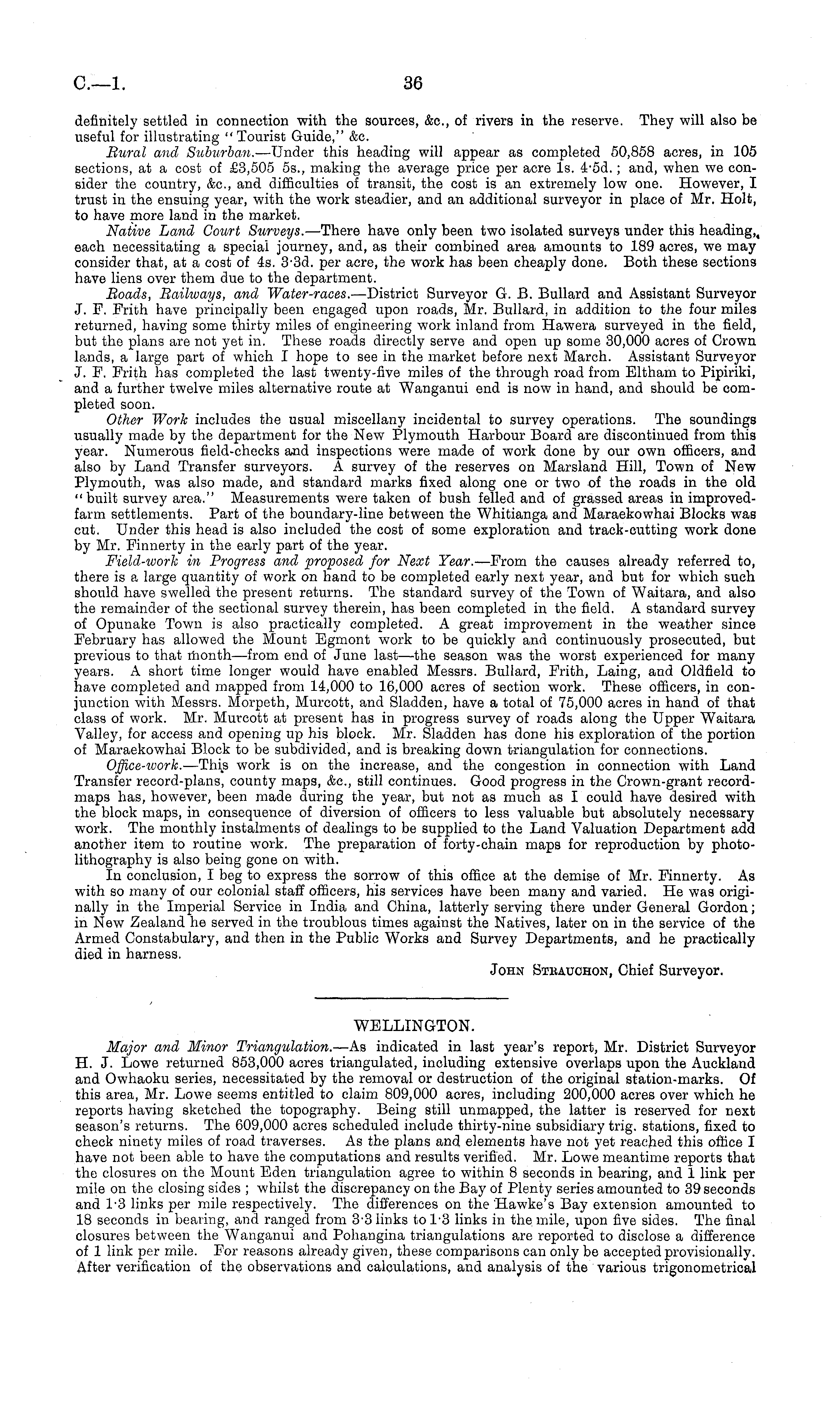 definitely settled in connection with the sources, &c, of rivers in the reserve. They will also be useful for illustrating " Tourist Guide," &c. Rural and Suburban.- —Under this heading will appear as completed 50,858 acres, in 105 sections, at a cost of £3,505 55., making the average price per acre Is. 4-5 d.; and, when we consider the country, &c, and difficulties of transit, the cost is an extremely low one. However, I trust in the ensuing year, with the work steadier, and an additional surveyor in place of Mr. Holt, to have more land in the market. Native Land Court Surveys. —There have only been two isolated surveys under this heading,, each necessitating a special journey, and, as their combined area amounts to 189 acres, we may consider that, at a cost of 4s. 3'3d. per acre, the work has been cheaply done. Both these sections have liens over them due to the department. Roads, Railways, and Water-races. —District Surveyor G. B. Bullard and Assistant Surveyor J. F. Frith have principally been engaged upon roads, Mr. Bullard, in addition to the four miles returned, having some thirty miles of engineering work inland from Hawera surveyed in the field, but the plans are not yet in. These roads directly serve and open up some 30,000 acres of Crown lands, a large part of which I hope to see in the market before next March. Assistant Surveyor J. F. Frith has completed the last twenty-five miles of the through road from Eltham to Pipiriki, and a further twelve miles alternative route at Wanganui end is now in hand, and should be completed soon. Other Work includes the usual miscellany incidental to survey operations. The soundings usually made by the department for the New Plymouth Harbour Board are discontinued from this year. Numerous field-checks and inspections were made of work done by our own officers, and also by Land Transfer surveyors. A survey of the reserves on Marsland Hill, Town of New Plymouth, was also made, and standard marks fixed along one or two of the roads in the old "built survey area." Measurements were taken of bush felled and of grassed areas in improvedfarm settlements. Part of the boundary-line between the Whitianga and Maraekowhai Blocks was cut. Under this head is also included the cost of some exploration and track-cutting work done by Mr. Finnerty in the early part of the year. Field-work in Progress and proposed for Next Year. —From the causes already referred to, there is a large quantity of work on hand to be completed early next year, and but for which such should have swelled the present returns. The standard survey of the Town of Waitara, and also the remainder of the sectional survey therein, has been, completed in the field. A standard survey of Opunake Town is also practically completed. A great improvement in the weather since February has allowed the Mount Egmont work to be quickly and continuously prosecuted, but previous to that month —from end of June last—the season was the worst experienced for many years. A short time longer would have enabled Messrs. Bullard, Frith, Laing, and Oldfield to have completed and mapped from 14,000 to 16,000 acres of section work. These officers, in conjunction with Messrs. Morpeth, Murcott, and Sladden, have a total of 75,000 acres in hand of that class of work. Mr. Murcott at present has in progress survey of roads along the Upper Waitara Valley, for access and opening up his block. Mr. Sladden has done his exploration of the portion of Maraekowhai Block to be subdivided, and is breaking down triangulation for connections. Office-work. —This work is on the increase, and the congestion in connection with Land Transfer record-plans, county maps, &c, still continues. Good progress in the Crown-grant recordmaps has, however, been made during the year, but not as much as I could have desired with the block maps, in consequence of diversion of officers to less valuable but absolutely necessary work. The monthly instalments of dealings to be supplied to the Land Valuation Department add another item to routine work. The preparation of forty-chain maps for reproduction by photolithography is also being gone on with. In conclusion, I beg to express the sorrow of this office at the demise of Mr. Finnerty. As with so many of our colonial staff officers, his services have been many and varied. He was originally in the Imperial Service in India and China, latterly serving there under General Gordon; in New Zealand he served in the troublous times against the Natives, later on in the service of the Armed Constabulary, and then in the Public Works and Survey Departments, and he practically died in harness. John Steauchon, Chief Surveyor.
