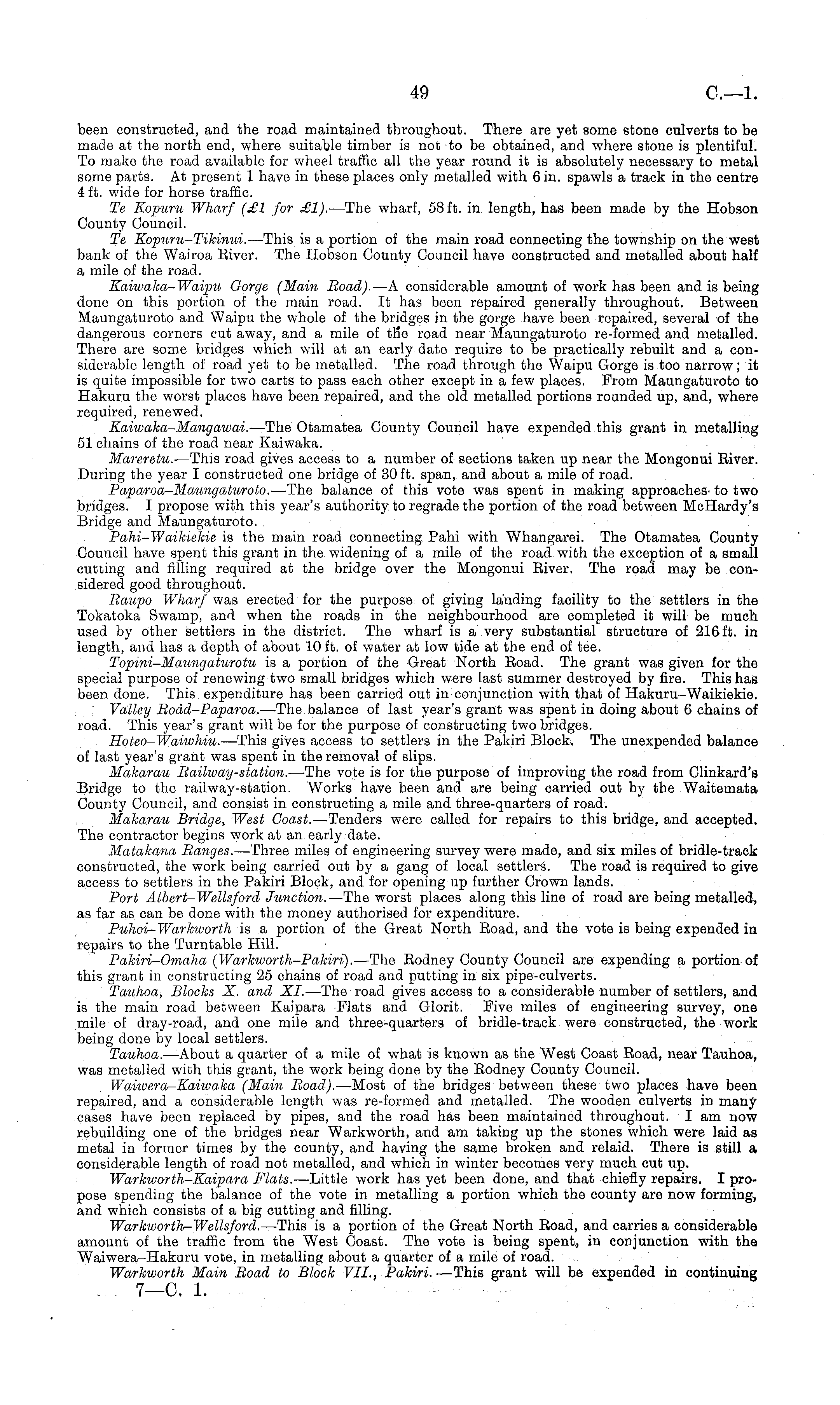 been constructed, and the road maintained throughout. There are yet some stone culverts to be made at the north end, where suitable timber is not to be obtained, and where stone is plentiful. To make the road available for wheel traffic all the year round it is absolutely necessary to metal some parts. At present 1 have in these places only metalled with 6 in. spawls a track in the centre 4 ft. wide for horse traffic. Te Kopuru Wharf (£1 for £1). —The wharf, 58 ft. in length, has been made by the Hobson County Council. Te Kopuru-Tikinui. —This is a portion of the main road connecting the township on the west bank of the Wairoa Eiver. The Hobson County Council have constructed and metalled about half a mile of the road. Kaiwaka-Waipu Gorge (Main Road). —A considerable amount of work has been and is being done on this portion of the main road. It has been repaired generally throughout. Between Maungaturoto and Waipu the whole of the bridges in the gorge have been repaired, several of the dangerous corners cut away, and a mile of tlie road near Maungaturoto re-formed and metalled. There are some bridges which will at an early date require to be practically rebuilt and a considerable length of road yet to be metalled. The road through the Waipu Gorge is too narrow; it is quite impossible for two carts to pass each other except in a few places. From Maungaturoto to Hakuru the worst places have been repaired, and the old metalled portions rounded up, and, where required, renewed. Kaiivaka-Mangawai. —The Otamatea County Council have expended this grant in metalling 51 chains of the road near Kaiwaka. Mareretu. —This road gives access to a number of sections taken up near the Mongonui Eiver. During the year I constructed one bridge of 30 ft. span, and about a mile of road. Paparoa-Maungaturoto. —The balance of this vote was spent in making approaches to two bridges. I propose with this year's authority to regrade the portion of the road between McHardy's Bridge and Maungaturoto. Pahi-Waikiekie is the main road connecting Pahi with Whangarei. The Otamatea County Council have spent this grant in the widening of a mile of the road with the exception of a small cutting and filling required at the bridge over the Mongonui Eiver. The road may be considered good throughout. Raupo Wharf was erected for the purpose of giving landing facility to the settlers in the Tokatoka Swamp, and when the roads in the neighbourhood are completed it will be much used by other settlers in the district. The wharf is a very substantial structure of 216 ft. in length, and has a depth of about 10 ft. of water at low tide at the end of tee. Topini-Maungaturotu is a portion of the Great North Eoad. The grant was given for the special purpose of renewing two small bridges which were last summer destroyed by fire. This has been done. This expenditure has been carried out in conjunction with that of Hakuru-Waikiekie. Valley Rodd-Paparoa. —The balance of last year's grant was spent in doing about 6 chains of road. This year's grant will be for the purpose of constructing two bridges. Hoteo-Waiwhiu. —This gives access to settlers in the Pakiri Block. The unexpended balance of last year's grant was spent in the removal of slips. Makarau Railway-station. —The vote is for the purpose of improving the road from Clinkard's Bridge to the railway-station. Works have been and are being carried out by the Waitemata County Council, and consist in constructing a mile and three-quarters of road. Makarau Bridge, West Coast. —Tenders were called for repairs to this bridge, and accepted. The contractor begins work at an early date. Matakana Ranges. —Three miles of engineering survey were made, and six miles of bridle-track constructed, the work being carried out by a gang of local settlers. The road is required to give access to settlers in the Pakiri Block, and for opening up further Crown lands. Port Albert-Wellsford Junction. —The worst places along this line of road are being metalled, as far as can be done with the money authorised for expenditure. Puhoi-Warkworth is a portion of the Great North Eoad, and the vote is being expended in repairs to the Turntable Hill. Pakiri-Omaha (Warkworth-Pakiri). —The Eodney County Council are expending a portion of this grant in constructing 25 chains of road and putting in six pipe-culverts. Tauhoa, Blocks X. and Xl. —The road gives access to a considerable number of settlers, and is the main road between Kaipara Flats and Glorit. Five miles of engineering survey, one mile of dray-road, and one mile and three-quarters of bridle-track were constructed, the work being done by local settlers. Tauhoa. —About a quarter of a mile of what is known as the West Coast Boad, near Tauhoa, was metalled with this grant, the work being done by the Eodney County Council. Waiivera-Kaiwaka (Main Road). —Most of the bridges between these two places have been repaired, and a considerable length was re-formed and metalled. The wooden culverts in many cases have been replaced by pipes, and the road has been maintained throughout. I am now rebuilding one of the bridges near Warkworth, and am taking up the stones which were laid as metal in former times by the county, and having the same broken and relaid. There is still a considerable length of road not metalled, and which in winter becomes very much cut up. Warkworth-Kaipara Flats. —Little work has yet been done, and that chiefly repairs. I propose spending the balance of the vote in metalling a portion which the county are now forming, and which consists of a big cutting and filling. Warkworth-Wellsford. —This is a portion of the Great North Eoad, and carries a considerable amount of the traffic from the West Coast. The vote is being spent, in conjunction with the Waiwera-Hakuru vote, in metalling about a quarter of a mile of road. Warkworth Main Road to Block VII., Pakiri. —This grant will be expended in continuing 7—C. 1.