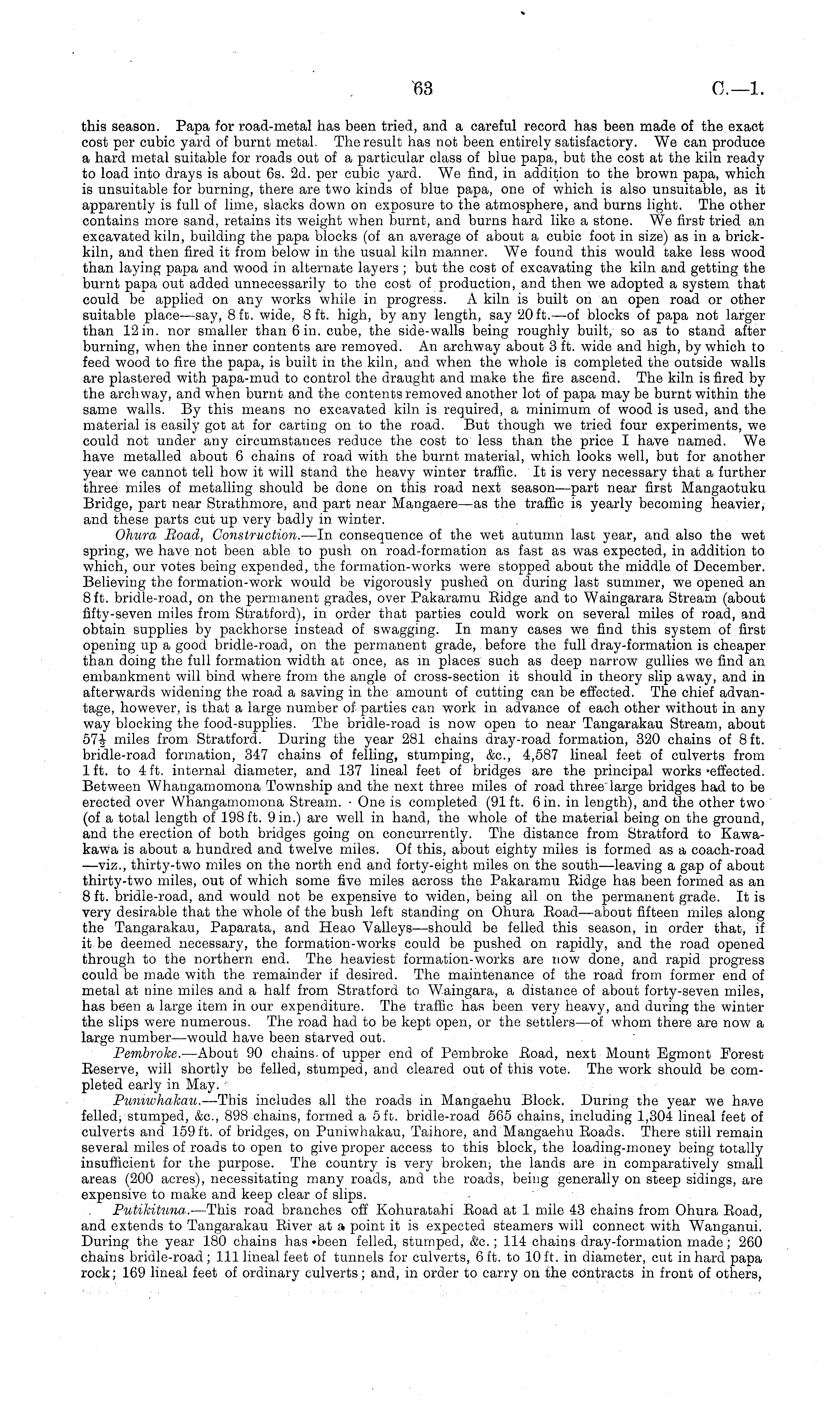 this season. Papa for road-metal has been tried, and a careful record has been made of the exact cost per cubic yard of burnt metal. The result has not been entirely satisfactory. We can produce a hard metal suitable for roads out of a particular class of blue papa, but the cost at the kiln ready to load into drays is about 6s. 2d. per cubic yard. We find, in addition to the brown papa, which is unsuitable for burning, there are two kinds of blue papa, one of which is also unsuitable, as it apparently is full of lime, slacks down on exposure to the atmosphere, and burns light. The other contains more sand, retains its weight when burnt, and burns hard like a stone. We first tried an excavated kiln, building the papa blocks (of an average of about a cubic foot in size) as in a brickkiln, and then fired it from below in the usual kiln manner. We found this would take less wood than laying papa and wood in alternate layers ; but the cost of excavating the kiln and getting the burnt papa out added unnecessarily to the cost of production, and then we adopted a system that could be applied on any works while in progress. A kiln is built on an open road or other suitable place —say, 8 ft. wide, 8 ft. high, by any length, say '20 ft.—of blocks of papa not larger than 12 in. nor smaller than 6 in. cube, the side-walls being roughly built, so as to stand after burning, when the inner contents are removed. An archway about 3 ft. wide and high, by which to feed wood to fire the papa, is built in the kiln, and when the whole is completed the outside walls are plastered with papa-mud to control the draught and make the fire ascend. The kiln is fired by the archway, and when burnt and the contents removed another lot of papa may be burnt within the same walls. By this means no excavated kiln is required, a minimum of wood is used, and the material is easily got at for carting on to the road. But though we tried four experiments, we could not under any circumstances reduce the cost to less than the price I have named. We have metalled about 6 chains of road with the burnt material, which looks well, but for another year we cannot tell how it will stand the heavy winter traffic. It is very necessary that a further three miles of metalling should be done on this road next season —part near first Mangaotuku Bridge, part near Strathmore, and part near Mangaere —as the traffic is yearly becoming heavier, and these parts cut up very badly in winter. Ohura Boad, Construction. —ln consequence of the wet autumn last year, and also the wet spring, we have not been able to push on road-formation as fast as was expected, in addition to which, our votes being expended, the formation-works were stopped about the middle of December. Believing the formation-work would be vigorously pushed on during last summer, we opened an 8 ft. bridle-road, on the permanent grades, over Pakaramu Bidge and to Waingarara Stream (about fifty-seven miles from Stratford), in order that parties could work on several miles of road, and obtain supplies by packhorse instead of swagging. In many cases we find this system of first opening up a good bridle-road, on the permanent grade, before the full dray-formation is cheaper than doing the full formation width at once, as m places such as deep narrow gullies we find an embankment will bind where from the angle of cross-section it should in theory slip away, and in afterwards widening the road a saving in the amount of cutting can be effected. The chief advantage, however, is that a large number of parties can work in advance of each other without in any way blocking the food-supplies. The bridle-road is now open to near Tangarakau Stream, about 57-J miles from Stratford. During the year 281 chains dray-road formation, 320 chains of 8 ft. bridle-road formation, 347 chains of felling, stumping, &c, 4,587 lineal feet of culverts from 1 ft. to 4 ft. internal diameter, and 137 lineal feet of bridges are the principal works effected. Between Whangamomona Township and the next three miles of road three"large bridges had to be erected over Whangamomona Stream. ■ One is completed (91ft. 6 in. in length), and the other two (of a total length of 198 ft. 9 in.) are well in hand, the whole of the material being on the ground, and the erection of both bridges going on concurrently. The distance from Stratford to Kawakawa is about a hundred and twelve miles. Of this, about eighty miles is formed as a coach-road —viz., thirty-two miles on the north end and forty-eight miles on the south—leaving a gap of about thirty-two miles, out of which some five miles across the Pakaramu Eidge has been formed as an 8 ft. bridle-road, and would not be expensive to widen, being all on the permanent grade. It is very desirable that the whole of the bush left standing on Ohura Road—about fifteen miles along the Tangarakau, Paparata, and Heao Valleys—should be felled this season, in order that, if it be deemed necessary, the formation-works could be pushed on rapidly, and the road opened through to the northern end. The heaviest formation-works are now done, and rapid progress could be made with the remainder if desired. The maintenance of the road from former end of metal at nine miles and a half from Stratford to Waingara, a distance of about forty-seven miles, has been a large item in our expenditure. The traffic has been very heavy, and during the winter the slips were numerous. The road had to be kept open, or the settlers—of whom there are now a large number—would have been starved out. Pembroke. —About 90 chains, of upper end of Pembroke Eoad, next Mount Bgmont Forest Eeserve, will shortly be felled, stumped, and cleared out of this vote. The work should be completed early in May. Puniwhakau. —This includes all the roads in Mangaehu Block. During the year we have felled, stumped, &c, 898 chains, formed a 5 ft. bridle-road 565 chains, including 1,304 lineal feet of culverts and 159 ft. of brid