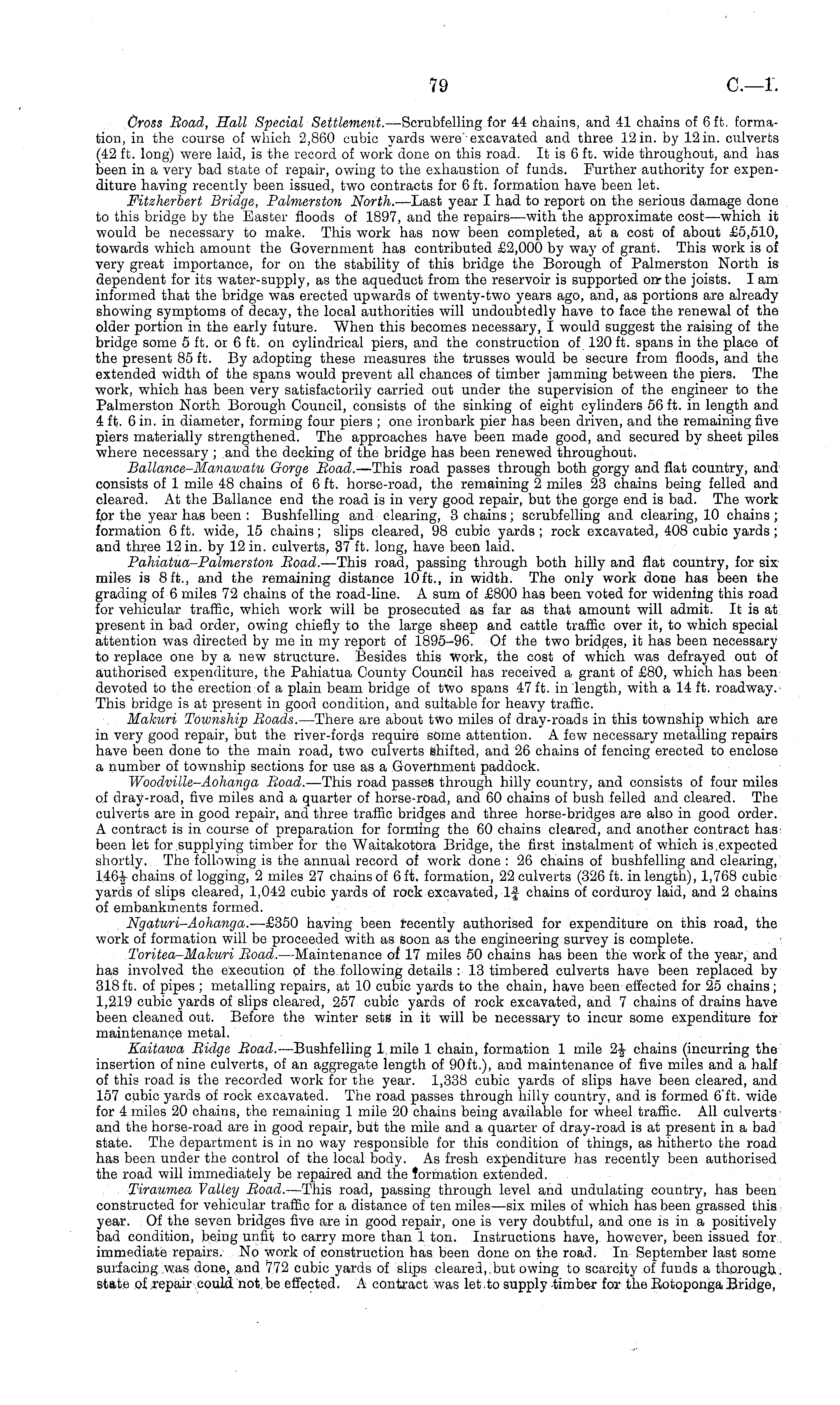 Cross Road, Hall Special Settlement. —Scrubfelling for 44 chains, and 41 chains of 6 ft. formation, in the course of which 2,860 cubic yards were excavated and three 12 in. by 12 in. culverts (42 ft. long) were laid, is the record of work done on this road. It is 6 ft. wide throughout, and has been in a very bad state of repair, owing to the exhaustion of funds. Further authority for expenditure having recently been issued, two contracts for 6 ft. formation have been let. Fitzherbert Bridge, Palmerston North. —Last year I had to report on the serious damage done to this bridge by the Easter floods of 1897, and the repairs—with the approximate cost —which it would be necessary to make. This work has now been completed, at a cost of about £5,510, towards which amount the Government has contributed £2,000 by way of grant. This work is of very great importance, for on the stability of this bridge the Borough of Palmerston North is dependent for its water-supply, as the aqueduct from the reservoir is supported on the joists. lam informed that the bridge was erected upwards of twenty-two years ago, and, as portions are already showing symptoms of decay, the local authorities will undoubtedly have to face the renewal of the older portion in the early future. When this becomes necessary, I would suggest the raising of the bridge some 5 ft. or 6 ft. on cylindrical piers, and the construction of 120 ft. spans in the place of the present 85 ft. By adopting these measures the trusses would be secure from floods, and the extended width of the spans would prevent all chances of timber jamming between the piers. The work, which has been very satisfactorily carried out under the supervision of the engineer to the Palmerston North Borough Council, consists of the sinking of eight cylinders 56 ft. in length and 4 ft. 6 in. in diameter, forming four piers ; one ironbark pier has been driven, and the remaining five piers materially strengthened. The approaches have been made good, and secured by sheet piles where necessary ; and the decking of the bridge has been renewed throughout. Ballance-Manawatu Gorge Road. —This road passes through both gorgy and flat country, and consists of 1 mile 48 chains of 6 ft. horse-road, the remaining 2 miles 23 chains being felled and cleared. At the Ballance end the road is in very good repair, but the gorge end is bad. The work for the year has been : Bushfelling and clearing, 3 chains ; scrubfelling and clearing, 10 chains ; formation 6 ft. wide, 15 chains; slips cleared, 98 cubic yards; rock excavated, 408 cubic yards; and three 12 in. by 12 in. culverts, 37 ft. long, have been laid. Pahiatua-Paimerston Road. —This road, passing through both hilly and flat country, for six miles is 8 ft., and the remaining distance 10 ft., in width. The only work done has been the grading of 6 miles 72 chains of the road-line. A sum of £800 has been voted for widening this road for vehicular traffic, which work will be prosecuted as far as that amount will admit. It is at present in bad order, owing chiefly to the large sheep and cattle traffic over it, to which special attention was directed by me in my report of 1895-96. Of the two bridges, it has been necessary to replace one by a new structure. Besides this work, the cost of which was defrayed out of authorised expenditure, the Pahiatua County Council has received a grant of £80, which has been devoted to the erection of a plain beam bridge of two spans 47 ft. in length, with a 14 ft. roadway. This bridge is at present in good condition, and suitable for heavy traffic. Makuri Township Roads. —There are about two miles of dray-roads in this township which are in very good repair, but the river-fords require some attention. A few necessary metalling repairs have been done to the main road, two culverts shifted, and 26 chains of fencing erected to enclose a number of township sections for use as a Government paddock. Woodville-Aohanga Road. —This road passes through hilly country, and consists of four miles of dray-road, five miles and a quarter of horse-road, and 60 chains of bush felled and cleared. The culverts are in good repair, and three traffic bridges and three horse-bridges are also in good order. A contract is in course of preparation for forming the 60 chains cleared, and another contract has been let for supplying timber for the Waitakotora Bridge, the first instalment of which is .expected shortly. The following is the annual record of work done : 26 chains of bushfelling and clearing, 146f chains of logging, 2 miles 27 chains of 6 ft. formation, 22 culverts (326 ft. in length), 1,768 cubic yards of slips cleared, 1,042 cubic yards of rock excavated, If chains of corduroy laid, and 2 chains of embankments formed. Ngaturi-Aohanga. —£3so having been recently authorised for expenditure on this road, the work of formation will be proceeded with as soon as the engineering survey is complete. Toritea-Makuri Road. —Maintenance of 17 miles 50 chains has been the work of the year, and has involved the execution of the following details : 13 timbered culverts have been replaced by 318 ft. of pipes ; metalling repairs, at 10 cubic yards to the chain, have been effected for 25 chains; 1,219 cubic yards of slips cleared, 257 cubic yards of rock excavated, and 7 chains of drains have been cleaned out. Before the winter sets in it will be necessary to incur some expenditure for maintenance metal. Kaitawa Ridge Road. —Bushfelling 1 mile 1 chain, formation 1 mile 2f chains (incurring the insertion of nine culverts, of an aggregate length of 90ft.), and maintenance of five miles and a half of this road is the recorded work for the year. 1,338 cubic yards of slips have been cleared, and 157 cubic yards of rock excavated. The road passes through hilly country, and is formed 6 ft. wide for 4 miles 20 chains, the remaining 1 mile 20 chains being available for wheel traffic. All culverts and the horse-road are in good r
