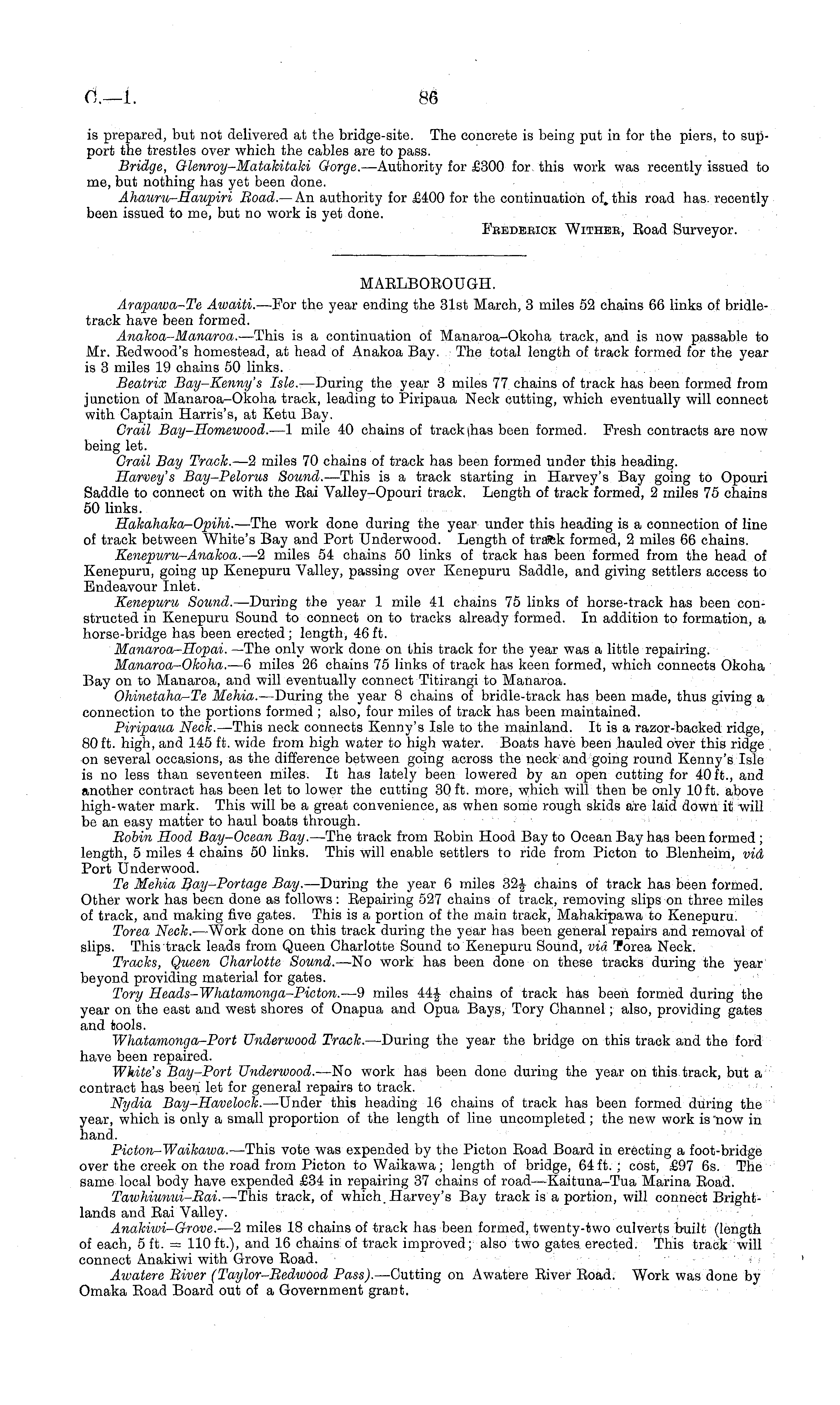 MAELBOEOUGH. Arapawa-Te Awaiti. —For the year ending the 31st March, 3 miles 52 chains 66 links of bridletrack have been formed. Anakoa-Manaroa. —This is a continuation of Manaroa-Okoha track, and is now passable to Mr. Eedwood's homestead, at head of Anakoa Bay. The total length of track formed for the year is 3 miles 19 chains 50 links. Beatrix Bay-Kenny's Isle. —During the yea,r 3 miles 77 chains of track has been formed from junction of Manaroa-Okoha track, leading to Piripaua Neck cutting, which eventually will connect with Captain Harris's, at Ketu Bay. Grail Bay-Homewood. —l mile 40 chains of track (has been formed. Fresh contracts are now being let. Crail Bay Track. —2 miles 70 chains of track has been formed under this heading. Harmy's Bay-Pelorus Sound. —This is a track starting in Harvey's Bay going to Opouri Saddle to connect on with the Eai Valley-Opouri track. Length of track formed, 2 miles 75 chains 50 links. Hakahaka-Opihi. —-The work done during the year under this heading is a connection of line of track between White's Bay and Port Underwood. Length of tra*fck formed, 2 miles 66 chains. Kenepuru-Anakoa. —2 miles 54 chains 50 links of track has been formed from the head of Kenepuru, going up Kenepuru Valley, passing over Kenepuru Saddle, and giving settlers access to Endeavour Inlet. Kenepuru Sound. —During the year 1 mile 41 chains 75 links of horse-track has been constructed in Kenepuru Sound to connect on to tracks already formed. In addition to formation, a horse-bridge has been erected; length, 46 ft. Manaroa-Hopai. —The only work done on this track for the year was a little repairing. Manaroa-Okoha. —6 miles 26 chains 75 links of track has keen formed, which connects Okoha Bay on to Manaroa, and will eventually connect Titirangi to Manaroa. Ohinetaha-Te Mehia. —During the year 8 chains of bridle-track has been made, thus giving a connection to the portions formed ; also, four miles of track has been maintained. Piripaua Neck. —This neck connects Kenny's Isle to the mainland. It is a razor-backed ridge, 80 ft. high, and 145 ft. wide from high water to high water. Boats have been hauled over this ridge on several occasions, as the difference between going across the neck and going round Kenny's Isle is no less than seventeen miles. It has lately been lowered by an open cutting for 40 ft., and another contract has been let to lower the cutting 30 ft. more, which will then be only 10 ft. above high-water mark. This will be a great convenience, as when some rough skids are laid down it will be an easy matter to haul boats through. Robin Hood Bay-Ocean Bay. —The track from Eobin Hood Bay to Ocean Bay has been formed ; length, 5 miles 4 chains 50 links. This will enable settlers to ride from Picton to Blenheim, vid Port Underwood. Te Mehia Bay-Portage Bay. —During the year 6 miles 32f chains of track ha 3 been formed. Other work has been done as follows : Bepairing 527 chains of track, removing slips on three miles of track, and making five gates. This is a portion of the main track, Mahakipawa to Kenepuru. Torea Neck. —Work done on this track during the year has been general repairs and removal of slips. This track leads from Queen Charlotte Sound to Kenepuru Sound, vid Torea Neck. Tracks, Queen Charlotte Sound. —No work has been done on these tracks during the year beyond providing material for gates. Tory Heads-Whatamonga-Picton. —9 miles 44f chains of track has been formed during the year on the east and west shores of Onapua and Opua Bays, Tory Channel; also, providing gates and tools. Whatamonga-Port Underwood Track. —During the year the bridge on this track and the ford have been repaired. White's Bay-Port Underwood. —No work has been done during the year on this track, but a contract has been let for general repairs to track. Nydia Bay-Havelock. —Under this heading 16 chains of track has been formed during the year, which is only a small proportion of the length of line uncompleted; the new work is now in hand. Picton-Waikawa. —This vote was expended by the Picton Eoad Board in erecting a foot-bridge over the creek on the road from Picton to Waikawa; length of bridge, 64 ft. ; cost, £97 6s. The same local body have expended £34 in repairing 37 chains of road—Kaituna-Tua Marina Eoad. Tawhiunui-Rai. —This track, of which.Harvey's Bay track is a portion, will connect Brightlands and Bai Valley. Anakiivi-Grave. —2 miles 18 chains of track has been formed, twenty-two culverts built (length of each, 5 ft. = 110 ft.), and 16 chains of track improved; also two gates erected. This track will connect Anakiwi with Grove Eoad. Awatere River (Taylor-Redwood Pass). —Cutting on Awatere Eiver Eoad. Work was done by Omaka Eoad Board out of a Government grant.