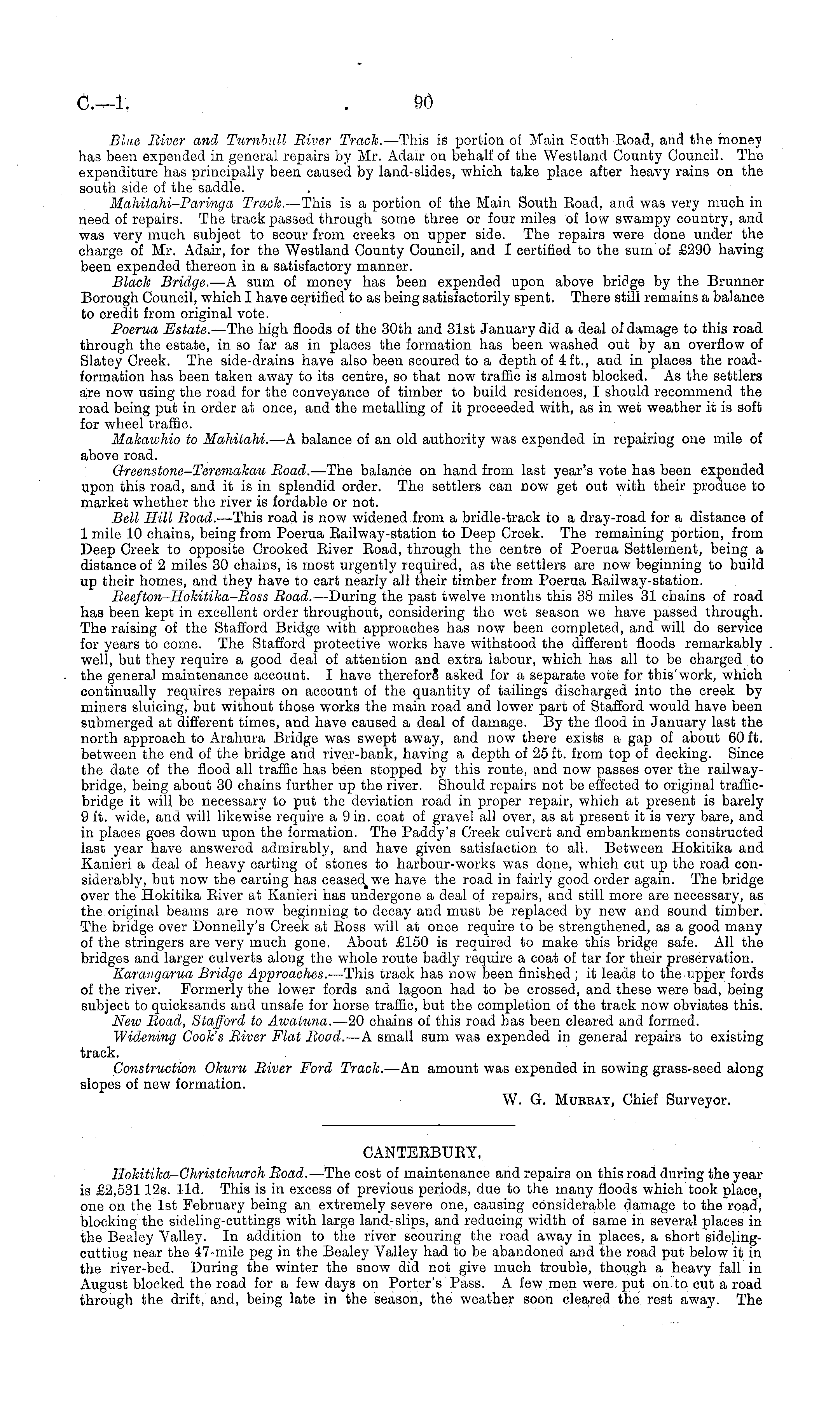 CANTEEBUEY. Hokitika-Christchurch Road. —The cost of maintenance and repairs on this road during the year is £2,531125. lid. This is in excess of previous periods, due to the many floods which took place, one on the Ist February being an extremely severe one, causing considerable damage to the road, blocking the sideling-cuttings with large land-slips, and reducing width of same in several places in the Bealey Valley. In addition to the river scouring the road away in places, a short sidelingcutting near the 47- mile peg in the Bealey Valley had to be abandoned and the road put below it in the river-bed. During the winter the snow did not give much trouble, though a heavy fall in August blocked the road for a few days on Porter's Pass. A few men were put on to cut a road through the drift, and, being late in the season, the weather soon cleared the rest away. The