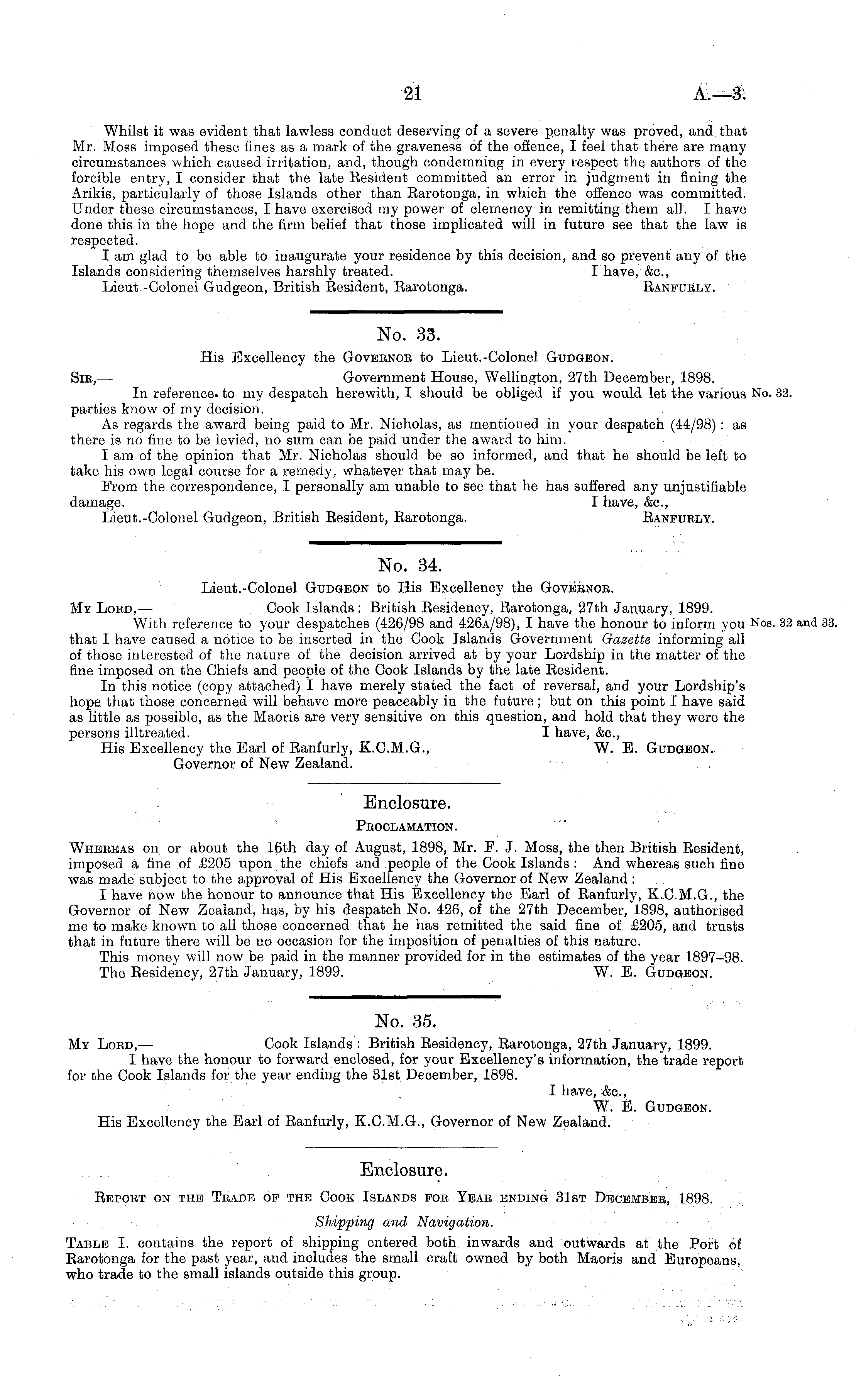 No. 33. His Excellency the Governoe to Lieut.-Colonel Gudgeon. Sic, — Government House, Wellington, 27th December, 1898. In reference, to my despatch herewith, I should be obliged if you would let the various parties know of my decision. As regards the award being paid to Mr. Nicholas, as mentioned in your despatch (44/98): as there is no fine to be levied, no sum can be paid under the award to him. I am of the opinion that Mr. Nicholas should be so informed, and that he should be left to take his own legal course for a remedy, whatever that may be. From the correspondence, I personally am unable to see that he has suffered any unjustifiable damage. I have, 4c,, Lieut.-Colonel Gudgeon, British Resident, Rarotonga. Ranfurly.