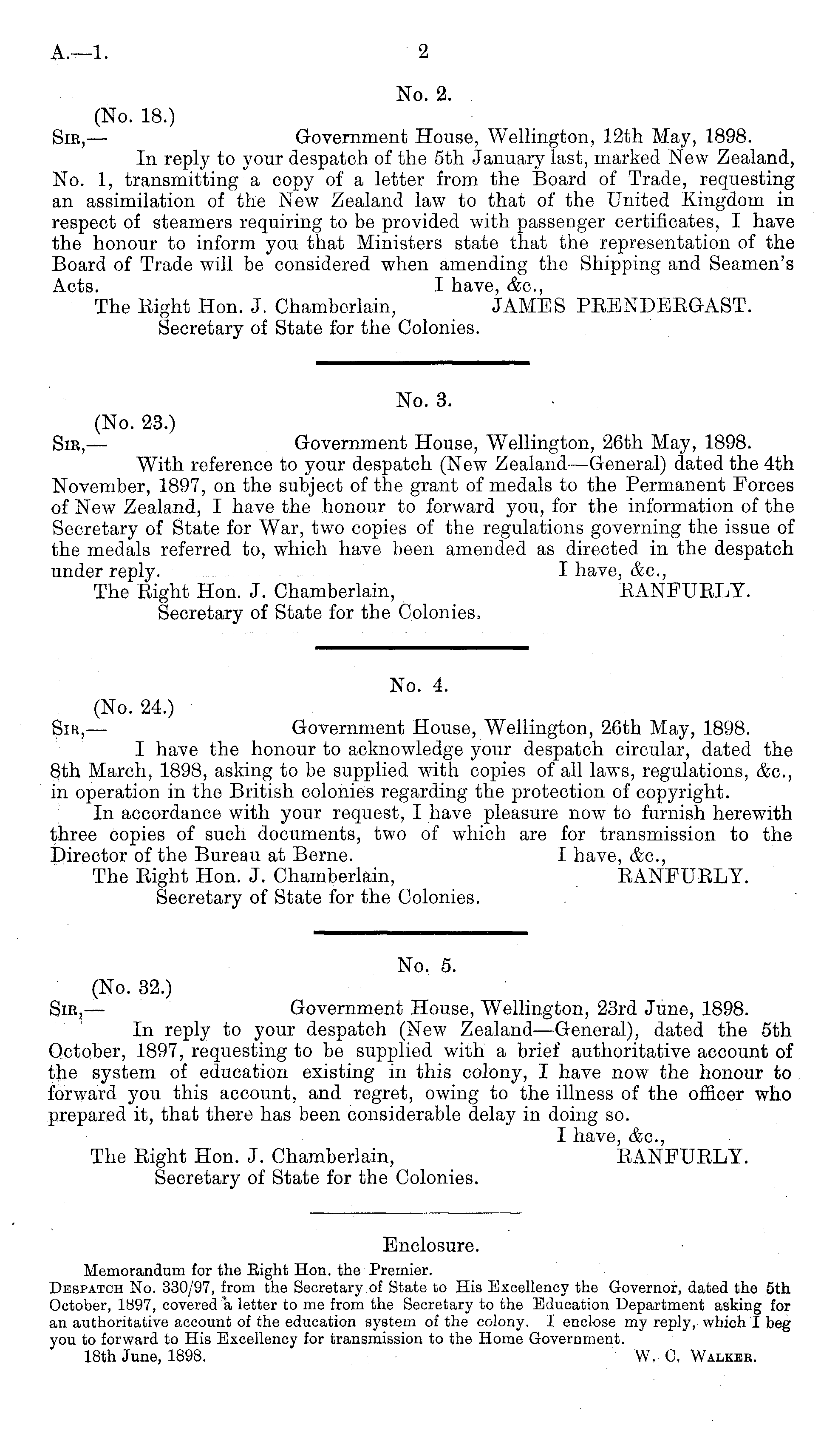 No. 5. (No. 32.) Sic, — Government House, Wellington, 23rd June, 1898. In reply to your despatch (New Zealand—General), dated the sth October, 1897, requesting to be supplied with a brief authoritative account of the system of education existing in this colony, I have now the honour to forward you this account, and regret, owing to the illness of the officer who prepared it, that there has been considerable delay in doing so. I have, &c, The Right Hon. J. Chamberlain, RANBURLY. Secretary of State for the Colonies.