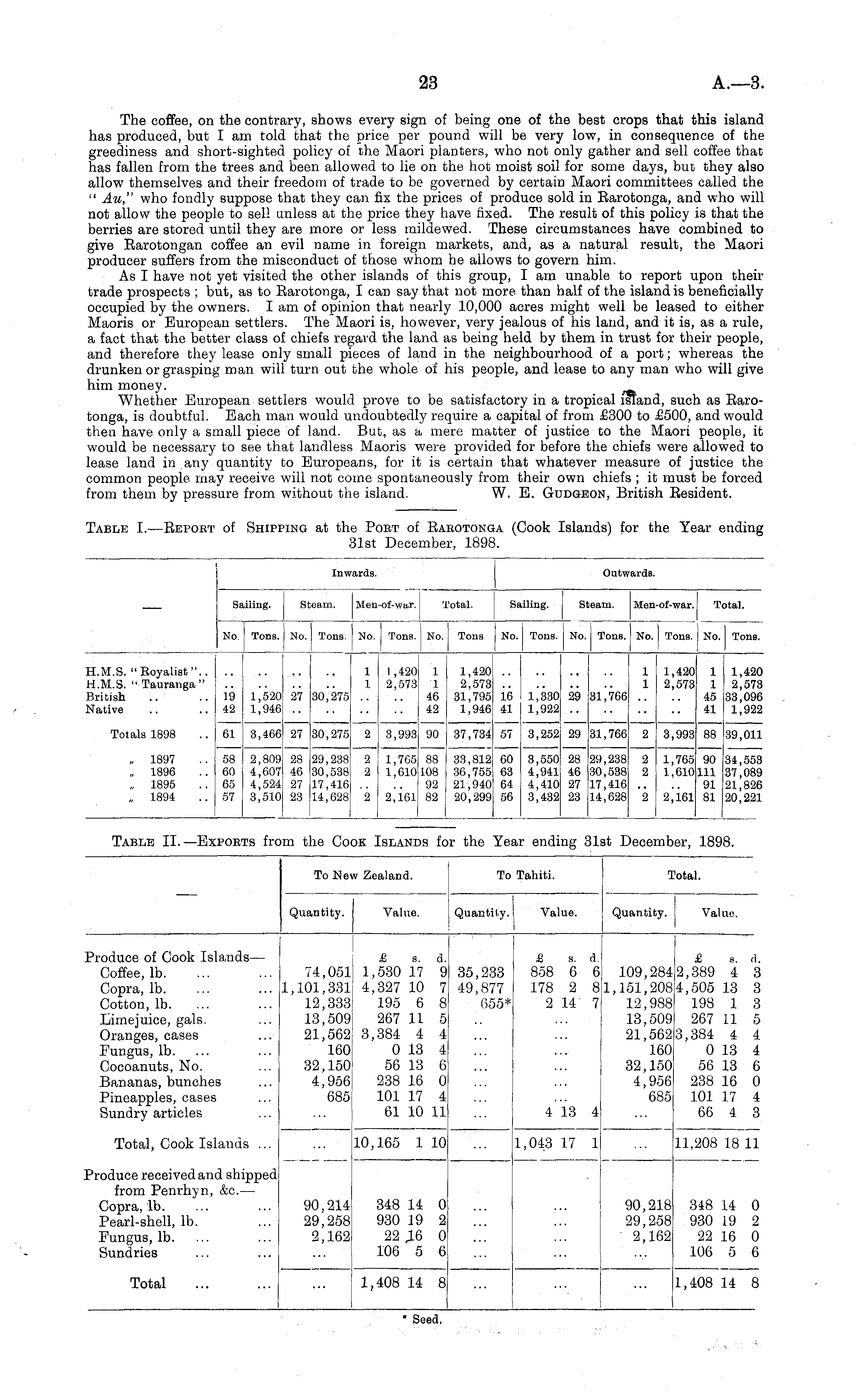 Table I. —Report of Shipping at the Port of Rarotonga (Cook Islands) for the Year ending 31st December, 1898.