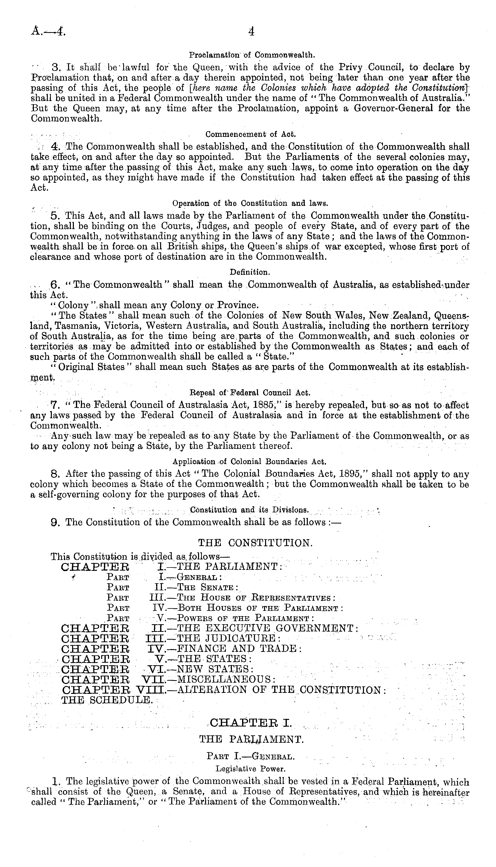 Proclamation of Commonwealth. '•■-■'- 3. It shall be' lawful for the Queen, with the advice of the Privy Council, to declare by Proclamation that, on and after a day therein appointed, not being later than one year after the passing of this Act, the people of [here name the Colonies which have adopted the Constitution] shall be united in a Federal Commonwealth under the name of " The Commonwealth of Australia." But the Queen may, at any time after the Proclamation, appoint a Governor-General for the Commonwealth. I ~..'. . Commencement of Aofc. i • 4. The Commonwealth shall be established, and the Constitution of the Commonwealth shall take effect, on and after the day so appointed. But the Parliaments of the several colonies may, at any time after the.passing of this Act, make any such laws,.to come into operation on the day so appointed, as they might have made if the Constitution had taken effect at the passing of this Act. Operation of the Constitution and laws. 5. This Act, and all laws made by the Parliament of the Commonwealth under the Constitution, shall be binding on the Courts, Judges, and people of every State, and of every part of the Commonwealth, notwithstanding anything in the laws of any State; and the laws of the Commonwealth shall be in force on all British ships, the Queen's ships of war exeepted, whose first port of clearance and whose port of destination are in the Commonwealth. Definition. ... 6. "The Commonwealth" shall mean the Commonwealth of Australia, as established-under this Act. " Colony " shall mean any Colony or Province. "The States" shall mean such of the Colonies of New South Wales, New Zealand, Queensland, Tasmania, Victoria, Western Australia, and South Australia, including the northern territory of South Australia, as for the time being are parts of the Commonwealth, and such colonies or territories as may be admitted into or established by the Commonwealth as States; and each of such parts of the Commonwealth shall be called a " State." " Original States " shall mean such States as are parts of the Commonwealth at its establishment. : :, Bepeal of Federal Council Act. 7. " The Federal Council of Australasia Act, 1885," is hereby repealed, but so as not to affect any laws passed by the Federal Council of Australasia and in force at the establishment of the Commonwealth. Any such law may be repealed as to any State by the Parliament of the Commonwealth, or as to any colony not being a State, by the Parliament thereof. Application of Colonial Boundaries Act. 8. After the passing of this Act " The Colonial Boundaries Act, 1895," shall not apply to any colony which becomes a State of the Commonwealth; but the Commonwealth shall be taken to be a self-governing colony for the purposes of that Act. ' ■ ■' '.■••;■« ;_■ Constitution and its Divisions. ' ■' .•■-■■'. 9. The Constitution of the Commonwealth shall be as follows :— THE CONSTITUTION. This Constitution is divided as follows— ■ CHAPTER '." I.— THE PARLIAMENT: f Pact I.—General: _ : ... .;■. ■■',"' Pakt ll.—The Senate : Part lll.—The House of Representatives : Pact IV.—Both Houses of the Pabliament : Pact V. —Powees op the Pabliament : CHAPTER lI.—THE EXECUTIVE GOVERNMENT: CHAPTER lII.—THE JUDICATURE : ■: ■:: CHAPTER rV.— FINANCE AND TRADE : < CHAPTER V.— THE STATES : . CHAPTER VI.— NEW STATES: : - '. ' " : :: : CHAPTER VII.— MISCELLANEOUS: CHAPTER VIII— ALTERATION OF THE CONSTITUTION: /...",... THE SCHEDULE. ■ : ■■■■■■ '■'■■}. ... ■:... ~:■. CHAPTER I. , , THE PARLIAMENT. Part I.—General. , - ,'..,... Legislative Power. \. The legislative power of the Commonwealth shall be vested in a Federal Parliament, which shall consist of the Queen, a Senate, and a House of Representatives, and which is hereinafter called " The Parliament," or "The Parliament of the Commonwealth." , . - : :