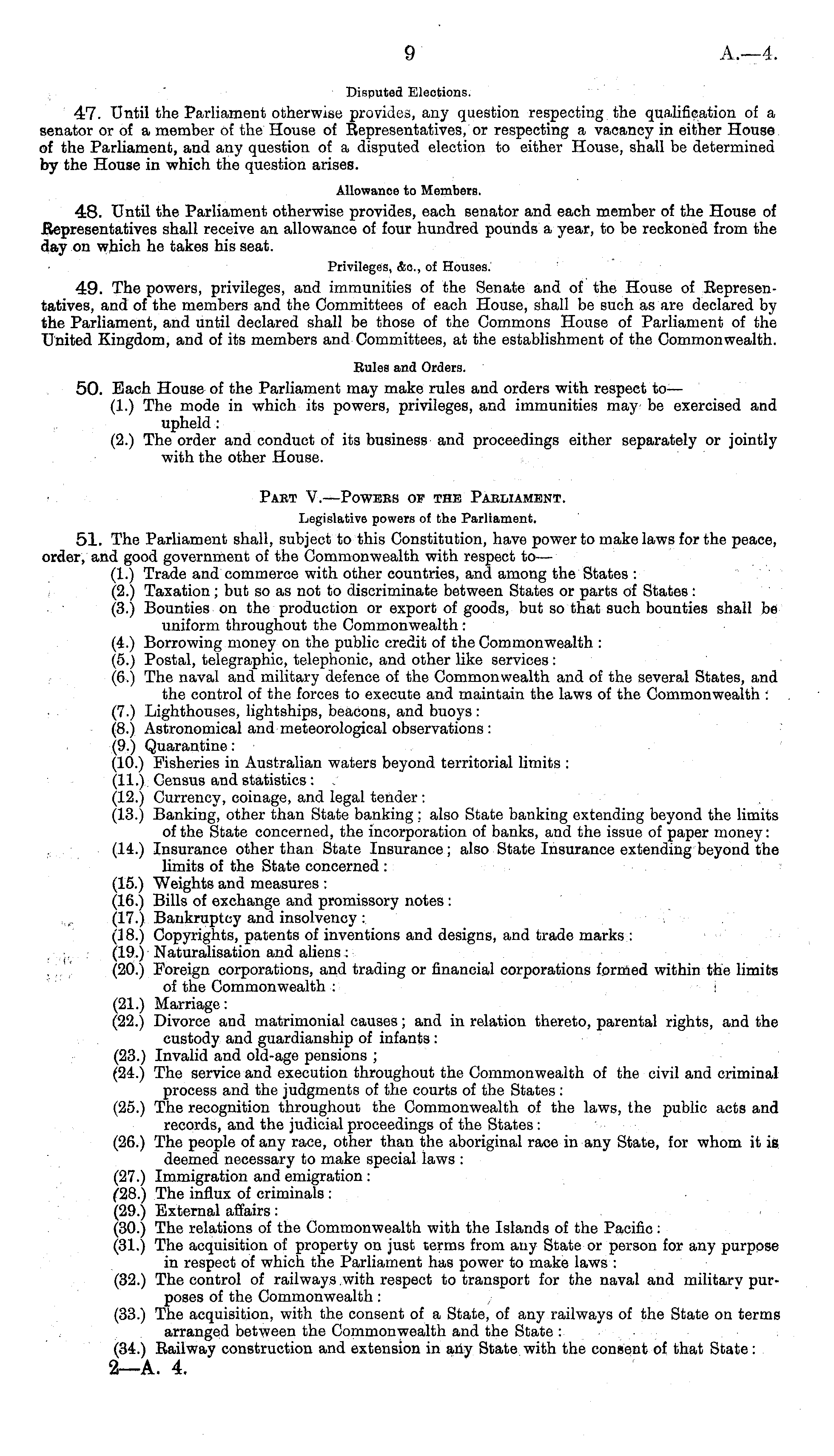 Disputed Elections. 47. Until the Parliament otherwise provides, any question respecting the qualification of a senator or of a member of the House of Representatives, or respecting a vacancy in either House of the Parliament, and any question of a disputed election to either House, shall be determined by the House in which the question arises. Allowance to Members. 48. Until the Parliament otherwise provides, each senator and each member of the House of .Representatives shall receive an allowance of four hundred pounds a year, to be reckoned from the day on which he takes his seat. Privileges, &c, of Houses. 49. The powers, privileges, and immunities of the Senate and of the House of Representatives, and of the members and the Committees of each House, shall be such as are declared by the Parliament, and until declared shall be those of the Commons House of Parliament of the United Kingdom, and of its members and Committees, at the establishment of the Commonwealth. Rules and Orders. 50. Bach House of the Parliament may make rules and orders with respect to— (1.) The mode in which its powers, privileges, and immunities may be exercised and upheld: (2.) The order and conduct of its business and proceedings either separately or jointly with the other House. Pact V.—Powers op the Pakliament. Legislative powers of the Parliament. 51. The Parliament shall, subject to this Constitution, have power to make laws for the peace, order, and good government of the Commonwealth with respect to— (1.) Trade and commerce with other countries, and among the States : (2.) Taxation ; but so as not to discriminate between States or parts of States : (3.) Bounties on the production or export of goods, but so that such bounties shall be uniform throughout the Commonwealth: (4.) Borrowing money on the public credit of the Commonwealth : (5.) Postal, telegraphic, telephonic, and other like services: (6.) The naval and military defence of the Commonwealth and of the several States, and the control of the forces to execute and maintain the laws of the Commonwealth : (7.) Lighthouses, lightships, beacons, and buoys : (8.) Astronomical and meteorological observations: (9.) Quarantine: (10.) Fisheries in Australian waters beyond territorial limits : (11.) Census and statistics : (12.) Currency, coinage, and legal tender : (13.) Banking, other than State banking : also State banking extending beyond the limits of the State concerned, the incorporation of banks, and the issue of paper money: , (14.) Insurance other than State Insurance; also State Insurance extending beyond the limits of the State concerned : (15.) Weights and measures : (16.) Bills of exchange and promissory notes : (17.) Bankruptcy and insolvency : rr :i (1 8.) Copyrights, patents of inventions and designs, and trade marks : . j, (19.) Naturalisation and aliens : (20.) Foreign corporations, and trading or financial corporations formed within the limits of the Commonwealth : j (21.) Marriage: (22.) Divorce and matrimonial causes; and in relation thereto, parental rights, and the custody and guardianship of infants : (23.) Invalid and old-age pensions ; (24.) The service and execution throughout the Commonwealth of the civil and criminal process and the judgments of the courts of the States : (25.) The recognition throughout the Commonwealth of the laws, the public acts and records, and the judicial proceedings of the States: (26.) The people of any race, other than the aboriginal race in any State, for whom it is deemed necessary to make special laws : (27.) Immigration and emigration : (28.) The influx of criminals : (29.) External affairs: (30.) The relations of the Commonwealth with the Islands of the Pacific: (31.) The acquisition of property on just terms from any State or person for any purpose in respect of which the Parliament has power to make laws : (32.) The control of railways with respect to transport for the naval and military purposes of the Commonwealth: (33.) The acquisition, with the consent of a State, of any railways of the State on terms arranged between the Commonwealth and the State : (34.) Railway construction and extension in any State with the consent of that State: 2—A. 4.