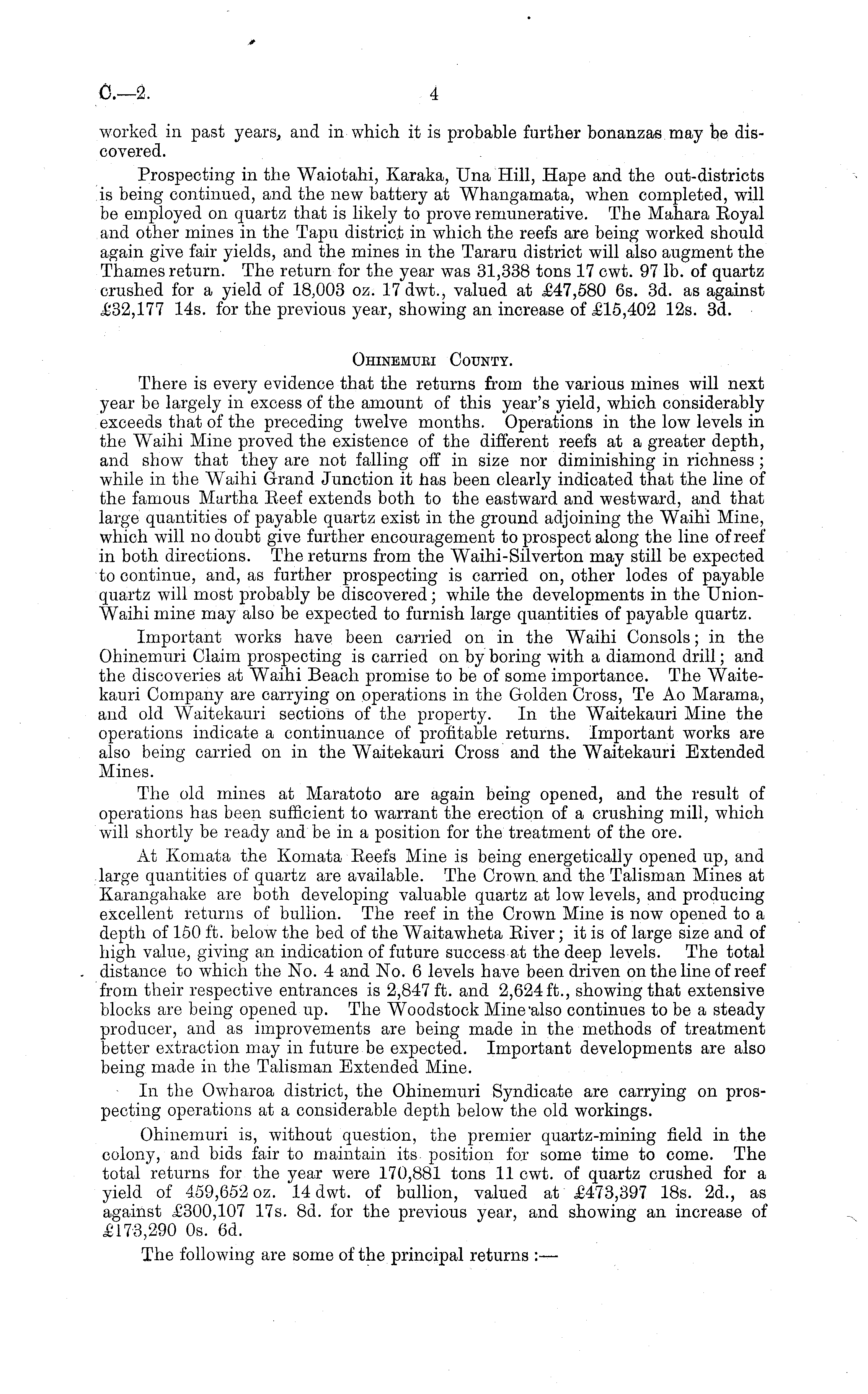 worked in past years, and in which it is probable further bonanzas may be discovered. Prospecting in the Waiotahi, Karaka, Una Hill, Hape and the out-districts is being continued, and the new battery at Whangamata, when completed, will be employed on quartz that is likely to prove remunerative. The Mahara Royal and other mines in the Tapu district in which the reefs are being worked should again give fair yields, and the mines in the Tararu district will also augment the Thames return. The return for the year was 31,338 tons 17 cwt. 97 lb. of quartz crushed for a yield of 18,003 oz. 17 dwt., valued at £47,580 6s. 3d. as against £32,177 14s. for the previous year, showing an increase of £15,402 12s. 3d. Ohinemuei County. There is every evidence that the returns from the various mines will next year be largely in excess of the amount of this year's yield, which considerably exceeds that of the preceding twelve months. Operations in the low levels in the Waihi Mine proved the existence of the different reefs at a greater depth, and show that they are not falling off in size nor diminishing in richness; while in the Waihi Grand Junction it has been clearly indicated that the line of the famous Martha Reef extends both to the eastward and westward, and that large quantities of payable quartz exist in the ground adjoining the Waihi Mine, which will no doubt give further encouragement to prospect along the line of reef in both directions. The returns from the Waihi-Silverton may still be expected to continue, and, as further prospecting is carried on, other lodes of payable quartz will most probably be discovered; while the developments in the UnionWaihi mine may also be expected to furnish large quantities of payable quartz. Important works have been carried on in the Waihi Consols; in the Ohinemuri Claim prospecting is carried on by boring with a diamond drill; and the discoveries at Waihi Beach promise to be of some importance. The Waitekauri Company are carrying on operations in the Golden Cross, Te Ao Marama, and old Waitekauri sections of the property. In the Waitekauri Mine the operations indicate a continuance of profitable returns. Important works are also being carried on in the Waitekauri Cross and the Waitekauri Extended Mines. The old mines at Maratoto are again being opened, and the result of operations has been sufficient to warrant the erection of a crushing mill, which will shortly be ready and be in a position for the treatment of the ore. At Komata the Komata Reefs Mine is being energetically opened up, and large quantities of quartz are available. The Crown, and the Talisman Mines at Karangahake are both developing valuable quartz at low levels, and producing excellent returns of bullion. The reef in the Crown Mine is now opened to a depth of 150 ft. below the bed of the Waitawheta River; it is of large size and of high value, giving an indication of future success at the deep levels. The total distance to which the No. 4 and No. 6 levels have been driven on the line of reef from their respective entrances is 2,847 ft. and 2,624 ft., showing that extensive blocks are being opened up. The Woodstock Mine'also continues to be a steady producer, and as improvements are being made in the methods of treatment better extraction may in future be expected. Important developments are also being made in the Talisman Extended Mine. In the Owharoa district, the Ohinemuri Syndicate are carrying on prospecting operations at a considerable depth below the old workings. Ohinemuri is, without question, the premier quartz-mining field in the colony, and bids fair to maintain its position for some time to come. The total returns for the year were 170,881 tons 11 cwt. of quartz crushed for a yield of 459,652 oz. 14 dwt. of bullion, valued at £473,397 18s. 2d., as against £300,107 17s. Bd. for the previous year, and showing an increase of £173,290 os. 6d. The following are some of the principal returns :—
