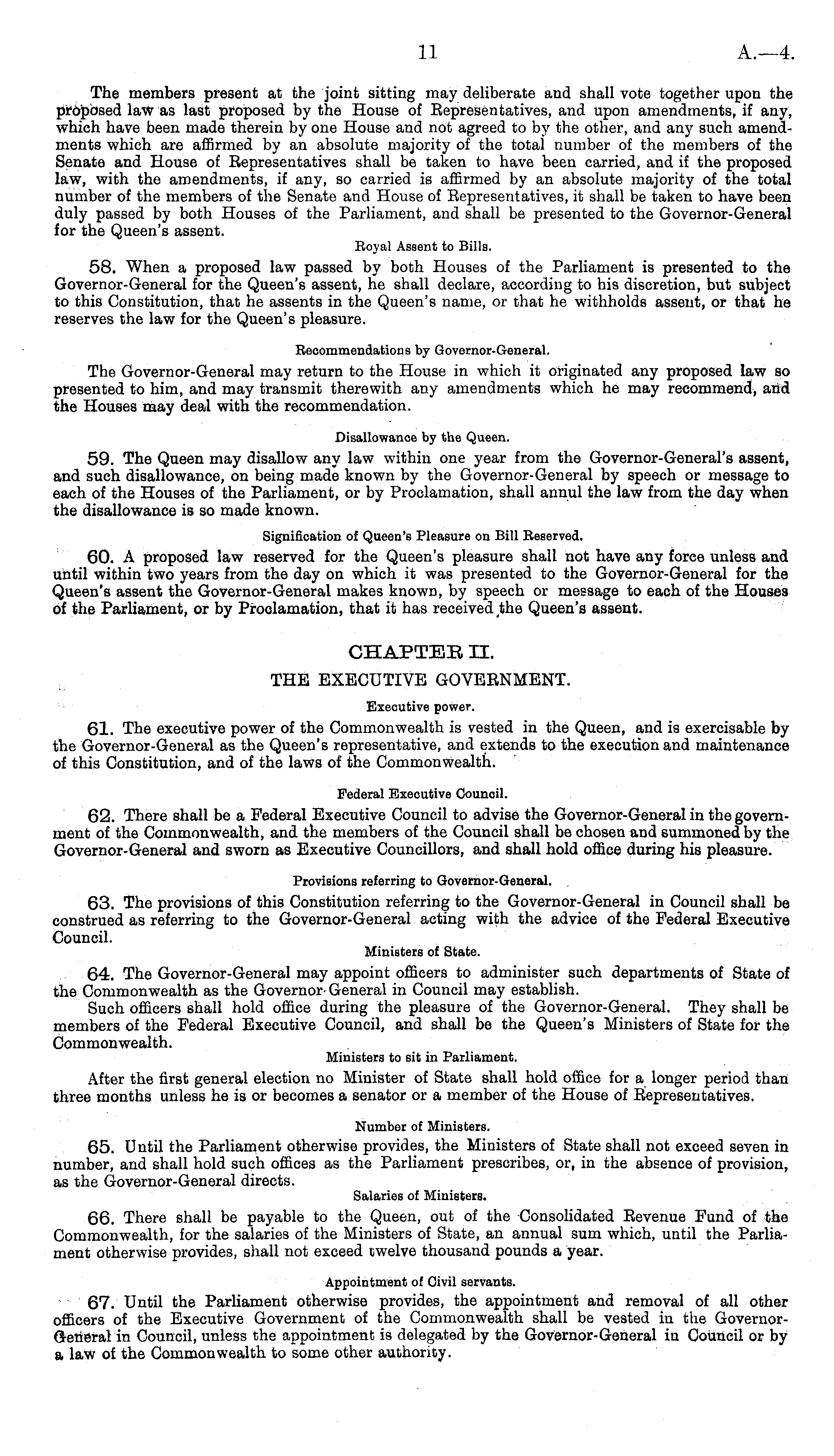 The members present at the joint sitting may deliberate and shall vote together upon the proposed law as last proposed by the House of Eepresentatives, and upon amendments, if any, which have been made therein by one House and not agreed to by the other, and any such amendments which are affirmed by an absolute majority of the total number of the members of the Senate and House of Eepresentatives shall be taken to have been carried, and if the proposed law, with the amendments, if any, so carried is affirmed by an absolute majority of the total number of the members of the Senate and House of Eepresentatives, it shall be taken to have been duly passed by both Houses of the Parliament, and shall be presented to the Governor-General for the Queen's assent. Royal Assent to Bills. 58. When a proposed law passed by both Houses of the Parliament is presented to the Governor-General for the Queen's assent, he shall declare, according to his discretion, but subject to this Constitution, that he assents in the Queen's name, or that he withholds assent, or that he reserves the law for the Queen's pleasure. Recommendations by Governor-General. The Governor-General may return to the House in which it originated any proposed law so presented to him, and may transmit therewith any amendments which he may recommend, and the Houses may deal with the recommendation. Disallowance by the Queen. 59. The Queen may disallow any law within one year from the Governor-General's assent, and such disallowance, on being made known by the Governor-General by speech or message to each of the Houses of the Parliament, or by Proclamation, shall annul the law from the day when the disallowance is so made known. Signification of Queen's Pleasure on Bill Reserved. 60. A proposed law reserved for the Queen's pleasure shall not have any force unless and until within two years from the day on which it was presented to the Governor-General for the Queen's assent the Governor-General makes known, by speech or message to each of the Houses of the Parliament, or by Proclamation, that it has received the Queen's assent. CHAPTEE 11. THE EXECUTIVE GOVEENMENT. Executive power. 61. The executive power of the Commonwealth is vested in the Queen, and is exercisable by the Governor-General as the Queen's representative, and extends to the execution and maintenance of this Constitution, and of the laws of the Commonwealth. Federal Executive Oounoil, 62. There shall be a Federal Executive Council to advise the Governor-General in the government of the Commonwealth, and the members of the Council shall be chosen and summoned by the Governor-General and sworn as Executive Councillors, and shall hold office during his pleasure. Provisions referring to Governor-General. . 63. The provisions of this Constitution referring to the Governor-General in Council shall be construed as referring to the Governor-General acting with the advice of the Federal Executive Council. Ministers of State. 64. The Governor-General may appoint officers to administer such departments of State of the Commonwealth as the Governor-General in Council may establish. Such officers shall hold office during the pleasure of the Governor-General. They shall be members of the Federal Executive Council, and shall be the Queen's Ministers of State for the Commonwealth. Ministers to sit in Parliament. After the first general election no Minister of State shall hold office for a longer period than three months unless he is or becomes a senator or a member of the House of Eepresentatives. Number of Ministers. 65. Until the Parliament otherwise provides, the Ministers of State shall not exceed seven in number, and shall hold such offices as the Parliament prescribes, or, in the absence of provision, as the Governor-General directs. Salaries of Ministers. 66. There shall be payable to the Queen, out of the Consolidated Eevenue Fund of the Commonwealth, for the salaries of the Ministers of State, an annual sum which, until the Parliament otherwise provides, shall not exceed twelve thousand pounds a year. Appointment of Civil servants. 67. Until the Parliament otherwise provides, the appointment and removal of all other officers of the Executive Government of the Commonwealth shall be vested in the Governor-β-erieral: in Council, unless the appointment is delegated by the Governor-General in Council or by a law of the Commonwealth to some other authority.