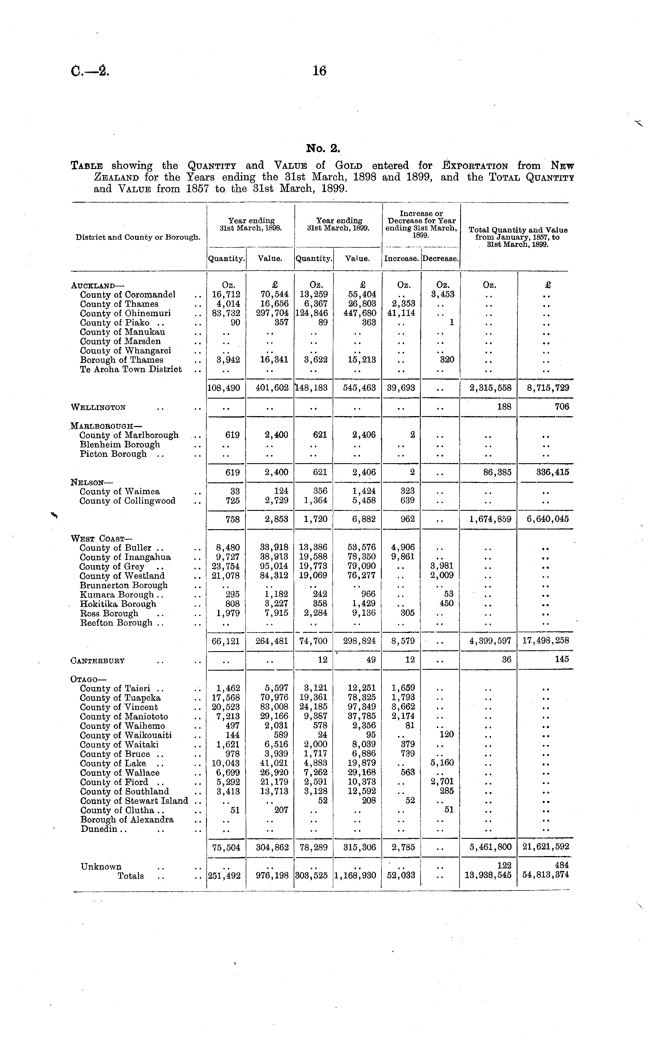 No. 2. Table showing the Quantity and Value of Gold entered for Exportation from New Zealand for the Years ending the 31st March, 1898 and 1899, and the Total Quantity and Value from 1857 to the 31st March, 1899.