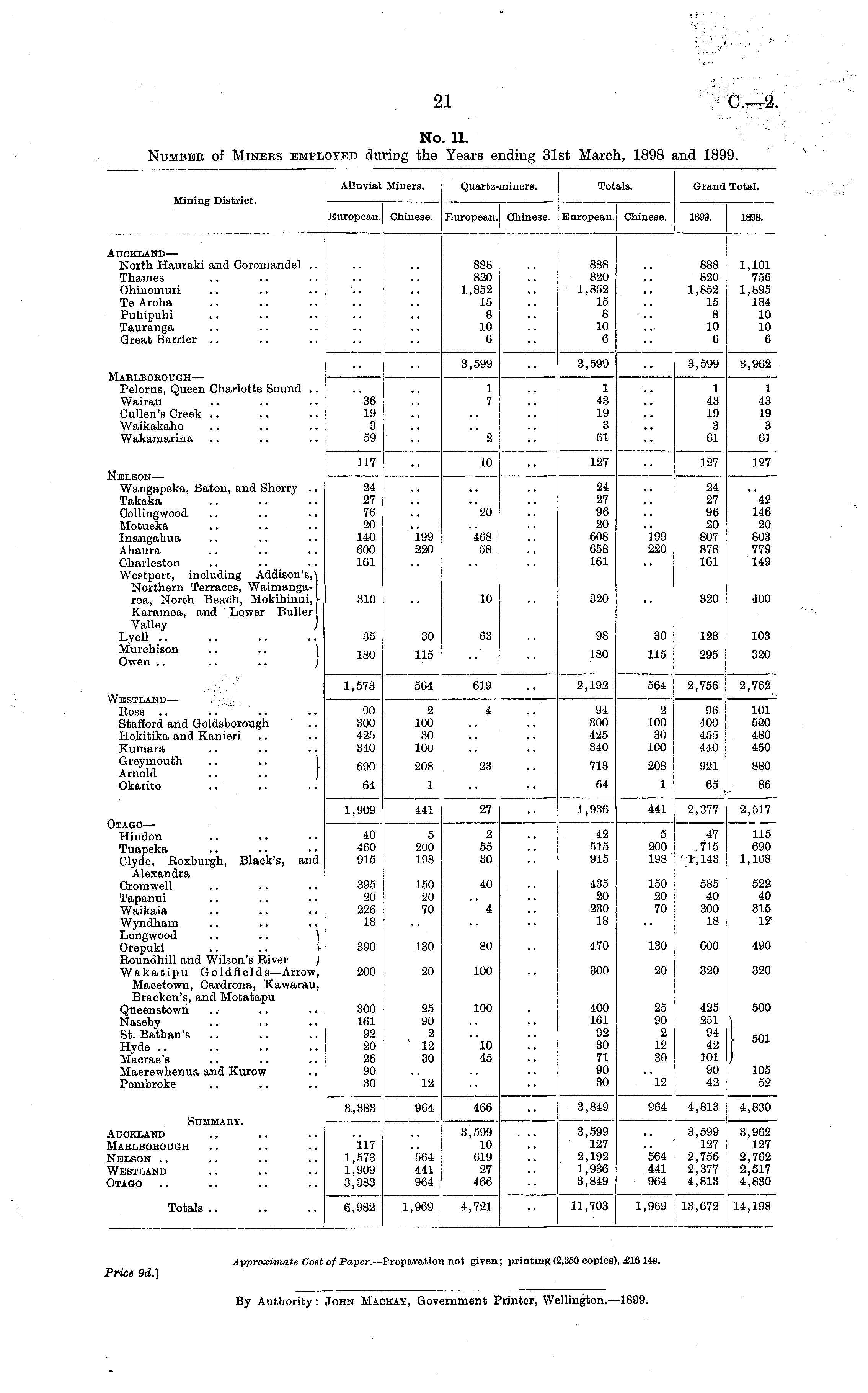 Alluvial Miners. Quartz-miners. Totals. Grand Total. Mining District. European. Chinese. European. Chinese. European. Chinese. 1899. 1898. Auckland — North Hauraki and Corornandel .. Thames Ohinemuri Te Aroha Puhipuhi Tauranga Great Barrier .. 888 820 1,852 15 8 10 6 888 820 1,852 15 8 10 6 888 820 1,852 15 8 10 6 1,101 756 1,895 184 10 10 6 Maelbobough— Pelorus, Queen Charlotte Sound .. Wairau Oullen's Creek Waikakaho Wakamarina 3,599 1 7 3,599 3,599 3,962 36 19 3 59 1 43 19 3 61 1 43 19 3 61 1 •13 19 3 61 2 Nelson— Wangapeka, Baton, and Sherry .. Takaka Collingwood Motueka Inangahua Ahaura Charleston Westport, including Addison's,' Northern Terraces, Waimangaroa, North Beach, Mokihinui, ■ Karamea, and Lower Buller Valley Lyell .. Murchison Owen .. .. .. ) 117 10 127 127 127 24 27 76 20 140 600 161 199 220 "20 468 58 24 27 96 20 608 658 161 'l99 220 24 27 96 20 807 878 161 42 146 20 803 779 149 310 10 320 320 400 35 30 63 98 30 128 103 180 115 180 115 295 320 1,573 564 619 2,192 564 2,756 2,762 Westland— Ross Stafford and Goldsborough Hokitika and Kanieri Kumara Greymouth .. .. ) Arnold .. .. J Okarito 90 300 425 340 2 100 30 100 4 94 300 425 340 2 100 30 100 96 400 455 440 101 520 480 450 690 208 23 713 208 921 880 64 1 64 1 65 86 1,909 441 27 1,936 42 515 945 441 2,377 2,517 115 690 1,168 Otago— Hindon Tuapeka Clyde, Roxburgh, Black's, and Alexandra Cromwell Tapanui Waikaia Wyndham Longwood .. .. j Orepuki .. .. V Roundhill and Wilson's River j Wakatipu Goldfields —Arrow, Macetown, Cardrona, Kawarau, Bracken's, and Motatapu Queenstown Naseby St. Bathan's Hyde .. Macrae's Maerewhenua and Kurow Pembroke 40 460 915 395 20 226 18 390 5 200 198 150 20 70 130 2 55 30 40 4 80 435 20 230 18 470 5 200 198 150 20 70 130 47 ,715 ■t-,143 585 40 300 18 600 522 40 315 12 490 200 20 100 300 20 320 320 300 161 92 20 26 90 30 25 90 2 12 30 100 400 161 92 30 71 90 30 25 90 2 12 30 425 251 94 42 101 90 42 500 I 501 10 45 12 12 105 52 3,383 964 466 SUMMABY. 3,849 964 4,813 4,830 Auckland ., Marlbobough Nelson Westland Otago 117 1,573 1,909 3,383 564 441 964 3,599 10 619 27 466 3,599 127 2,192 1,936 3,849 564 441 964 3,599 127 2,756 2,377 4,813 3,962 127 2,762 2,517 4,830 Totals 6,982 1,969 4,721 11,703 1,969 13,672 14,198 Approximate Cost of Paper.— Preparatioi not given printing (2,350 copies; I, £16 14s. 'rice 9d.] -1899. By Authority: John Mackay, Government Printer, Wellington.
