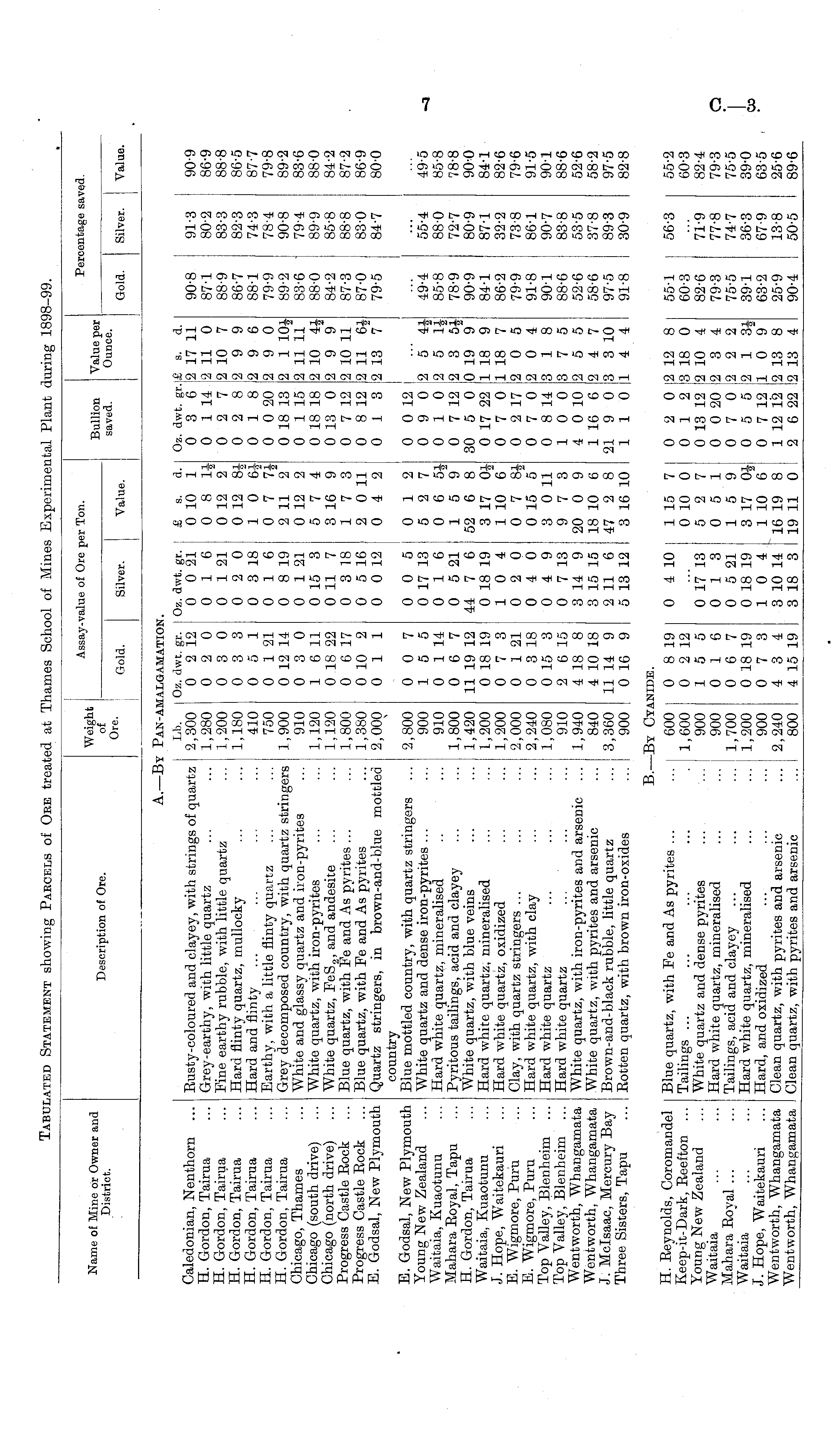 Tabulated Statement showing Parcels of Ore treated at Thames School of Mines Experimental Plant during 1898-99.