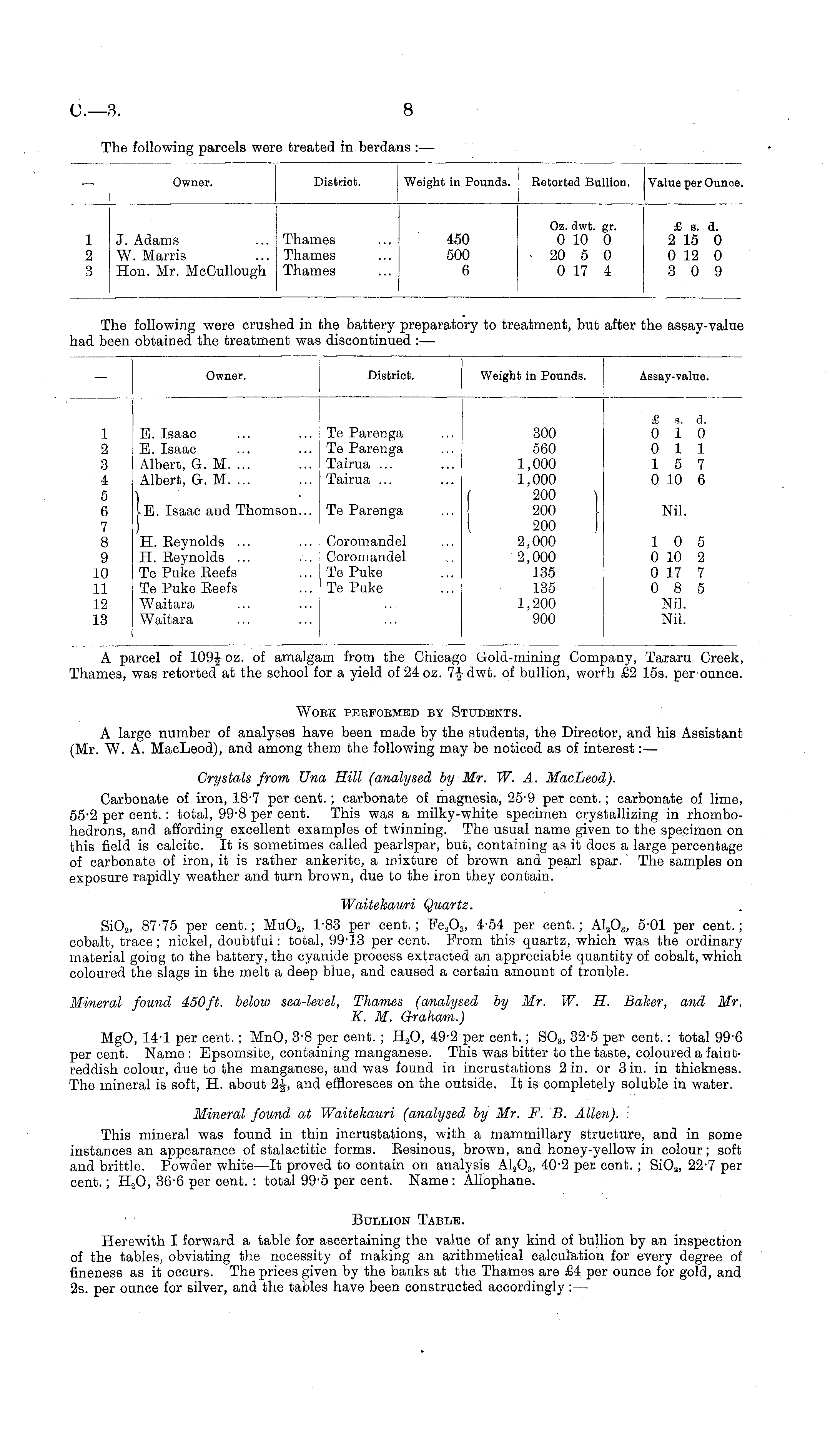 Owner. District. Weight in Pounds. Assay-value. 1 2 3 4 5 6 7 8 9 10 11 12 13 E. Isaac E. Isaac Albert, G. M. ... Albert, G. M. ... Te Parenga Te Parenga Tairua ... Tairua ... I 300 560 1,000 1,000 200 200 200 2,000 2,000 135 135 1,200 900 } £ s. 0 1 0 1 1 5 0 10 d. 0 1 7 6 [E. Isaac and Thomson... H. Eeynolds ... H. Eeynolds ... Te Puke Beefs Te Puke Beefs Waitara Waitara Te Parenga Coromandel Coromandel Te Puke Te Puke Nil. 1 0 0 10 0 17 0 8 Nil. Nil. 5 2 7 5