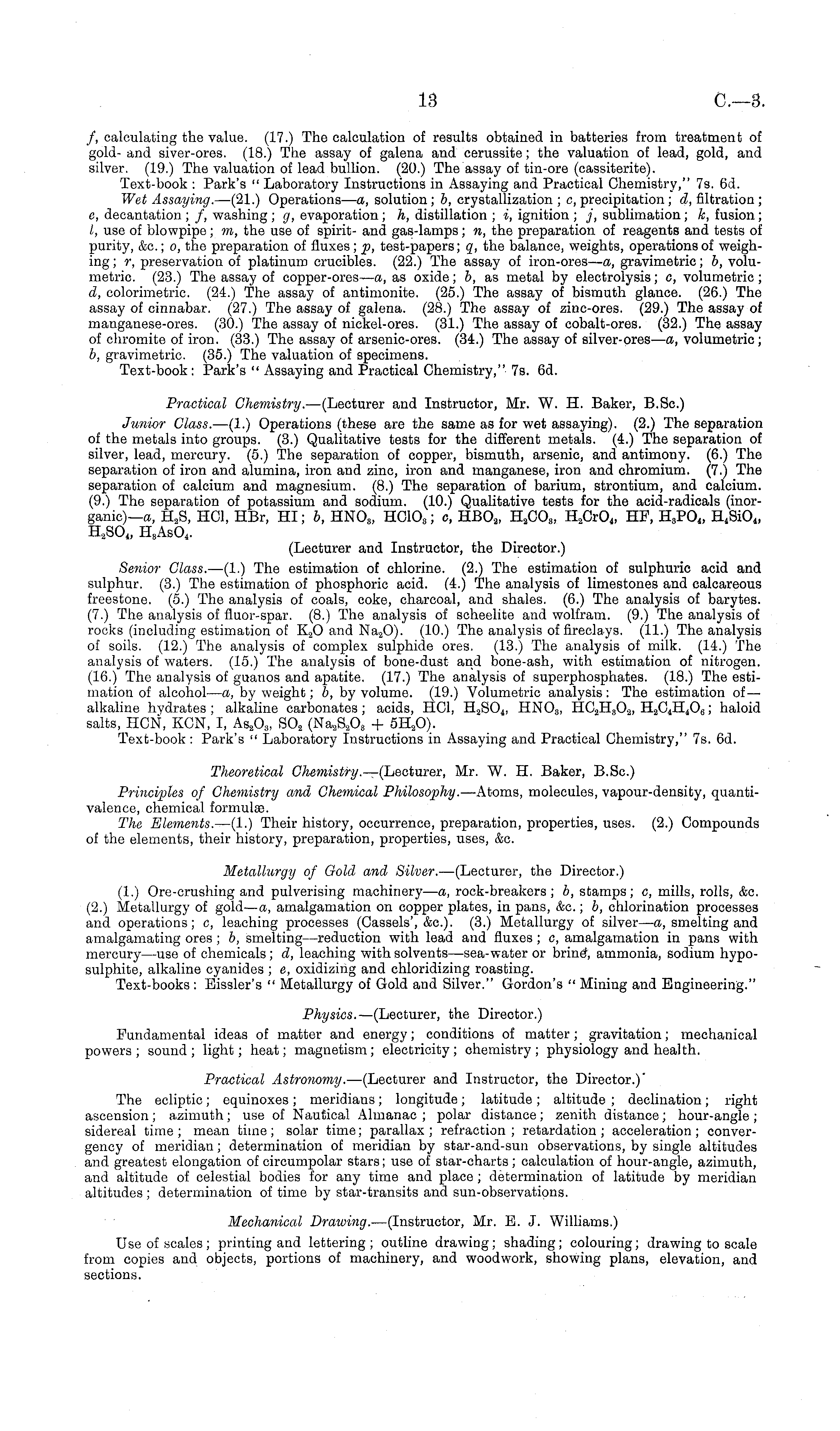 /, calculating the value. (17.) The calculation of results obtained in batteries from treatment of gold- and siver-ores. (18.) The assay of galena and cerussite; the valuation of lead, gold, and silver. (19.) The valuation of lead bullion. (20.) The assay of tin-ore (cassiterite). Text-book : Park's " Laboratory Instructions in Assaying and Practical Chemistry," 7s. 6d. Wet Assaying. —(21.) Operations — a, solution; b, crystallization ; c, precipitation ; d, filtration ; c, decantation ;/, washing ;g, evaporation; h, distillation ;i, ignition ; j, sublimation; k, fusion; I, use of blowpipe; m, the use of spirit- and gas-lamps; n, the preparation of reagents and tests of purity, &c.; o, the preparation of fluxes; p, test-papers; q, the balance, weights, operations of weighing ; r, preservation of platinum crucibles. (22.) The assay of iron-ores— a, gravimetric; b, volumetric. (23.) The assay of copper-ores— a, as oxide; b, as metal by electrolysis; c, volumetric ; d, colorimetric. (24.) The assay of antimonite. (25.) The assay of bismuth glance. (26.) The assay of cinnabar. (27.) The assay of galena. (28.) The assay of zinc-ores. (29.) The assay of manganese-ores. (30.) The assay of nickel-ores. (31.) The assay of cobalt-ores. (32.) The assay of chromite of iron. (33.) The assay of arsenic-ores. (34.) The assay of silver-ores— a, volumetric; b, gravimetric. (35.) The valuation of specimens. Text-book: Park's " Assaying and Practical Chemistry," 7s. 6d. Practical Chemistry. —(Lecturer and Instructor, Mr. W. H. Baker, B.Sc.) Junior Class. —(l.) Operations (these are the same as for wet assaying). (2.) The separation of the metals into groups. (3.) Qualitative tests for the different metals. (4.) The separation of silver, lead, mercury. (5.) The separation of copper, bismuth, arsenic, and antimony. (6.) The separation of iron and alumina, iron and zinc, iron and manganese, iron and chromium. (7.) The separation of calcium and magnesium. (8.) The separation of barium, strontium, and calcium. (9.) The separation of potassium and sodium. (10.) Qualitative tests for the acid-radicals (inorganic)—a, H 2 S, HCI, HBr, HI; b, HN0 8 , HCI0 s ; c, HB0 2 , H 2 CO 3 , H 2 Cr0 4 , HP, H 3 PO 4 , H 4 Si0 4) H 2 SO 4 , H 3 As0 4 . (Lecturer and Instructor, the Director.) Senior Class. —(1.) The estimation of chlorine. (2.) The estimation of sulphuric acid and sulphur. (3.) The estimation of phosphoric acid. (4.) The analysis of limestones and calcareous freestone. (5.) The analysis of coals, coke, charcoal, and shales. (6.) The analysis of barytes. (7.) The analysis of fluor-spar. (8.) The analysis of scheelite and wolfram. (9.) The analysis of rocks (including estimation of K 2 O and Na 2 O). (10.) The analysis of fireclays. (11.) The analysis of soils. (12.) The analysis of complex sulphide ores. (13.) The analysis of milk. (14.) The analysis of waters. (15.) The analysis of bone-dust and bone-ash, with estimation of nitrogen. (16.) The analysis of guanos and apatite. (17.) The analysis of superphosphates. (18.) The estimation of alcohol— a, by weight; b, by volume. (19.) Volumetric analysis : The estimation of— alkaline hydrates ; alkaline carbonates; acids, HCI, H 2 SO 4 , HN0 3l HC 2 H 3 O 2 , H a C 4 H 4 O c ; haloid salts, HCN, KCN, I, As 2 O 3 , SO 2 (Na 2 S 2 O B + SH/)). Text-book : Park's " Laboratory Instructions in Assaying and Practical Chemistry," 7s. 6d. Theoretical Chemistry.— (Lecturer, Mr. W. H. Baker, B.Sc.) Principles of Chemistry and Chemical Philosophy. —Atoms, molecules, vapour-density, quantivalence, chemical formulae. The Elements. —(1.) Their history, occurrence, preparation, properties, uses. (2.) Compounds of the elements, their history, preparation, properties, uses, &c. Metallurgy of Gold and Silver. —(Lecturer, the Director.) (1.) Ore-crushing and pulverising machinery— a, rock-breakers; b, stamps; c, mills, rolls, &c. (2.) Metallurgy of gold— a, amalgamation on copper plates, in pans, &c.; b, chlorination processes and. operations; c, leaching processes (Cassels , , &c). (3.) Metallurgy of silver — a, smelting and amalgamating ores ; b, smelting —reduction with lead and fluxes ; c, amalgamation in pans with mercury—use of chemicals; d, leaching with solvents—sea-water or brine, ammonia, sodium hyposulphite, alkaline cyanides ; c, oxidizing and chloridizing roasting. Text-books : Eissler's " Metallurgy of Gold and Silver." Gordon's " Mining and Engineering." Physics. —(Lecturer, the Director.) Fundamental ideas of matter and energy; conditions of matter; gravitation; mechanical powers; sound; light; heat; magnetism; electricity; chemistry; physiology and health. Practical Astronomy. —(Lecturer and Instructor, the Director.) The ecliptic; equinoxes ; meridians; longitude; latitude ; altitude ; declination; right ascension; azimuth; use of Nautical Almanac ; polar distance; zenith distance; hour-angle; sidereal time ; mean time; solar time; parallax ; refraction ; retardation ; acceleration ; convergency of meridian; determination of meridian by star-and-sun observations, by single altitudes and greatest elongation of circumpolar stars; use of star-charts; calculation of hour-angle, azimuth, and altitude of celestial bodies for any time and place ; determination of latitude by meridian altitudes ; determination of time by star-transits and sun-observations. Mechanical Drawing. —(lnstructor, Mr. E. J. Williams.) Use of scales; printing and lettering; outline drawing; shading; colouring; drawing to scale from copies and objects, portions of machinery, and woodwork, showing plans, elevation, and sections.