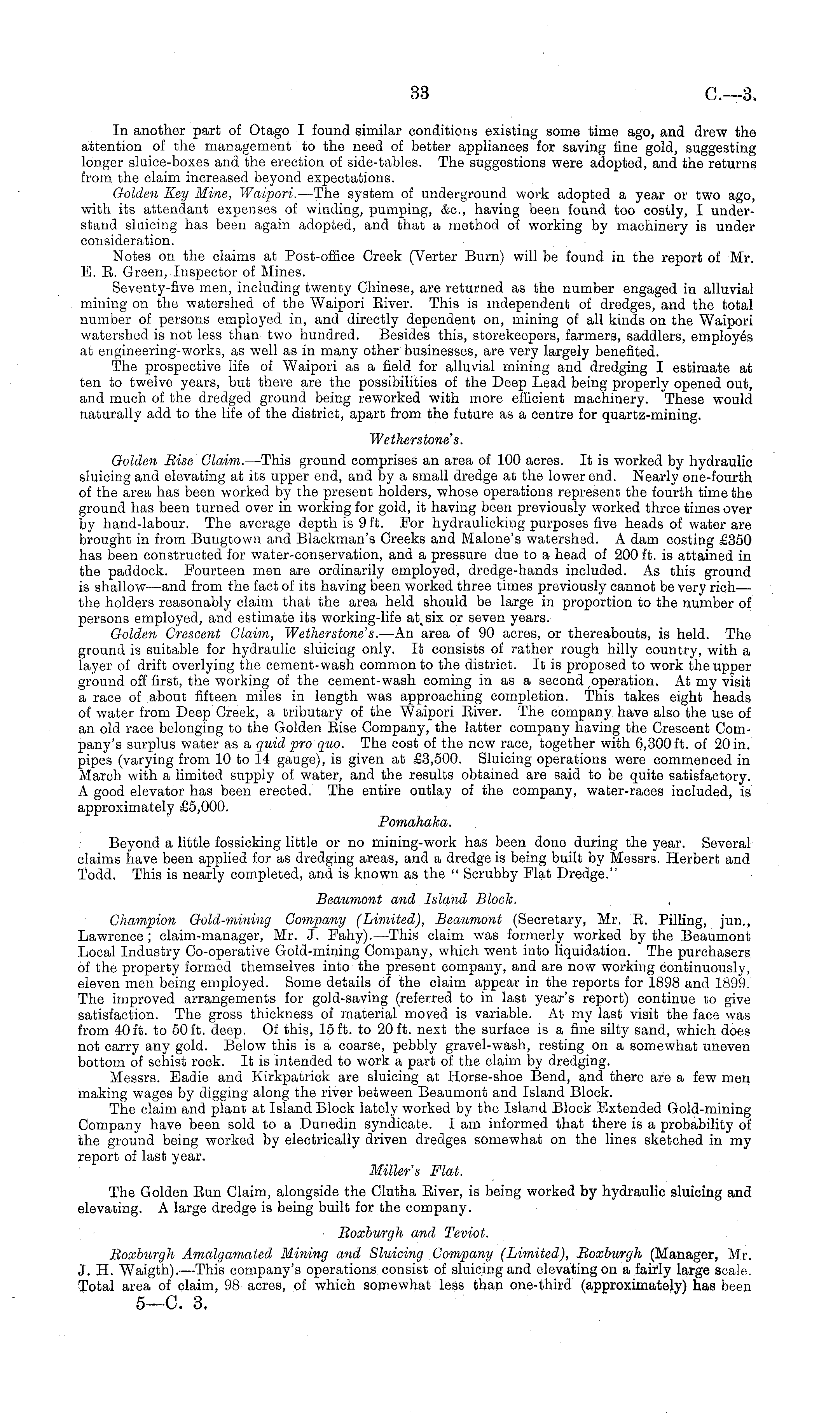 In another part of Otago I found similar conditions existing some time ago, and drew the attention of the management to the need of better appliances for saving fine gold, suggesting longer sluice-boxes and the erection of side-tables. The suggestions were adopted, and the returns from the claim increased beyond expectations. Golden Key Mine, Waipori. —The system of underground work adopted a year or two ago, with its attendant expenses of winding, pumping, &c, having been found too costly, I understand sluicing has been again adopted, and that a method of working by machinery is under consideration. Notes on the claims at Post-office Creek (Verier Burn) will be found in the report of Mr. E. E. Green, Inspector of Mines. Seventy-five men, including twenty Chinese, are returned as the number engaged in alluvial mining on the watershed of the Waipori Eiver. This is independent of dredges, and the total number of persons employed in, and directly dependent on, mining of all kinds on the Waipori watershed is not less than two hundred. Besides this, storekeepers, farmers, saddlers, employes at engineering-works, as well as in many other businesses, are very largely benefited. The prospective life of Waipori as a field for alluvial mining and dredging I estimate at ten to twelve years, but there are the possibilities of the Deep Lead being properly opened out, and much of the dredged ground being reworked with more efficient machinery. These would naturally add to the life of the district, apart from the future as a centre for quartz-mining. Wether stone's. Golden Bise Claim. —This ground comprises an area of 100 acres. It is worked by hydraulic sluicing and elevating at its upper end, and by a small dredge at the lower end. Nearly one-fourth of the area has been worked by the present holders, whose operations represent the fourth time the ground has been turned over in working for gold, it having been previously worked three times over by hand-labour. The average depth is 9 ft. For hydraulicking purposes five heads of water are brought in from Bungtown and Blackman's Creeks and Malone's watershed. A dam costing £350 has been constructed for water-conservation, and a pressure due to a head of 200 ft. is attained in the paddock. Fourteen men are ordinarily employed, dredge-hands included. As this ground is shallow —and from the fact of its having been worked three times previously cannot be very rich— the holders reasonably claim that the area held should be large in proportion to the number of persons employed, and estimate its working-life at. six or seven years. Golden Crescent Claim, Wether stone's. —An area of 90 acres, or thereabouts, is held. The ground is suitable for hydraulic sluicing only. It consists of rather rough hilly country, with a layer of drift overlying the cement-wash common to the district. It is proposed to work the upper ground off first, the working of the cement-wash coming in as a second operation. At my visit a race of about fifteen miles in length was approaching completion. This takes eight heads of water from Deep Creek, a tributary of the Waipori Eiver. The company have also the use of an old race belonging to the Golden Eise Company, the latter company having the Crescent Company's surplus water as a quid pro quo. The cost of the new race, together with 6,300 ft. of 20 in. pipes (varying from 10 to 14 gauge), is given at £3,500. Sluicing operations were commenced in March with a limited supply of water, and the results obtained are said to be quite satisfactory. A good elevator has been erected. The entire outlay of the company, water-races included, is approximately £5,000. Pomahaka. Beyond a little fossicking little or no mining-work has been done during the year. Several claims have been applied for as dredging areas, and a dredge is being built by Messrs. Herbert and Todd. This is nearly completed, and is known as the " Scrubby Flat Dredge." Beaumont and Island Block. Champion Gold-mining Company (Limited), Beaumont (Secretary, Mr. E. Pilling, jun., Lawrence; claim-manager, Mr. J. Fahy).—This claim was formerly worked by the Beaumont Local Industry Co-operative Gold-mining Company, which went into liquidation. The purchasers of the property formed themselves into the present company, and are now working continuously, eleven men being employed. Some details of the claim appear in the reports for 1898 and 1899. The improved arrangements for gold-saving (referred to in last year's report) continue to give satisfaction. The gross thickness of material moved is variable. At my last visit the face was from 40 ft. to 50 ft. deep. Of this, 15 ft. to 20 ft. next the surface is a fine silty sand, which does not carry any gold. Below this is a coarse, pebbly gravel-wash, resting on a somewhat uneven bottom of schist rock. It is intended to work a part of the claim by dredging. Messrs. Eadie and Kirkpatrick are sluicing at Horse-shoe fiend, and there are a few men making wages by digging along the river between Beaumont and Island Block. The claim and plant at Island Block lately worked by the Island Block Extended Gold-mining Company have been sold to a Dunedin syndicate. lam informed that there is a probability of the ground being worked by electrically driven dredges somewhat on the lines sketched in my report of last year. Miller's Flat. The Golden Eun Claim, alongside the Clutha Eiver, is being worked by hydraulic sluicing and elevating. A large dredge is being built for the company. Boxburgh and Teviot. Boxburgh Amalgamated Mining and Sluicing Company (Limited), Boxburgh (Manager, Mr. J. H. Waigth).—This company's operations consist of sluicing and elevating on a fairly large scale. Total area of claim, 98 acres, of which somewhat less than one-third (approximately) has been 5—C. 3.
