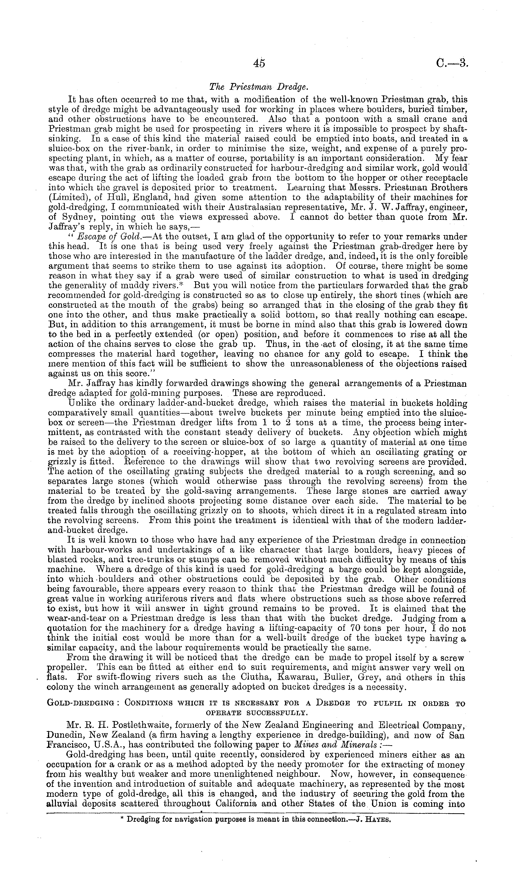 The Priestman Dredge. It has often occurred to me that, with a modification of the well-known Priestman grab, this style of dredge might be advantageously used for working in places where boulders, buried timber, and other obstructions have to be encountered. Also that a pontoon with a small crane and Priestman grab might be used for prospecting in rivers where it is impossible to prospect by shaftsinking. In a case of this kind the material raised could be emptied into boats, and treated in a sluice-box on the river-bank, in order to minimise the size, weight, and expense of a purely prospecting plant, in which, as a matter of course, portability is an important consideration. My fear was that, with the grab as ordinarily constructed for harbour-dredging and similar work, gold would escape during the act of lifting the loaded grab from the bottom to the hopper or other receptacle into which the gravel is deposited prior to treatment. Learning that Messrs. Priestman Brothers (Limited), of Hull, England, had given some attention to the adaptability of their machines for gold-dredging, I communicated with their Australasian representative, Mr. J. W. Jaffray, engineer, of Sydney, pointing out the views expressed above. I cannot do better than quote from Mr. Jaffray's reply, in which he says,— " Escape of Gold. —At the outset, I am glad of the opportunity to refer to your remarks under this head. It is one that is being used very freely against the Priestman grab-dredger here by those who are interested in the manufacture of the ladder dredge, and, indeed, it is the only forcible argument that seems to strike them to use against its adoption. Of course, there might be some reason in what they say if a grab were used of similar construction to what is used in dredging the generality of muddy rivers.* But you will notice from the particulars forwarded that the grab recommended for gold-dredging is constructed so as to close up entirely, the short tines (which are constructed at the mouth of the grabs) being so arranged that in the closing of the grab they fit one into the other, and thus make practically a solid bottom, so that really nothing can escape. But, in addition to this arrangement, it must be borne in mind also that this grab is lowered down to the bed in a perfectly extended (or open) position, and before it commences to rise at all the action of the chains serves to close the grab up. Thus, in the act of closing, it at the same time compresses the material hard together, leaving no chance for any gold to escape. I think the mere mention of this fact will be sufficient to show the unreasonableness of the objections raised against us on this score." Mr. Jaffray has kindly forwarded drawings showing the general arrangements of a Priestman dredge adapted for gold-mining purposes. These are reproduced. Unlike the ordinary ladder-and-bucket dredge, which raises the material in buckets holding comparatively small quantities—about twelve buckets per minute being emptied into the sluicebox or screen—the Priestman dredger lifts from 1 to 2 tons at a time, the process being intermittent, as contrasted with the constant steady delivery of buckets. Any objection which might be raised to the delivery to the screen or sluice-box of so large a quantity of material at one time is met by the adoption of a receiving-hopper, at the bottom of which an oscillating grating or grizzly is fitted. Beference to the drawings will show that two revolving screens are provided. The action of the oscillating grating subjects the dredged material to a rough screening, and so separates large stones (which would otherwise pass through the revolving screens) from the material to be treated by the gold-saving arrangements. These large stones are carried away from the dredge by inclined shoots projecting some distance over each side. The material to be treated falls through the oscillating grizzly on to shoots, which direct it in a regulated stream into the revolving screens. From this point the treatment is identical with that of the modern ladder-and-bucket dredge. It is well known to those who have had any experience of the Priestman dredge in connection with harbour-works and undertakings of a like character that large boulders, heavy pieces of blasted rocks, and tree-trunks or stumps can be removed without much difficulty by means of this machine. Where a dredge of this kind is used for gold-dredging a barge could be kept alongside, into which -boulders and other obstructions could be deposited by the grab. Other conditions being favourable, there appears every reason to think that the Priestman dredge will be found of great value in working auriferous rivers and flats where obstructions such as those above referred to exist, but how it will answer in tight ground remains to be proved. It is claimed that the wear-and-tear on a Priestman dredge is less than that with the bucket dredge. Judging from a quotation for the machinery for a dredge having a lifting-capacity of 70 tons per hour, I do not think the initial cost would be more than for a well-built dredge of the bucket type having a similar capacity, and the labour requirements would be practically the same. From the drawing it will be noticed that the dredge can be made to propel itself by a screw propeller. This can be fitted at either end to suit requirements, and might answer very well on flats. For swift-flowing rivers such as the Clutha, Kawarau, Buller, Grey, and others in this colony the winch arrangement as generally adopted on bucket dredges is a necessity. Gold-deedging : Conditions which it is necessaey fob a Deedge to fulfil in oedee to opeeate successfully. Mr. B. H. Postlethwaite, formerly of the New Zealand Engineering and Electrical Company, Dunedin, New Zealand (a firm having a lengthy experience in dredge-building), and now of San Francisco, U.S.A., has contributed the following paper to Mines and Minerals : — Gold-dredging has bee
