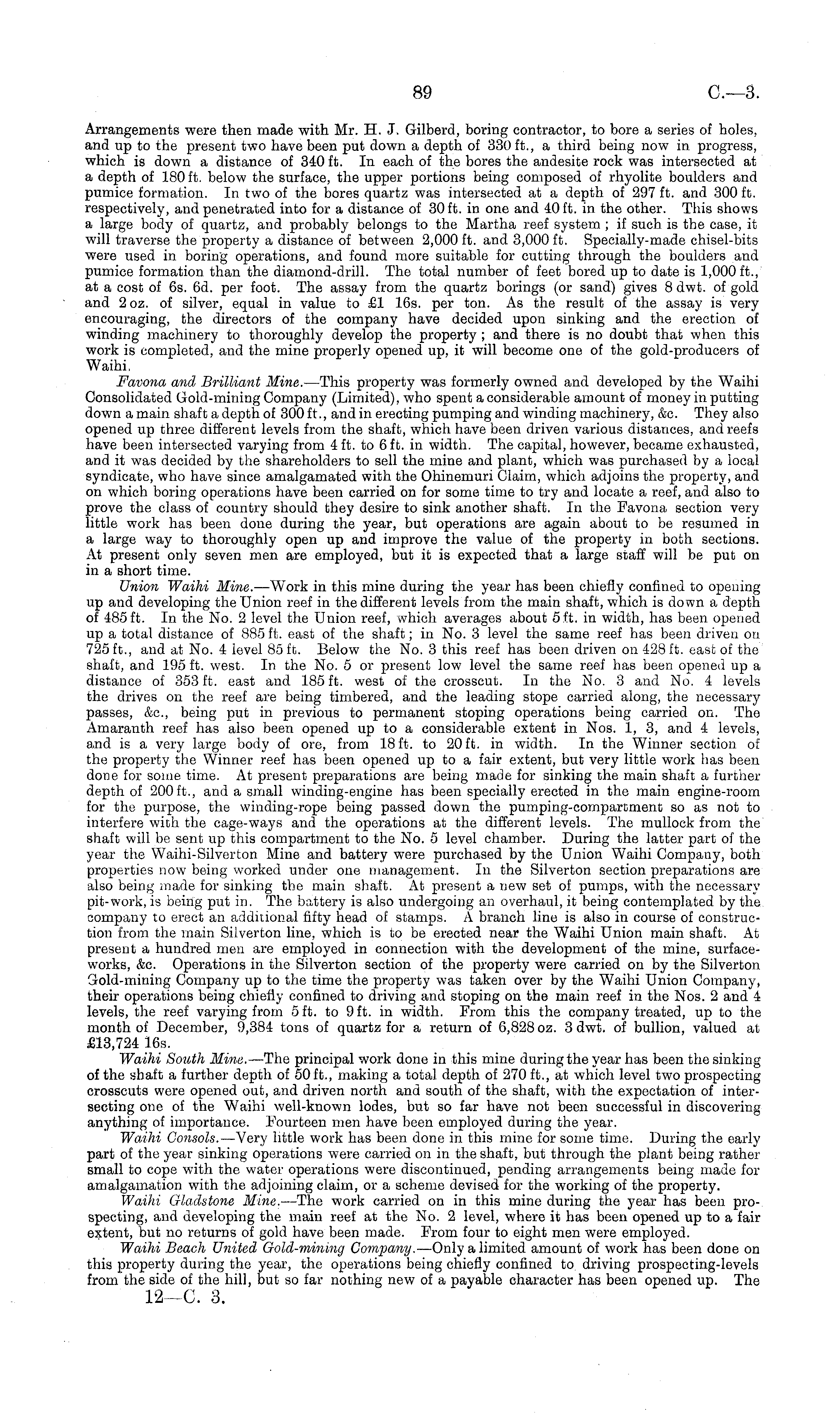 Arrangements were then made with Mr. H. J. Gilberd, boring contractor, to bore a series of holes, and up to the present two have been put down a depth of 330 ft., a third being now in progress, which is down a distance of 340 ft. In each of the bores the andesite rock was intersected at a depth of 180 ft. below the surface, the upper portions being composed of rhyolite boulders and pumice formation. In two of the bores quartz was intersected at a depth of 297 ft. and 300 ft. respectively, and penetrated into for a distance of 30 ft. in one and 40 ft. in the other. This shows a large body of quartz, and probably belongs to the Martha reef system ; if such is the case, it will traverse the property a distance of between 2,000 ft. and 3,000 ft. Specially-made chisel-bits were used in boring operations, and found more suitable for cutting through the boulders and pumice formation than the diamond-drill. The total number of feet bored up to date is 1,000 ft., at a cost of 6s. 6d. per foot. The assay from the quartz borings (or sand) gives 8 dwt. of gold and 2 oz. of silver, equal in value to £1 16s. per ton. As the result of the assay is very encouraging, the directors of the company have decided upon sinking and the erection of winding machinery to thoroughly develop the property ; and there is no doubt that when this work is completed, and the mine properly opened up, it will become one of the gold-producers of Waihi, Favona and Brilliant Mine. —This property was formerly owned and developed by the Waihi Consolidated Gold-mining Company (Limited), who spent a considerable amount of money in putting down a main shaft a depth of 300 ft., and in erecting pumping and winding machinery, &c. They also opened up three different levels from the shaft, which have been driven various distances, and reefs have been intersected varying from 4 ft. to 6 ft. in width. The capital, however, became exhausted, and it was decided by the shareholders to sell the mine and plant, which was purchased by a local syndicate, who have since amalgamated with the Ohinemuri Claim, which adjoins the property, and on which boring operations have been carried on for some time to try and locate a reef, and also to prove the class of country should they desire to sink another shaft. In the Favona section very little work has been done during the year, but operations are again about to be resumed in a large way to thoroughly open up and improve the value of the property in both sections. At present only seven men are employed, but it is expected that a large staff will be put on in a short time. Union Waihi Mine. —Work in this mine during the year has been chiefly confined to opening up and developing the Union reef in the different levels from the main shaft, which is down a depth of 485 ft. In the No. 2 level the Union reef, which averages about 5 ft. in width, has been opened up a total distance of 885 ft. east of the shaft; in No. 3 level the same reef has been driven ou 725 ft., and at No. 4 level 85 ft. Below the No. 3 this reef has been driven on 428 ft. east of the shaft, and 195 ft. west. In the No. 5 or present low level the same reef has been opened up a distance of 353 ft. east and 185 ft. west of the crosscut. In the No. 3 and No. 4 levels the drives on the reef are being timbered, and the leading stope carried along, the necessary passes, &c, being put in previous to permanent stoping operations being carried on. The Amaranth reef has also been opened up to a considerable extent in Nos. 1, 3, and 4 levels, and is a very large body of ore, from 18 ft. to 20 ft. in width. In the Winner section of the property the Winner reef has been opened up to a fair extent, but very little work has been done for some time. At present preparations are being made for sinking the main shaft a further depth of 200 ft., and a small winding-engine has been specially erected in the main engine-room for the purpose, the winding-rope being passed down the pumping-compartment so as not to interfere with the cage-ways and the operations at the different levels. The mullock from the shaft will be sent up this compartment to the No. 5 level chamber. During the latter part of the year the Waihi-Silverton Mine and battery were purchased by the Union Waihi Company, both properties now being worked under one management. In the Silverton section preparations are also being made for sinking the main shaft. At present a new set of pumps, with the necessary pit-work, is being put in. The battery is also undergoing an overhaul, it being contemplated by the company to erect an additional fifty head of stamps. A branch line is also in course of construction from the main Silverton line, which is to be erected near the Waihi Union main shaft. At present a hundred men are employed in connection with the development of the mine, surfaceworks, &c. Operations in the Silverton section of the property were carried on by the Silverton Gold-mining Company up to the time the property was taken over by the Waihi Union Company, their operations being chiefly confined to driving and stoping on the main reef in the Nos. 2 and 4 levels, the reef varying from 5 ft. to 9 ft. in width. From this the company treated, up to the month of December, 9,384 tons of quartz for a return of 6,828 oz. 3 dwt. of bullion, valued at £13,724 16s. Waihi South Mine. —The principal work done in this mine during the year has been the sinking of the shaft a further depth of 50 ft., making a total depth of 270 ft., at which level two prospecting crosscuts were opened out, and driven north and south of the shaft, with the expectation of intersecting one of the Waihi well-known lodes, but so far have not been successful in discovering anything of importance. Fourteen men have been employed during the year. Waihi Consols. —Very little work has been done in this mine for some time. During the early part of the year sinking operations were carried on in the shaft, but through the pla