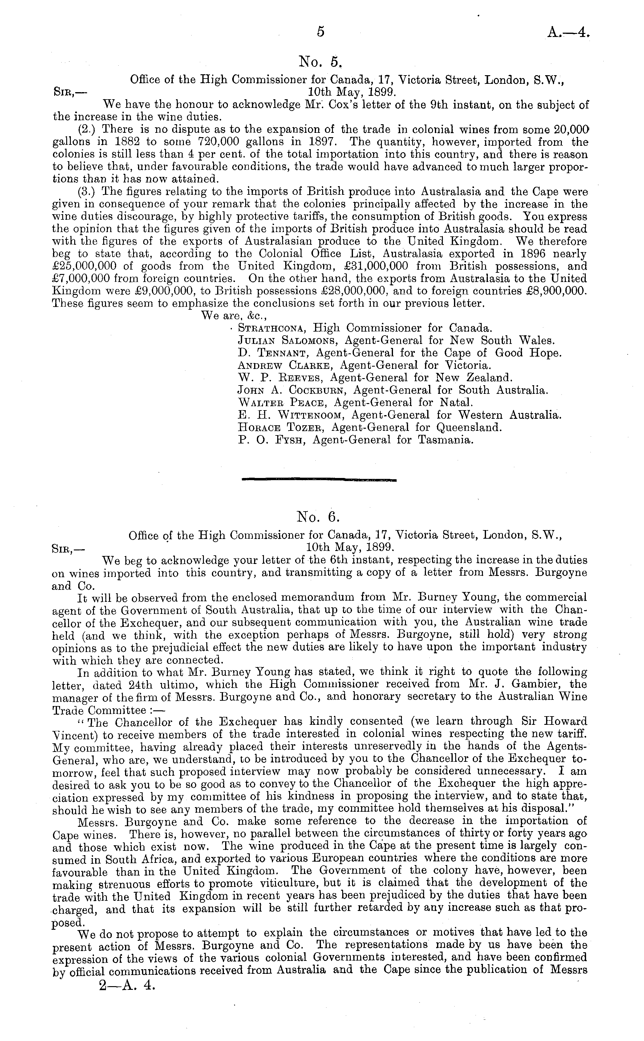No. 5. Office of the High Commissioner for Canada, 17, Victoria Street, London, S.W., Sib,— 10th May, 1899. We have the honour to acknowledge Mr. Cox's letter of the 9th instant, on the subject of the increase in the wine duties. (2.) There is no dispute as to the expansion of the trade in colonial wines from some 20,000 gallons in 1882 to some 720,000 gallons in 1897. The quantity, however, imported from the colonies is still less than 4 per cent, of the total importation into this country, and there is reason to believe that, under favourable conditions, the trade would have advanced to much larger proportions than it has now attained. (3.) The figures relating to the imports of British produce into Australasia and the Cape were given in consequence of your remark that the colonies principally affected by the increase in the wine duties discourage, by highly protective tariffs, the consumption of British goods. You express the opinion that the figures given of the imports of British produce into Australasia should be read with the figures of the exports of Australasian produce to the United Kingdom. We therefore beg to state that, according to the Colonial Office List, Australasia exported in 1896 nearly £25,000,000 of goods from the United Kingdom, £31,000,000 from British possessions, and £7,000,000 from foreign countries. On the other hand, the exports from Australasia to the United Kingdom were £9,000,000, to British possessions £28,000,000, and to foreign countries £8,900,000. These figures seem to emphasize the conclusions set forth in our previous letter. We are, &c, • Stkathcona, High Commissioner for Canada. Julian Salomons, Agent-General for New South Wales. D. Tbnnant, Agent-General for the Cape of Good Hope. Andbew Clarke, Agent-General for Victoria. W. P. Eeeves, Agent-General for New Zealand. John A. Cookbubn, Agent-General for South Australia. Walter Peace, Agent-General for Natal. E. H. WiTTBNOOM, Agent-General for Western Australia. Horace Tozer, Agent-General for Queensland. P. O. Pysh, Agent-General for Tasmania.