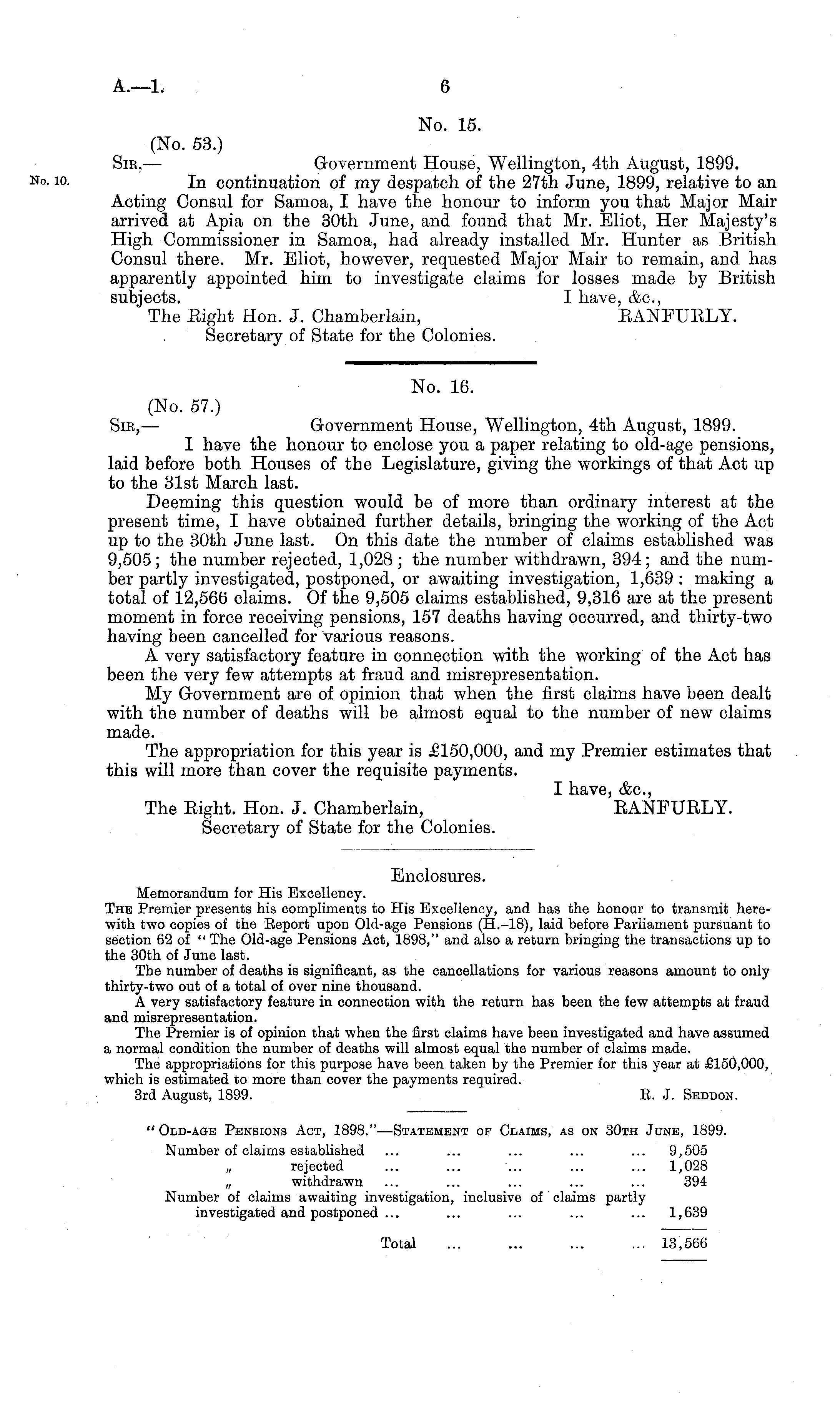 Enclosures. Memorandum for His Excellency. The Premier presents his compliments to His Excellency, and has the honour to transmit herewith two copies of the Report upon Old-age Pensions (H.-18), laid before Parliament pursuant to section 62 of " The Old-age Pensions Act, 1898," and also a return bringing the transactions up to the 30th of June last. The number of deaths is significant, as the cancellations for various reasons amount to only thirty-two out of a total of over nine thousand. A very satisfactory feature in connection with the return has been the few attempts at fraud and misrepresentation. The Premier is of opinion that when the first claims have been investigated and have assumed a normal condition the number of deaths will almost equal the number of claims made. The appropriations for this purpose have been taken by the Premier for this year at £150,000, which is estimated to more than cover the payments required. 3rd August, 1899. R. J. Seddon.