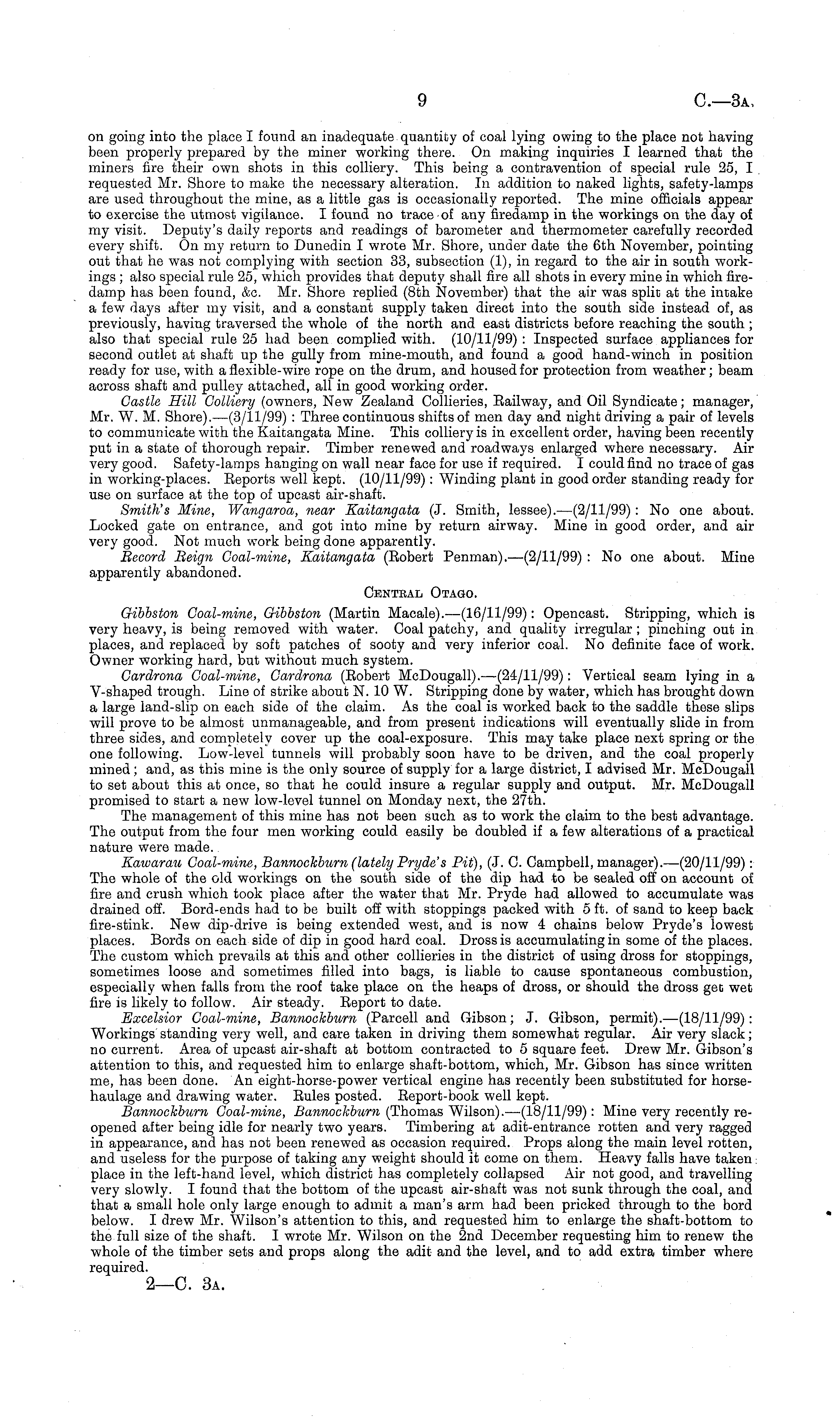 on going into the place I found an inadequate quantity of coal lying owing to the place not having been properly prepared by the miner working there. On making inquiries I learned that the miners fire their own shots in this colliery. This being a contravention of special rule 25, I requested Mr. Shore to make the necessary alteration. In addition to naked lights, safety-lamps are used throughout the mine, as a little gas is occasionally reported. The mine officials appear to exercise the utmost vigilance. I found no trace of any firedamp in the workings on the day of my visit. Deputy's daily reports and readings of barometer and thermometer carefully recorded every shift. On my return to Dunedin I wrote Mr. Shore, under date the 6th November, pointing out that he was not complying with section 33, subsection (1), in regard to the air in south workings ; also special rule 25, which provides that deputy shall fire all shots in every mine in which firedamp has been found, &c. Mr. Shore replied (Bth November) that the air was split at the intake a few days after my visit, and a constant supply taken direct into the south side instead of, as previously, having traversed the whole of the north and east districts before reaching the south ; also that special rule 25 had been complied with. (10/11/99) : Inspected surface appliances for second outlet at shaft up the gully from mine-mouth, and found a good hand-winch in position ready for use, with a flexible-wire rope on the drum, and housed for protection from weather; beam across shaft and pulley attached, all in good working order. Castle Hill Colliery (owners, New Zealand Collieries, Railway, and Oil Syndicate; manager, Mr. W. M. Shore). —(3/11/99) : Three continuous shifts of men day and night driving a pair of levels to communicate with the Kaitangata Mine. This colliery is in excellent order, having been recently put in a state of thorough repair. Timber renewed and roadways enlarged where necessary. Air very good. Safety-lamps hanging on wall near face for use if required. I could find no trace of gas in working-places. Reports well kept. (10/11/99): Winding plant in good order standing ready for use on surface at the top of upcast air-shaft. Smith's Mine, Wangaroa, near Kaitangata (J. Smith, lessee). —(2/11/99): No one about. Locked gate on entrance, and got into mine by return airway. Mine in good order, and air very good. Not much work being done apparently. Record Reign Coal-mine, Kaitangata (Robert Penman). —(2/11/99) : No one about. Mine apparently abandoned. Obnteal Otago. Gibbston Coal-mine, Gibbston (Martin Macale). —(16/11/99): Opencast. Stripping, which is very heavy, is being removed with water. Coal patchy, and quality irregular; pinching out in places, and replaced by soft patches of sooty and very inferior coal. No definite face of work. Owner working hard, but without much system. Cardrona Goal-mine, Cardrona (Robert McDougall).—(24/11/99): Vertical seam lying in a V-shaped trough. Line of strike about N. 10 W. Stripping done by water, which has brought down a large land-slip on each side of the claim. As the coal is worked back to the saddle these slips will prove to be almost unmanageable, and from present indications will eventually slide in from three sides, and completely cover up the coal-exposure. This may take place next spring or the one following. Low-level tunnels will probably soon have to be driven, and the coal properly mined; and, as this mine is the only source of supply for a large district, I advised Mr. McDougall to set about this at once, so that he could insure a regular supply and output. Mr. McDougall promised to start a new low-level tunnel on Monday next, the 27th. The management of this mine has not been such as to work the claim to the best advantage. The output from the four men working could easily be doubled if a few alterations of a practical nature were made. Kawarau Coal-mine, Bannockburn (lately Pryde's Pit), (J. C. Campbell, manager).—(2o/11/99): The whole of the old workings on the south side of the dip had to be sealed off on account of fire and crush which took place after the water that Mr. Pryde had allowed to accumulate was drained off. Bord-ends had to be built off with stoppings packed with 5 ft. of sand to keep back fire-stink. New dip-drive is being extended west, and is now 4 chains below Pryde's lowest places. Bords on each side of dip in good hard coal. Dross is accumulating in some of the places. The custom which prevails at this and other collieries in the district of using dross for stoppings, sometimes loose and sometimes filled into bags, is liable to cause spontaneous combustion, especially when falls from the roof take place on the heaps of dross, or should the dross get wet fire is likely to follow. Air steady. Report to date. Excelsior Coal-mine, Bannockburn (Parcell and Gibson; J. Gibson, permit).—(lß/11/99): Workings standing very well, and care taken in driving them somewhat regular. Air very slack; no current. Area of upcast air-shaft at bottom contracted to 5 square feet. Drew Mr. Gibson's attention to this, and requested him to enlarge shaft-bottom, which, Mr. Gibson has since written me, has been done. An eight-horse-power vertical engine has recently been substituted for horsehaulage and drawing water. Rules posted. Report-book well kept. Bannockburn Coal-mine, Bannockburn (Thomas Wilson). —(18/11/99): Mine very recently reopened after being idle for nearly two years. Timbering at adit-entrance rotten and very ragged in appearance, and has not been renewed as occasion required. Props along the main level rotten, and useless for the purpose of taking any weight should it come on them. Heavy falls have taken. place in the left-hand level, which district has completely collapsed Air not good, and travelling very slowly. I found that the bottom of the upcast air-shaft was not sunk through the coal, and that a small hole only large enough to admi