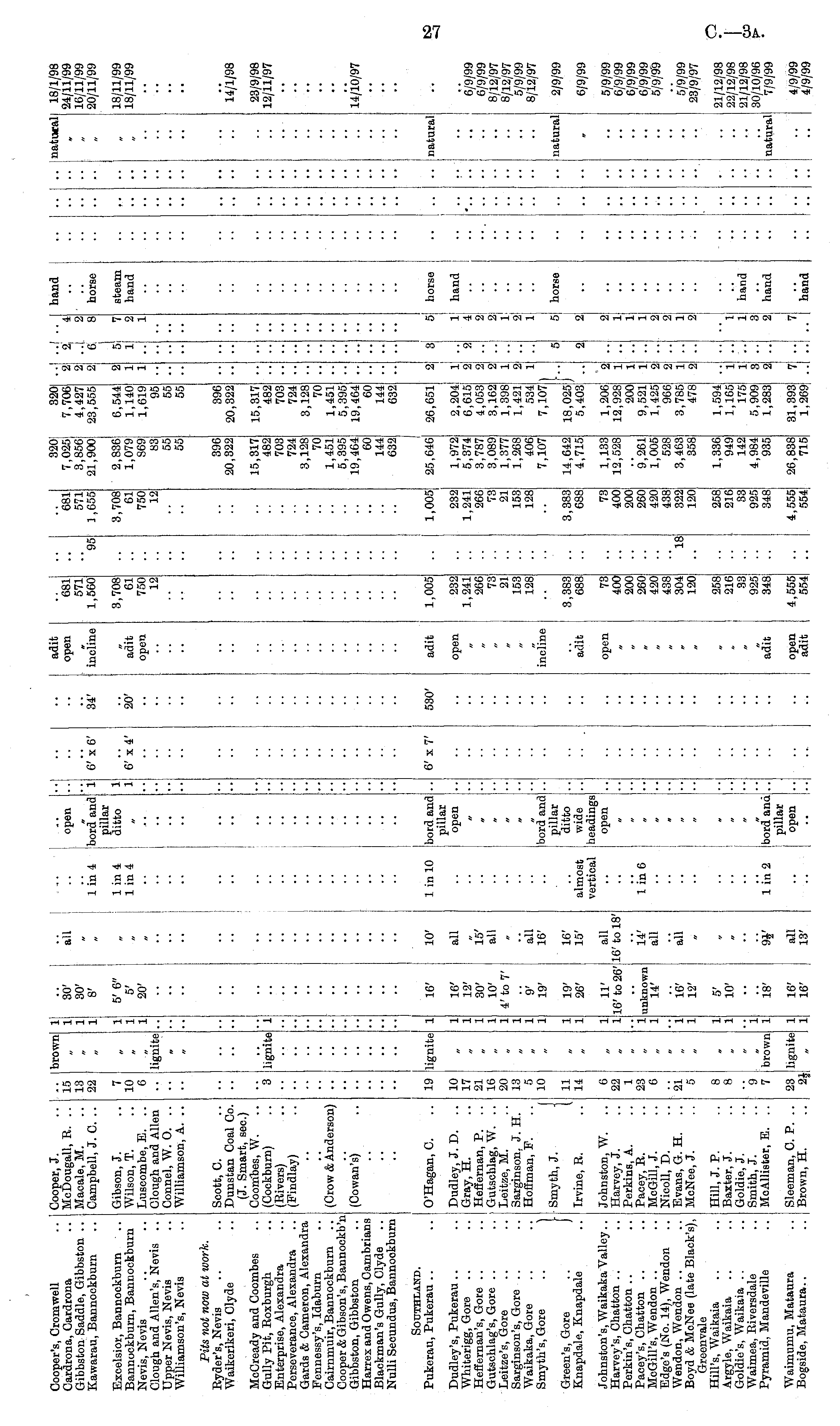 Cooper's, Cromwell Cardrona, Cardrona Gibbston Saddle, Gibbston .. Kawarau, Bannockburn Cooper, J. McDougall, R. .. Macale, M. Campbell, J. C. .. 15 13 22 brownl " * 1 1 1 30' 30' 8' all 1 in 4 1 in 4 1 in 4 open bord and pillar ditto 6'x6' 34' adit open incline 681 571 1,560 "95 681 571 1,655 7,025 3,856 21,900 7,706 4,427 23,555 2 2 2 4 2 8 hand natural 24/11/99 16/11/99 20/11/99 i t horse Excelsior, Bannockburn Bannockburn, Bannockburn Nevis, Nevis Clough and Allen's, Nevis .. Upper Nevis, Nevis Williamson's, Nevis Gibson, J. Wilson, T. Lusoombe, E. .. Clough and Allen Connel, W. 0. Williamson, A. .. 7 10 6 lignite 1 1 1 5'6" 5' 20' ! 1 1 6'x4' 20' adit open 3,708 61 750 12 3,708 61 750 12 2,836 1,079 869 83 55 55 6,544 1,140 1,619 95 55 55 2 1 1 5! 1 7 2 1 steam hand 18/11/99 18/11/99 tr •■I • • Pits not now at work. Ryder's, Nevis Waikerikeri, Clyde Scott, C. Dunstan Coal Co. (J. Smart, sec.) Coombes, W. (Cockburn) (Rivers) (Findlay) 396 20,322 396 20,322 14'/l/98 McCready and Coombes Gully Pit, Roxburgh Enterprise, Alexandra Perseverance, Alexandra Gards & Cameron, Alexandra Fennessy's, Idaburn Cairnmuir, Bannockburn Cooper & Gibson's, Bannockb'n Gibbston, Gibbston Harrex and Owens, Cambrians Blackman's Gully, Clyde .. Nulli Secundus, Bannockburn (Crow & Anderson) 3 lignite 1 • • •• ,. •• - - - 15,317 482 703 724 3,128 70 1,451 5,395 19,464 60 144 632 15,317 482 703 724 3,128 70 1,451 5,395 19,464 60 144 632 i •• - •• 23/9/98 12/11/97 - (Cowan's) .. 14/10/97 i - Southland. Pukerau, Pukerau O'Hagan, C. lignite 16' 10' all 1 in 10 bord and pillar open 6'x7' 530' adit 1,005 1,005 1 25,646 26,651 horse j natural 19 Dudley's, Pukerau Whiterigg, Gore Heffernan's, Gore Gutschlag's, Gore .. Leitze's, Gore Sarginson's, Gore Waikaka, Gore Smyth's, Gore .. Green's, Gore .. j Knapdale, Knapdale Dudley, J. D. .. Gray, H. Heffernan, P. .. Gutschlag, W. .. Leitze, M. Sarginson, J. H. Hofiman, P. • Smyth, J. j 10 17 21 16 20 13 5 10 1 1 1 1 1 1 1 1 16' 12' 30' 10' 4' to 7' 15' all open 232 1,241 266 73 21 153 128 232 1,241 266 73 21 153 128 1,972 5,374 3,787 3,089 1,377 1,268 406 7,107 2,204 6,615 4,053 3,162 1,398 1,421 534 7,107 1 2 2| 2 1 2 1 2 •• 1 4 hand i - i •■ 6/9/99 6/9/99 8/12/97 8/12/97 5/9/99 8/12/97 ••I - 9' 19' ail 16' 16' 15' all 16' to 18' almost vertical bord and pillar ditto wide headings open •• 1 " incline •• 11 14 19' 26' adit 3,383 688 3,383 688 14,642 4,715 18,025 5,403j 1 5 5 horse natural 2/9/99 1 1 2 6/9/99 Irvine, R. •• Johnston's, Waikaka Valley.. Harvey's, Chatton Perkin's, Chatton Paeey's, Chatton McGill's, Wendon Edge's (No. 14), Wendon Wendon, Wendon Boyd & MeNee (late Black's), Green vale Hill's, Waikaia Argyle, Waikaia Goldie's, Waikaia Waimea, Riversdale Pyramid, Mandeville Johnston, W. Harvey, J. Perkins, A. Pacey, R. MoGill, J. Nicoll, D. Evans, G. H. MoNee, J. 6 22 1 23 6 1 1 1 1 11' 16' to 26' •• unknown 14' 14' all 1 in 6 i . open 73 400 200 260 420 438 304 120 •• - 73 400 200 260 420 438 322 120 1,133 12,528 9,261 1,005 528 3,463 358 1,206 12,928 200 9,521 1,425 966 3,785 478 2 1 1 1 2 2 1 2 2 1 2. - I 5/9/99 6/9/99 6/9/99 6/9/99 5/9/99 I 21 5 " 1 16' 12' all " "l8 5*/9/99 23/9/97 •• " Hill, J. P. Baxter, J. Goldie, J. Smith, J. MoAllister, E. .. 8 8 9 7 ! • 1 1 5' 10' ■ 258 216 33 925 348 •• I 258 216 33 925 348 1,336 949 142 4,984 935 1,594 1,165 175 5,909 1,283 3 2 "l 1 hand 21/12/98 22/12/98 21/12/98 30/10/96 7/9/99 brown 1 1 18' all 13' 1 in 2 bord and ; pillar open adit natural hand Waimumu, Mataura Bogside, Mataura.. Sleeman, C. P. Brown, H. 23 lignite 1 1 16' 16' open adit 4,555 554 4,555 554 26,838 715 31,393 1,269 7 7 hand 4/9/99 4/9/99 I . 1 .. ..I .. i I .. ..
