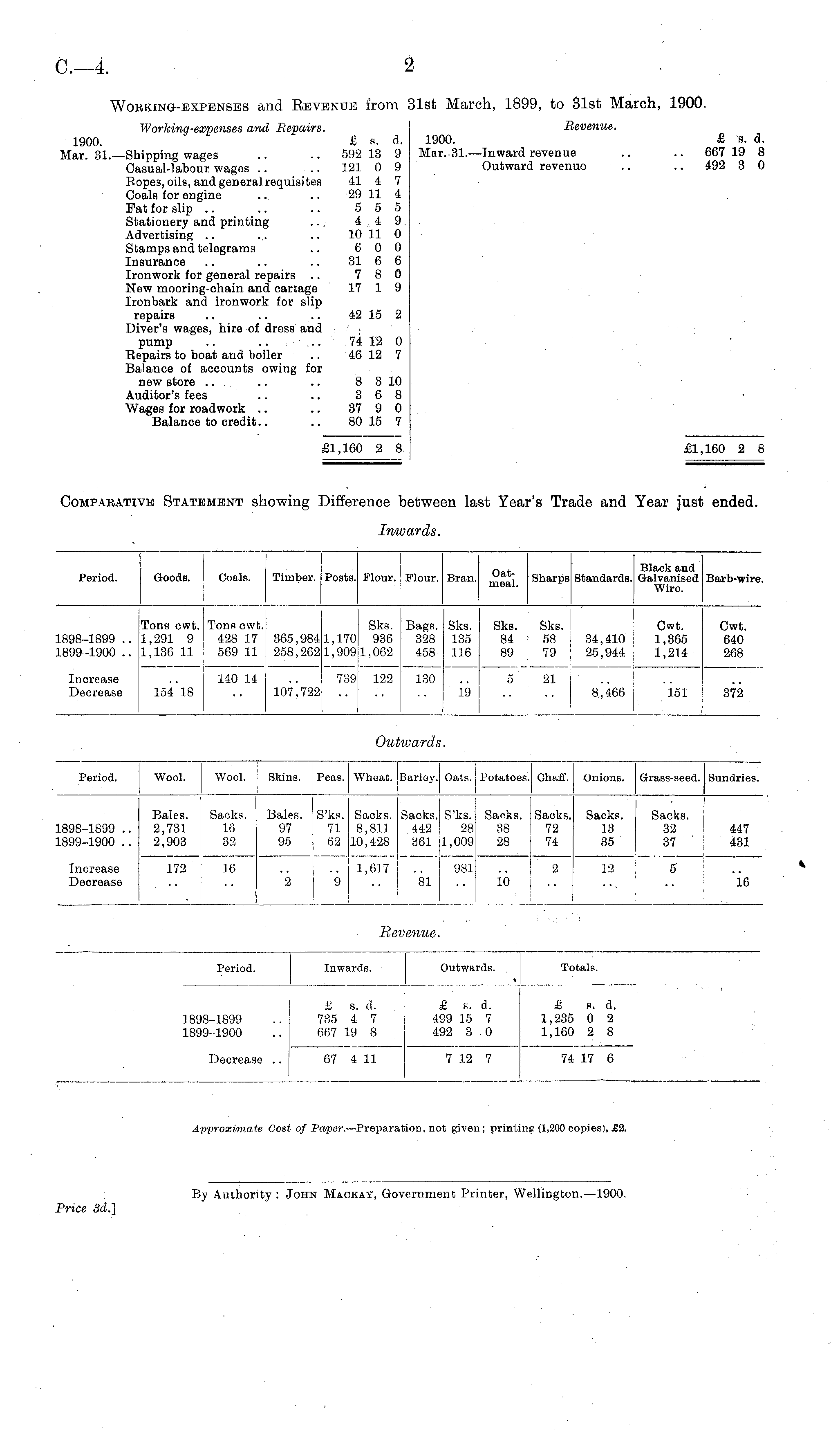 Inwar, ',S. Period. Goods. Coals. Timber. Posts. Flour. Flour. Bran. meal shar P s Standards. Black and Galvanised Wire. Barb-wire. Tons cwt. 1,291 9 1,136 11 Tons cwt. 428 17 569 11 i Sks. 1,170 936 l,909il,062 Bags. 328 458 Sks. 135 116 Sks. Sks. 84 58 : 34,410 89 79 25,944 5 21 ; .. .. 8,466 Cwt. 1,365 1,214 Cwt. 640 268 .898-1899 .. .899-1900 .. 365,984 258,262 Increase Decrease 154 18 140 14 107,722 739 122 130 19 151 372 Ou 'ward's ■ Period. Wool. Wool. Skins. Peas. Wheat. Bariey. Oats. Potatoes. Chaff. Onions. Grass-seed. Sundries. 1898-1899 .. 1899-1900 .. Bales. Sacks. 2,731 16 2,903 32 Bales. S'ks. Sacks. Sacks. S'ks. 97 71 8,811 442 28 95 62 10,428 361 ! 1,009 Sacks. Sacks. 38 72 28 j 74 Sacks. Sacks. 13 32 447 35 37 431 12 5 16 t Increase Decrease 172 16 2 .. 1,617 9 981 81 10 2 Revenue. Period. Inwards. Outwards. Totals. 1898-1899 1899-1900 Decrease .. £ s. d. 735 4 7 667 19 8 67 4 11 £ s. d. 499 15 7 492 3 0 7 12 7 £ s. d. 1,235 0 2 1,160 2 8 67 4 11 7 12 7 74 17 6