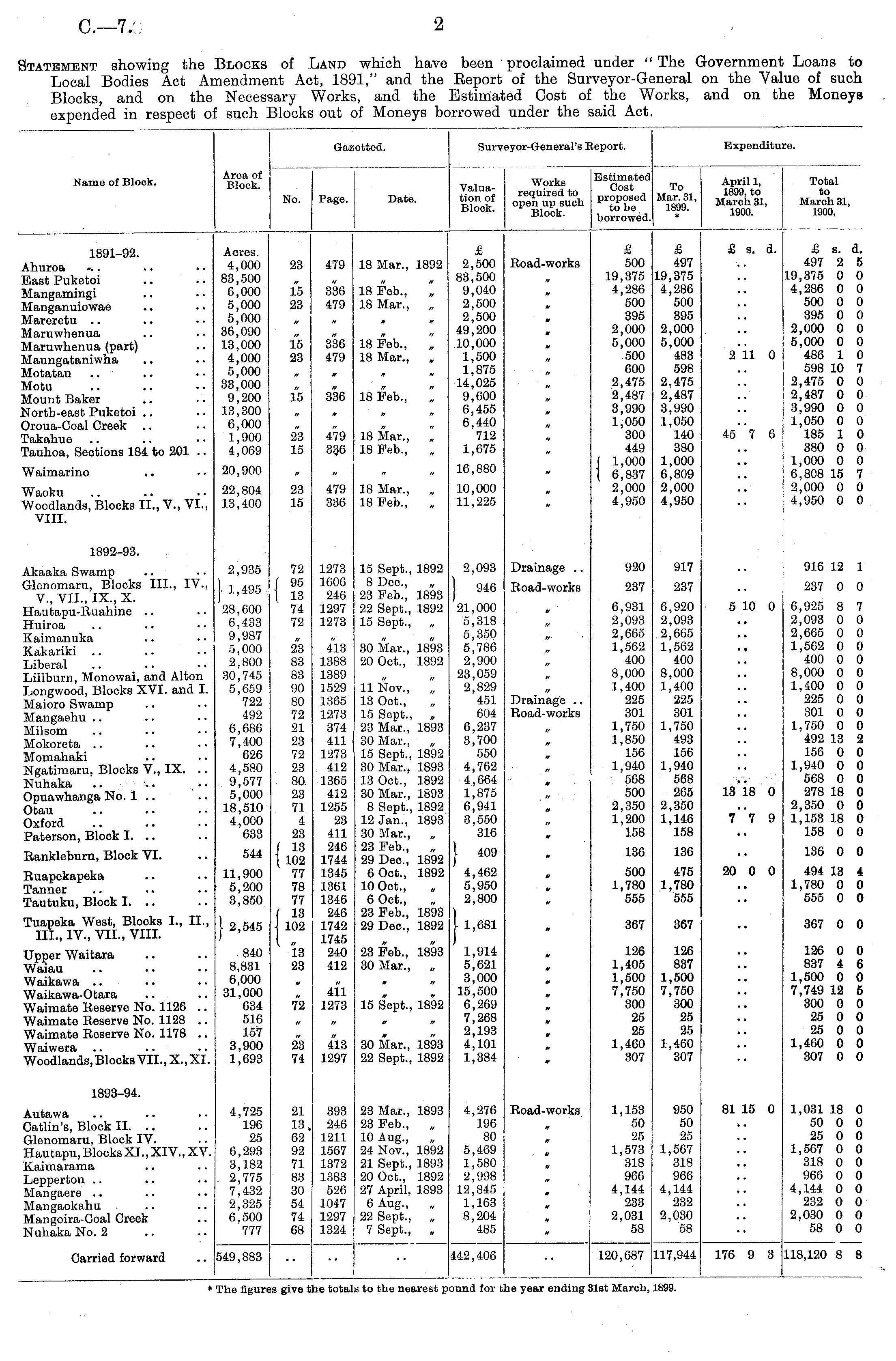 Statement showing the Blocks of Land which have been proclaimed under "The Government Loans to Local Bodies Act Amendment Act, 1891," and the Report of the Surveyor-General on the Value of such Blocks, and on the Necessary Works, and the Estimated Cost of the Works, and on the Moneys expended in respect of such Blocks out of Moneys borrowed under the said Act.