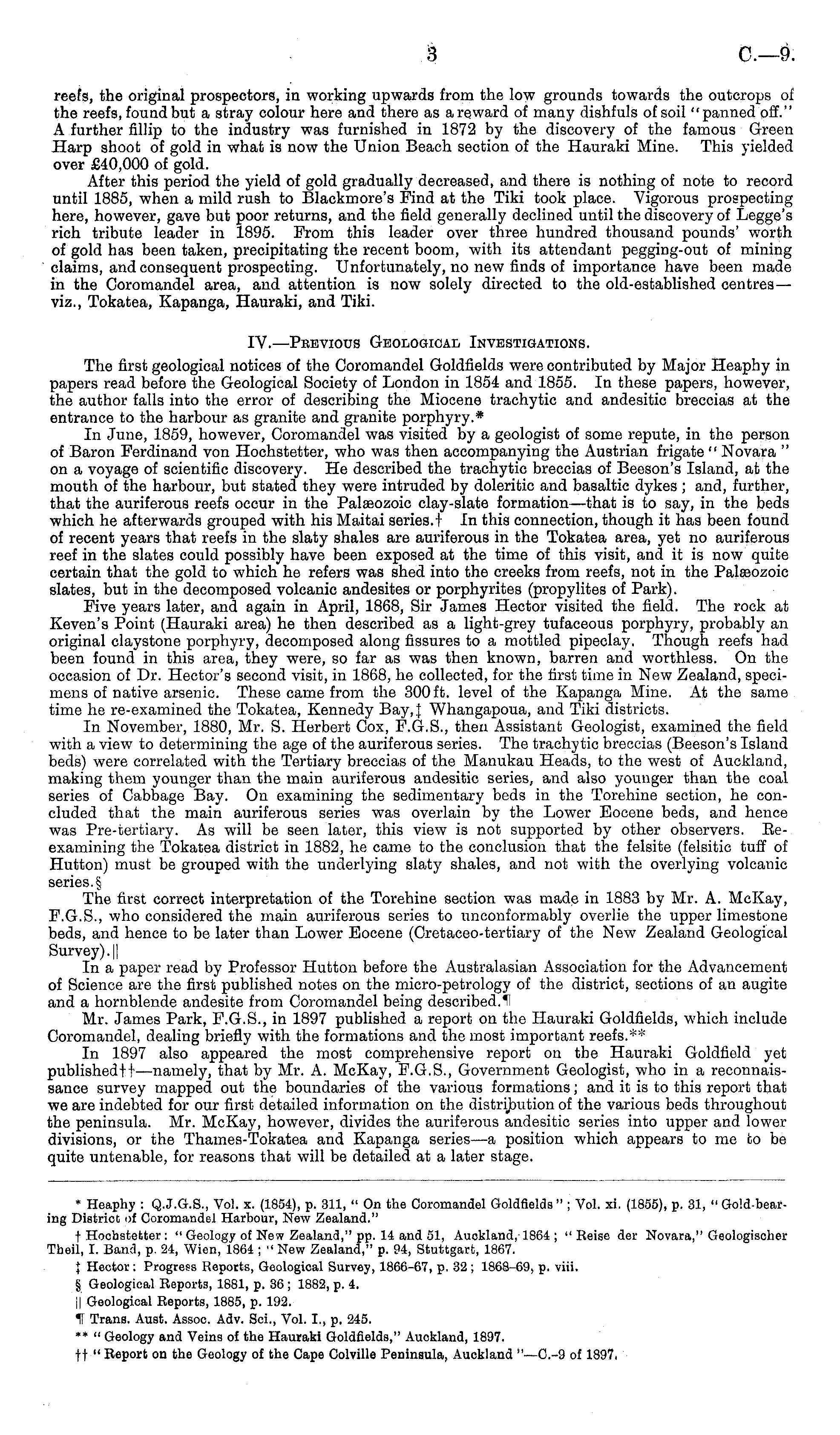 * Heaphy : Q.J.G.S., Vol. x. (1854), p. 311, " On the Ooromandel Goldflelds " ; Vol. xi, (1835), p. 31, " Gold-bear-ing District of Coromandel Harbour, New Zealand." f Hoohstetter: " Geology of New Zealand," pp. 14 and 31, Auokland, 1864; " Reise der Novara," Geologisoher Tbeil, I. Band, p. 24, Wien, 1864 ; " New Zealand," p. 94, Stuttgart, 1867. J Hector: Progress Reports, Geological Survey, 1866-67, p. 32 ; 1868-69, p. viii. § Geological Reports, 1881, p. 36 ; 1882, p. i. j| Geological Reports, 1885, p. 192. IF Trana. Aust. Assoc. Adv. Sci., Vol. 1., p. 245. ** " Geology and Veins of the Hauraki Goldfields," Auckland, 1897. ft " Report on the Geology of the Cape Colville Peninsula, Auckland "—C.-9 of 1897.