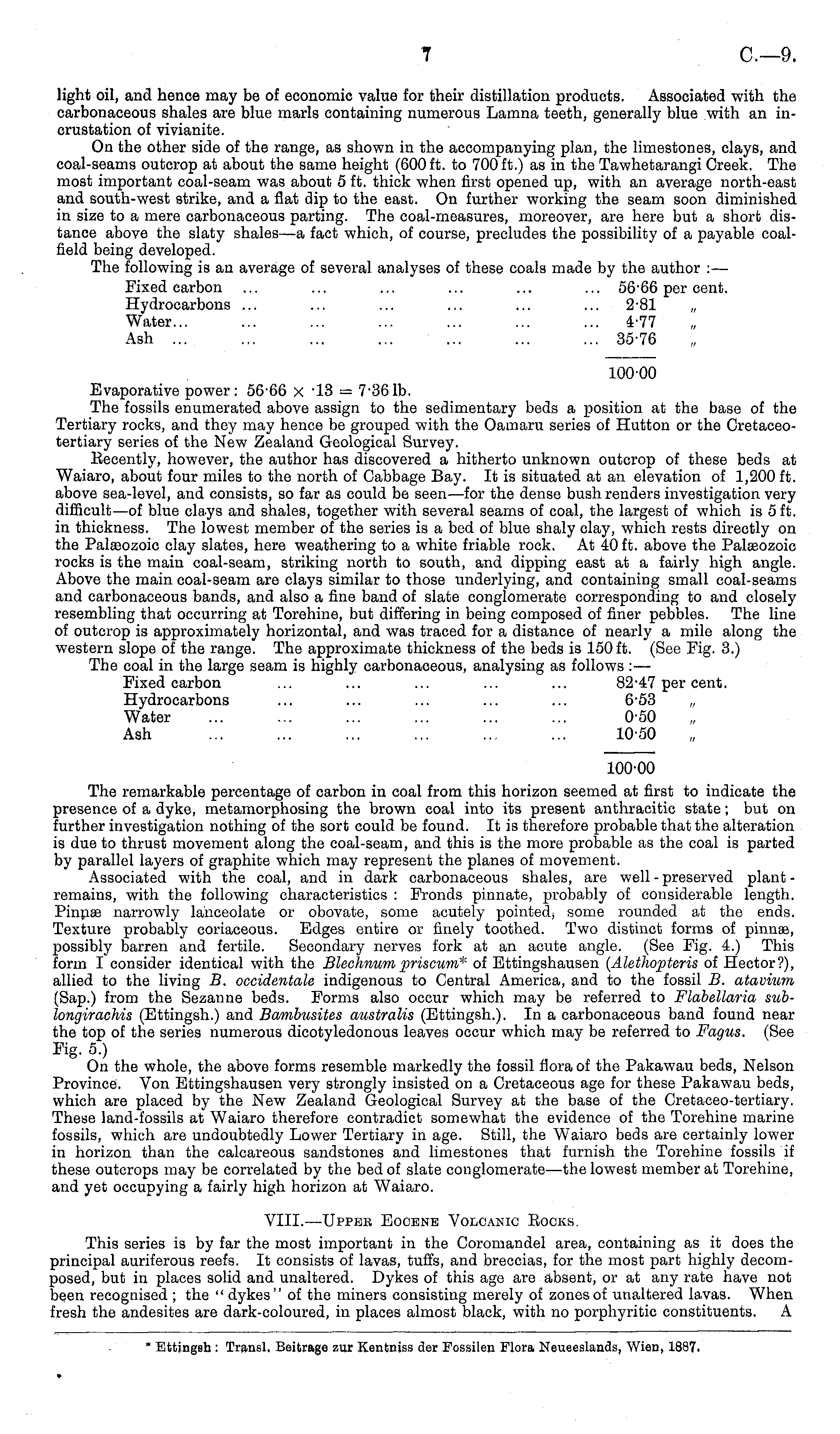 light oil, and hence may be of economic value for their distillation products. Associated with the carbonaceous shales are blue marls containing numerous Lamna teeth, generally blue with an incrustation of vivianite. On the other side of the range, as shown in the accompanying plan, the limestones, clays, and coal-seams outcrop at about the same height (600 ft. to 700 ft.) as in the Tawhetarangi Creek. The most important coal-seam was about 5 ft. thick when first opened up, with an average north-east and south-west strike, and a flat dip to the east. On further working the seam soon diminished in size to a mere carbonaceous parting. The coal-measures, moreover, are here but a short distance above the slaty shales—a fact which, of course, precludes the possibility of a payable coalfield being developed. The following is an average of several analyses of these coals made by the author :— Fixed carbon ... ... ... ... ... ... 5666 per cent. Hydrocarbons ... ... ... ... ... ... 2-81 „ Water... ... ... ... ... ... ... 4-77 Ash ... ... 35-76 10000 Evaporative power: 56-66 x -13 = 7-361b. The fossils enumerated above assign to the sedimentary beds a position at the base of the Tertiary rocks, and they may hence be grouped with the Oamaru series of Hutton or the Cretaceotertiary series of the New Zealand Geological Survey. Eecently, however, the author has discovered a hitherto unknown outcrop of these beds at Waiaro, about four miles to the north of Cabbage Bay. It is situated at an elevation of 1,200 ft. above sea-level, and consists, so far as could be seen—for the dense bush renders investigation very difficult—of blue clays and shales, together with several seams of coal, the largest of which is 5 ft. in thickness. The lowest member of the series is a bed of blue shaly clay, which rests directly on the Palaeozoic clay slates, here weathering to a white friable rock. At 40 ft. above the Palaeozoic rocks is the main coal-seam, striking north to south, and dipping east at a fairly high angle. Above the main coal-seam are clays similar to those underlying, and containing small coal-seams and carbonaceous bands, and also a fine band of slate conglomerate corresponding to and closely resembling that occurring at Torehine, but differing in being composed of finer pebbles. The line of outcrop is approximately horizontal, and was traced for a distance of nearly a mile along the western slope of the range. The approximate thickness of the beds is 150 ft. (See Kg. 3.) The coal in the large seam is highly carbonaceous, analysing as follows : — Fixed carbon ... ... ... ... ... 82-47 per cent. Hydrocarbons ... ... ... ... ... 6-53 „ Water ... ... ... ... ... ... 0-50 Ash 10-50 100-00 The remarkable percentage of carbon in coal from this horizon seemed at first to indicate the presence of a dyke, metamorphosing the brown coal into its present anthracitic state; but on further investigation nothing of the sort could be found. It is therefore probable that the alteration is due to thrust movement along the coal-seam, and this is the more probable as the coal is parted by parallel layers of graphite which may represent the planes of movement. Associated with the coal, and in dark carbonaceous shales, are well - preserved plant - remains, with the following characteristics : Fronds pinnate, probably of considerable length. Pinnae narrowly lanceolate or obovate, some acutely pointed; some rounded at the ends. Texture probably coriaceous. Edges entire or finely toothed. Two distinct forms of pinnae, possibly barren and fertile. Secondary nerves fork at an acute angle. (See Fig. 4.) This form I consider identical with the Blechnum priscum* of Ettingshausen (Alethopteris of Hector?), allied to the living B. occidentale indigenous to Central America, and to the fossil B. atavium (Sap.) from the Sezanne beds. Forms also occur which may be referred to Flabellaria sublongirachis (Ettingsh.) and Bambusites australis (Ettingsh.). In a carbonaceous band found near the top of the series numerous dicotyledonous leaves occur which may be referred to Fagus. (See Fig. 5.) On the whole, the above forms resemble markedly the fossil flora of the Pakawau beds, Nelson Province. Yon Ettingshausen very strongly insisted on a Cretaceous age for these Pakawau beds, which are placed by the New Zealand Geological Survey at the base of the Cretaceo-tertiary. These land-fossils at Waiaro therefore contradict somewhat the evidence of the Torehine marine fossils, which are undoubtedly Lower Tertiary in age. Still, the Waiaro beds are certainly lower in horizon than the calcareous sandstones and limestones that furnish the Torehine fossils if these outcrops may be correlated by the bed of slate conglomerate—the lowest member at Torehine, and yet occupying a fairly high horizon at Waiaro. Vlll.—Upper Eocene Volcanic Eocks. This series is by far the most important in the Coromandel area, containing as it does the principal auriferous reefs. It consists of lavas, tuffs, and breccias, for the most part highly decomposed, but in places solid and unaltered. Dykes of this age are absent, or at any rate have not been recognised ; the " dykes" of the miners consisting merely of zones of unaltered lavas. When fresh the andesites are dark-coloured, in places almost black, with no porphyritic constituents. A
