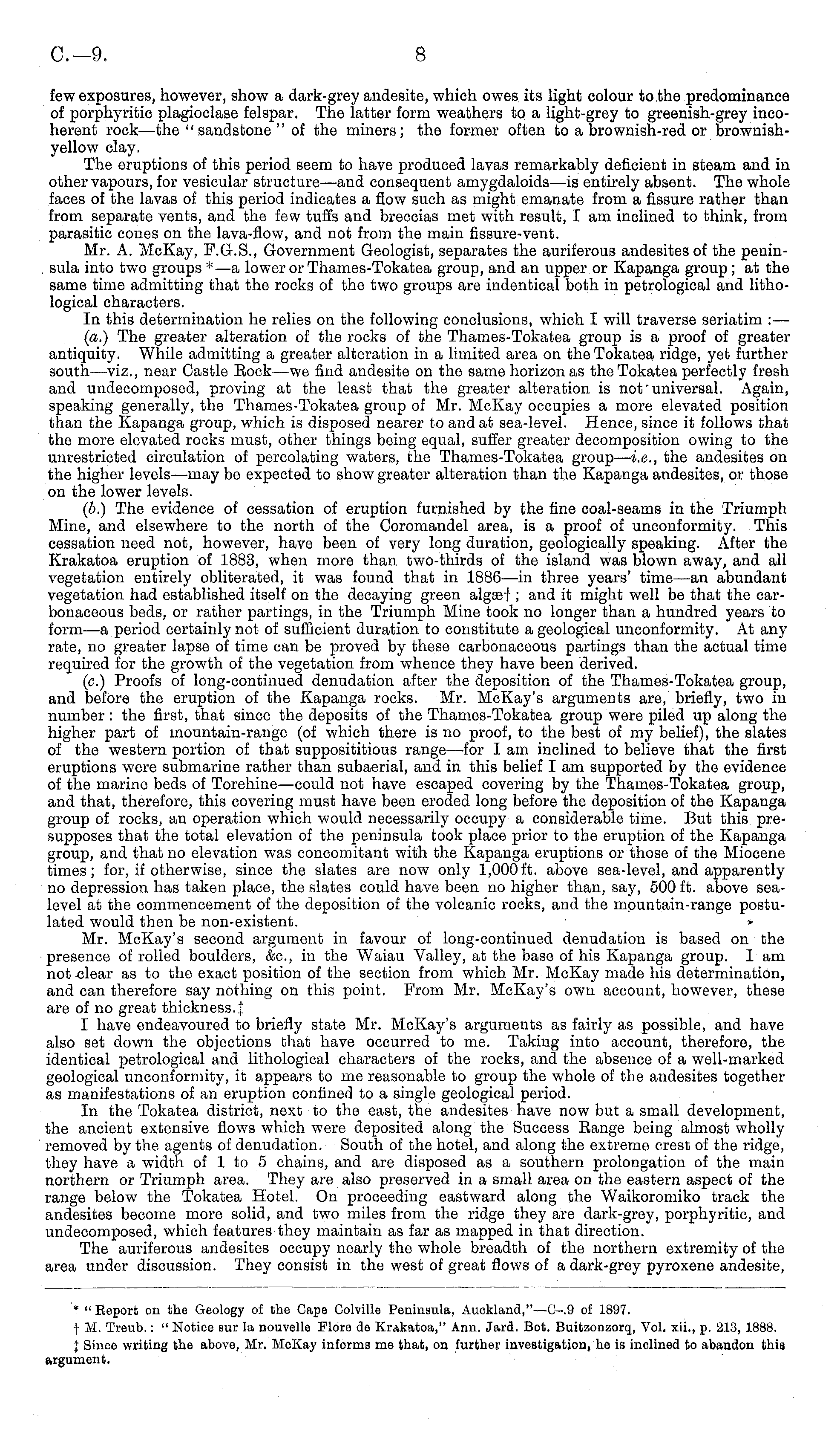 * " Report on the Geology of the Gape Colville Peninsula, Auckland," —G-.9 of 1897. tM. Treub.: " Notice cur la nouvelle Flore de Krakatoa," Ann. Jard. Bot. Buitzonzorq, Vol. xii., p. 213, 1888. { Since writing the above, Mr. McKay informs me that, on further investigation, he is inclined to abandon this argument.