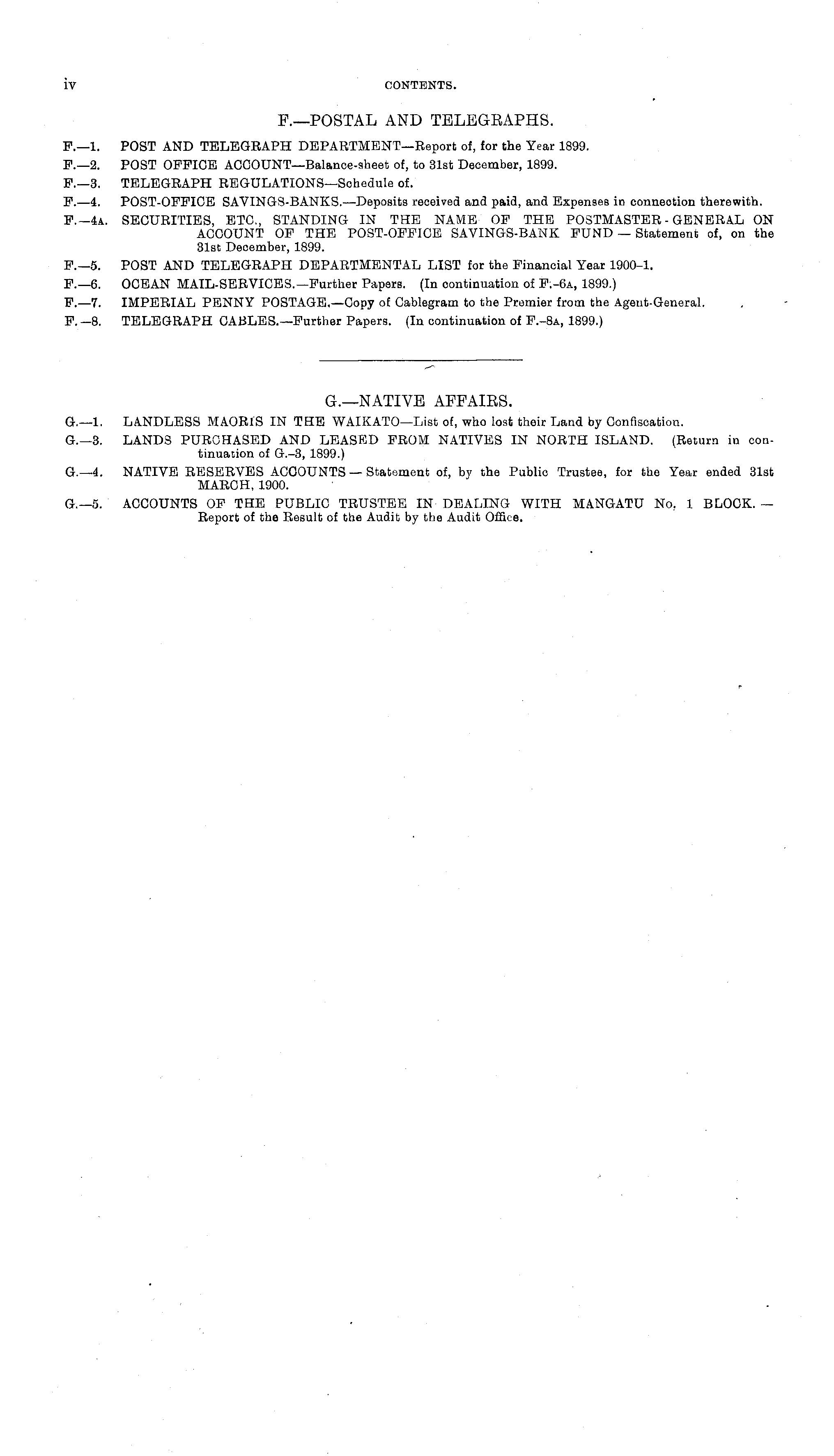 G.—NATIVE AFFAIES. G.—l. LANDLESS MAORIS IN THE WAIKATO—List of, who lost their Land by Confiscation. G.— 3. LANDS PURCHASED AND LEASED FROM NATIVES IN NORTH ISLAND. (Return in continuation of G.-3, 1899.) G.—4. NATIVE RESERVES ACCOUNTS — Statement of, by the Public Trustee, for the Year ended 31st MARCH, 1900. G.—s. ACCOUNTS OF THE PUBLIC TRUSTEE IN DEALING WITH MANGATU No, 1 BLOCK. — Report of the Result of the Audit by the Audit Office.