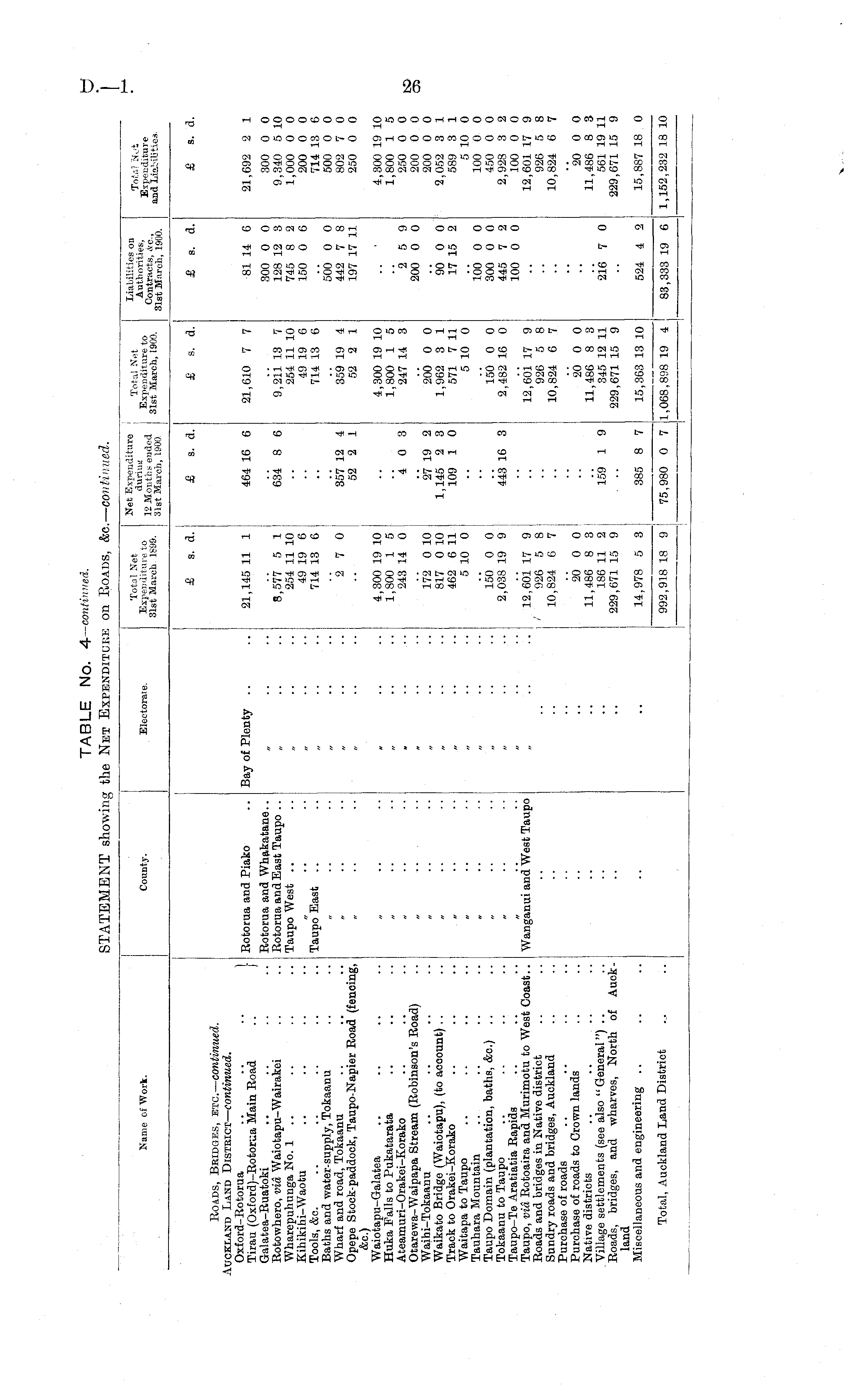 Name of Work. County. Electorate. Total Net Expenditure to 31st March 1899. Net Expenditure during 12 Months ended 31st March, 1900 Total Net Expenditure to 31st March, 1900. Liabilities on Autb orities, Contracts, «xc, 31st March, 1900. Tot,-.'' Jb't Expenditure and Liabilities. £ s. d. £ S. d. £ s. d. £ s. d. £ s. d. Roads, Bridges, etc. — continued. .uckland Land District — continued. Oxford-Rotorua .. .. .. 1 Tirau (Oxford)-Rotorua Main Road Galatea-Ruatoki Rotowhero, via Waiotapu-Wairakei Wharepuhunga No. 1 .. Kihikihi-Waotu Tools, &c. Baths and water-supply, Tokaanu Wharf and road, Tokaanu Opepe Stock-paddock, Taupo-Napier Road (fencing, &c.) Waiotapu-Galatea Huka Falls to Pukatarata Ateamuri-Orakei-Korako Otarewa-Waipapa Stream (Robinson's Road) Waihi-Tokaanu Waikato Bridge (Waiotapu), (to account) Track to Orakei-Korako Waitapa to Taupo Tauhara Mountain Taupo Domain (plantation, baths, <fec.) Tokaanu to Taupo Taupo-Te Aratiatia Rapids Taupo, via Rotoaira and Murimotu to West Coast.. Roads and bridges in Native district Sundry roads and bridges, Auckland Purchase of roads Purchase of roads to Crown lands Native districts . Village settlements (see also " General") .. Roads, bridges, and wharves, North of Auckland Miscellaneous and engineering Rotorua and Piako Rotorua and Whakatane.. Rotorua and East Taupo .. Taupo West Taupo East Bay of Plenty 21,145 11 1 8,577 5 1 254 11 10 49 19 6 714 13 6 2 7 0 4,300 19 10 1,800 1 5 243 14 0 172 0 10 817 0 10 462 6 11 5 10 0 464 16 6 634 8 6 357 12 4 52 2 1 4 0 3 27 19 2 1,145 2 3 109 1 0 21,610 7 7 9,211 13 7 254 11 10 49 19 6 714 13 6 359 19 4 52 2 1 4,300 19 10 1,800 1 5 247 14 3 200 0 0 1,962 3 1 571 7 11 5 10 0 81 14 6 300 0 0 128 12 3 745 8 2 150 0 6 500 0 0 442 7 8 197 17 11 '2 5 9 200 0 0 90 0 0 17 15 2 21,692 2 1 300 0 0 9,340 5 10 1,000 0 0 200 0 0 714 13 6 500 0 0 802 7 0 250 0 0 4,300 19 10 1,800 1 5 250 0 0 200 0 0 200 0 0 2,052 3 1 589 3 1 5 10 0 100 0 0 450 0 0 2,928 3 2 100 0 0 12,601 17 9 926 5 8 10,824 6 7 150 0 0 2,038 19 9 443 16 3 150 0 0 2,482 16 0 100 0 0 300 0 0 445 7 2 100 0 0 Wanganui and West Taupo 12,601 17 9 926 5 8 10,824 6 7 12,601 17 9 926 5 8 10,824 6 7 20 0 0 11,486 8 3 186 11 2 229,671 15 9 159 1 9 20 0 0 11,486 8 3 345 12 11 229,671 15 9 216 7 0 20 0 0 11,486 8 3 561 19 11 229,671 15 9 14,978 5 3 385 8 7 15,363 13 10 524 4 2 15,887 18 0 Total, Auckland Land District 992,918 18 9 ! 75,980 0 7 1,068,898 19 4 83,333 19 6 1,152,232 18 10