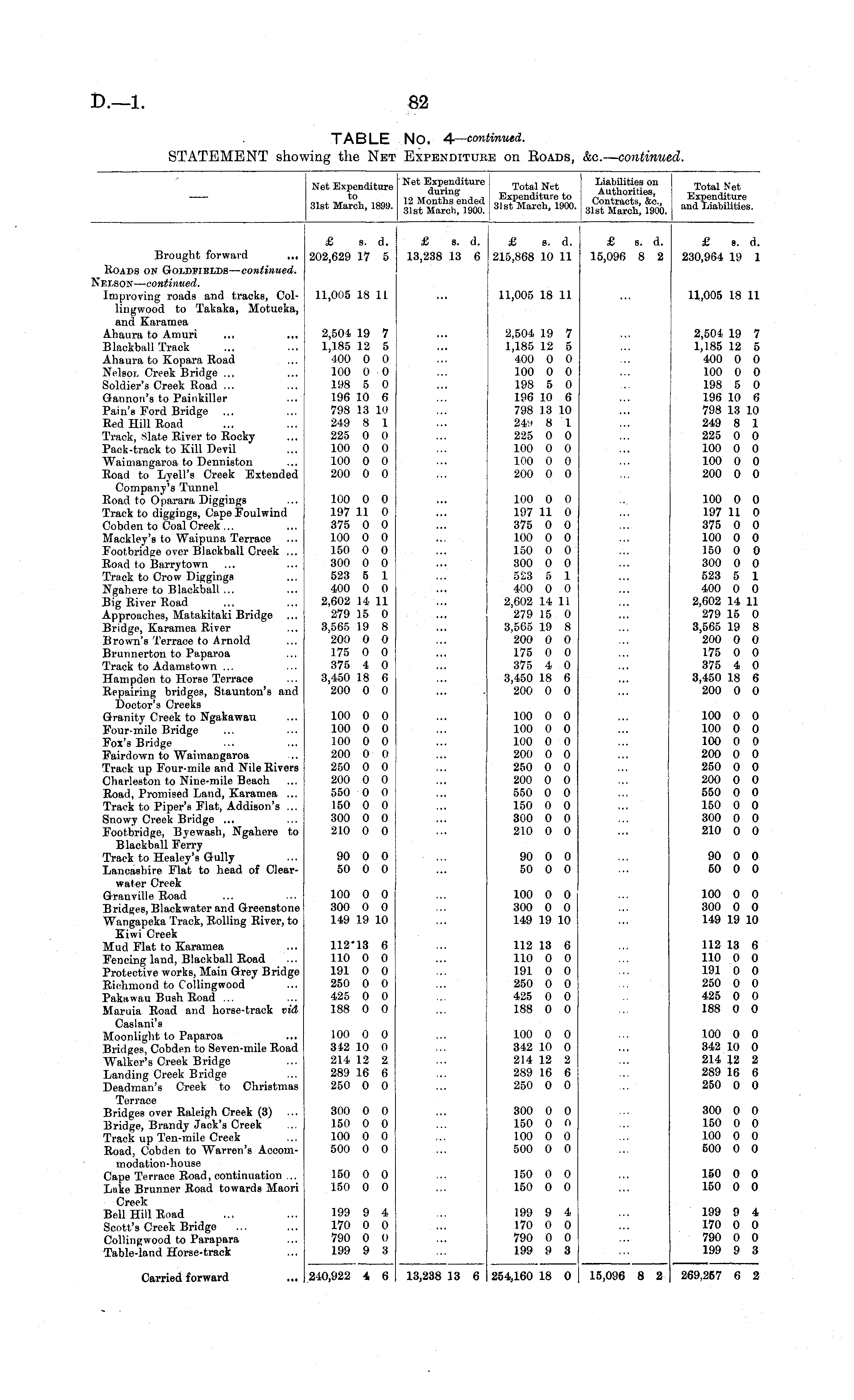 Net Expenditure to 31st March, 1899. Net Expenditure during 12 Months ended 31st March, 1900. Total Net Expenditure to 31st March, 1900. Liabilities on Authorities, Contracts, Ac, 31st March, 1900. Total Net Expenditure and Liabilities. Brought forward ... Roads on Goldwelds — continued. Selson— continued. Improving roads and tracks, Collingwood to Takaka, Motueka, and Karamea Ahaura to Amuri Blackball Track Ahaura to Kopara Road Nelsor. Creek Bridge ... Soldier's Creek Road ... Gannon's to Painkiller Pain's Ford Bridge Red Hill Road Track, Slate River to Rocky Pack-track to Kill Devil Waimangaroa to Denniston Road to Lyell's Creek Extended Company's Tunnel Road to Oparara Diggings Track to diggings, Cape Foulwind Cobden to Coal Creek ... Mackley's to Waipuna Terrace Footbridge over Blackball Creek ... Road to Barry town Track to Crow Diggings Ngahere to Blackball ... Big River Road Approaches, Matakitaki Bridge Bridge, Karamea River Brown's Terrace to Arnold Brunnerton to Paparoa Track to Adamstown ... Hampden to Horse Terrace Repairing bridges, Staunton's and Doctor's Creeks Granity Creek to Ngakawau Four-mile Bridge Fox's Bridge Fairdown to Waimangaroa Track up Four-mile and Nile Rivers Charleston to Nine-mile Beach Road, Promised Land, Karamea ... Track to Piper's Flat, Addison's ... Snowy Creek Bridge ... Footbridge, Byewash, Ngahere to Blackball Ferry Track to Healey's Gully Lancashire Flat to head of Clearwater Creek Granville Road Bridges, Blackwater and Greenstone Wangapeka Track, Rolling River, to Kiwi Creek Mud Flat to Karamea Fencing land, Blackball Road Protective works, Main Grey Bridge Richmond to Collingwood Pakawau Bush Road ... Maruia Road and horse-track vid Caslani's Moonlight to Paparoa Bridges, Cobden to Seven-mile Road Walker's Creek Bridge Landing Creek Bridge Deadman's Creek to Christmas Terrace Bridges over Raleigh Creek (3) Bridge, Brandy Jack's Creek Track up Ten-mile Creek Road, Cobden to Warren's Accom-modation-house Cape Terrace Road, continuation ... Lake Brunner Road towards Maori Creek Bell Hill Road Scott's Creek Bridge Collingwood to Parapara Table-land Horse-track £ s. d. 202,629 17 5 £ s. d. 13,238 13 6 £ a. d. 215,868 10 11 £ a. A. 15,096 8 2 £ s. d. 230,964 19 1 11,005 18 11 11,005 18 11 11,005 18 11 2,504 19 7 1,185 12 5 400 0 0 100 0 0 198 5 0 196 10 6 798 13 10 249 8 1 225 0 0 100 0 0 100 0 0 200 0 0 2,504 19 7 1,185 12 5 400 0 0 100 0 0 198 5 0 196 10 6 798 13 10 24a 8 1 225 0 0 100 0 0 100 0 0 200 0 0 2,504 19 7 1,185 12 5 400 0 0 100 0 0 198 5 0 196 10 6 798 13 10 249 8 1 225 0 0 100 0 0 100 0 0 200 0 0 100 0 0 197 11 0 375 0 0 100 0 0 150 0 0 300 0 0 523 5 1 400 0 0 2,602 14 11 279 15 0 3,565 19 8 200 0 0 175 0 0 375 4 0 3,450 18 6 200 0 0 100 0 0 197 11 0 375 0 0 100 0 0 150 0 0 300 0 0 523 5 1 400 0 0 2,602 14 11 279 15 0 3,565 19 8 200 0 0 175 0 0 375 4 0 3,450 18 6 200 0 0 100 0 0 197 11 0 375 0 0 100 0 0 150 0 0 300 0 0 523 5 1 400 0 0 2,602 14 11 279 15 0 3,565 19 8 200 0 0 175 0 0 375 4 0 3,450 18 6 200 0 0 100 0 0 100 0 0 100 0 0 200 0 0 250 0 0 200 0 0 550 0 0 150 0 0 300 0 0 210 0 0 100 0 0 100 0 0 100 0 0 200 0 0 250 0 0 200 0 0 550 0 0 150 0 0 300 0 0 210 0 0 100 0 0 100 0 0 100 0 0 200 0 0 250 0 0 200 0 0 550 0 0 150 0 0 300 0 0 210 0 0 90 0 0 50 0 0 90 0 0 50 0 0 90 0 0 50 0 0 100 0 0 300 0 0 149 19 10 100 0 0 300 0 0 149 19 10 100 0 0 300 0 0 149 19 10 112-13 6 110 0 0 191 0 0 250 0 0 425 0 0 188 0 0 112 13 6 110 0 0 191 0 0 250 0 0 425 0 0 188 0 0 112 13 6 110 0 0 191 0 0 250 0 0 425 0 0 188 0 0 100 0 0 342 10 0 214 12 2 289 16 6 250 0 0 100 0 0 342 10 0 214 12 2 289 16 6 250 0 0 100 0 0 342 10 0 214 12 2 289 16 6 250 0 0 300 0 0 150 0 0 100 0 0 500 0 0 300 0 0 150 0 0 100 0 0 500 0 0 300 0 0 150 0 0 100 0 0 500 0 0 150 0 0 150 0 0 150 0 0 150 0 0 150 0 0 150 0 0 199 9 4 170 0 0 790 0 0 199 9 3 199 9 4 170 0 0 790 0 0 199 9 3 199 9 4 170 0 0 790 0 0 199 9 3 Carried forward 240,922 4 6 13,238 13 6 254,160 18 0 15,096 8 2 269,257 6