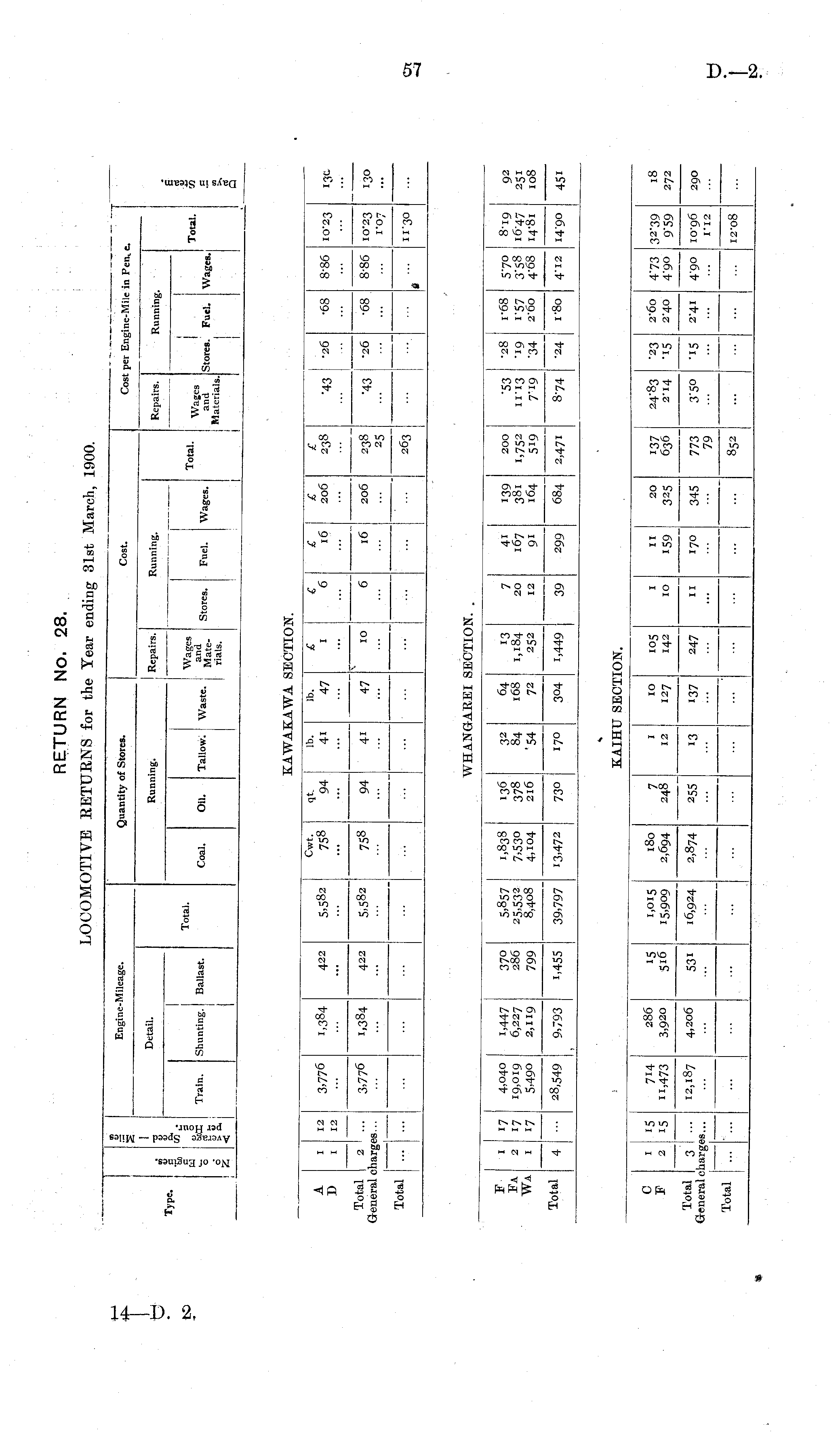Type. ID o Z aj OJ t, L- O. Train. Shunting. | Ballast. I Detail. Engine-Mileage. Coal. Oil. Quantity of Stores. Rum ling Repairs. Running. Stores. Fuel. Wages. Cost. Repairs. Cost per Engine-Mile in Pen,. Running. ci ca rt Total. Wages Tallow. Waste. ,«£_ j rials. Total. Wages and Materials. 1 Stores. Fuel. Wages. Total. awakawa section. A D i 12 12 3,776 1,384 422 5,582 Cwt. 758 94 lb. 41 lb. 47 £ I £ 6 £ 16 £ 206 £ 238 '43 •26 •68 8-86 10-23 13c ... ... ... Total General — ! 6 16 ! 1 •26 I 2 I «... 3,776 1,384 422 5,582 758 94 4i 47 10 206 238 25 ■43 •68 8-86 10*23 1*07 130 :harg( ... ... Total !— I ... ... - ... ... 263 11-30 i - HANGAREI iectio: F Fa Wa i 2 17 •7 4,040 19,019 5.490 1,447 6,227 2,119 37° 286 799 5,857 25,532 8,408 1,838 7,530 4,104 136 378 2l6 32 84 54 64 168 72 13 1,184 252 7 20 12 41 167 91 139 381 164 684 200 1,752 519 •53 11-13 7-19 8-74 •28 ■19 ■34 r68 i-57 2'6o 5-7° 3-58 4-68 8-19 1647 14-81 92 2SI 108 I Total — i-8o 4 ■■■ 28,549 9,793 i,455 39,797 13,472 73° 170 304 i,449 39 299 2,471 •24 4-12 14-90 4Si \ KAIHU SECTION. C F 1 2 i5 i5 7H ",473 286 3,920 15 516 1,015 15,909 180 2,694 7 248 1 12 10 127 105 142 I 11 159 20 325 137 636 24-83 2-14 '23 ■15 2-60 473 4-90 32-39 9'59 10-96 1*12 18 IO 2-40 272 Total General I 3 I ... 12,187 4,206 531 16,924 2,874 255 13 137 247 — II 170 345 773 79 852 3'5° -15 2-41 490 290 «... ... ... ... ... ... ... ... ... Total I2'08 - - - -. ... ... - - ...