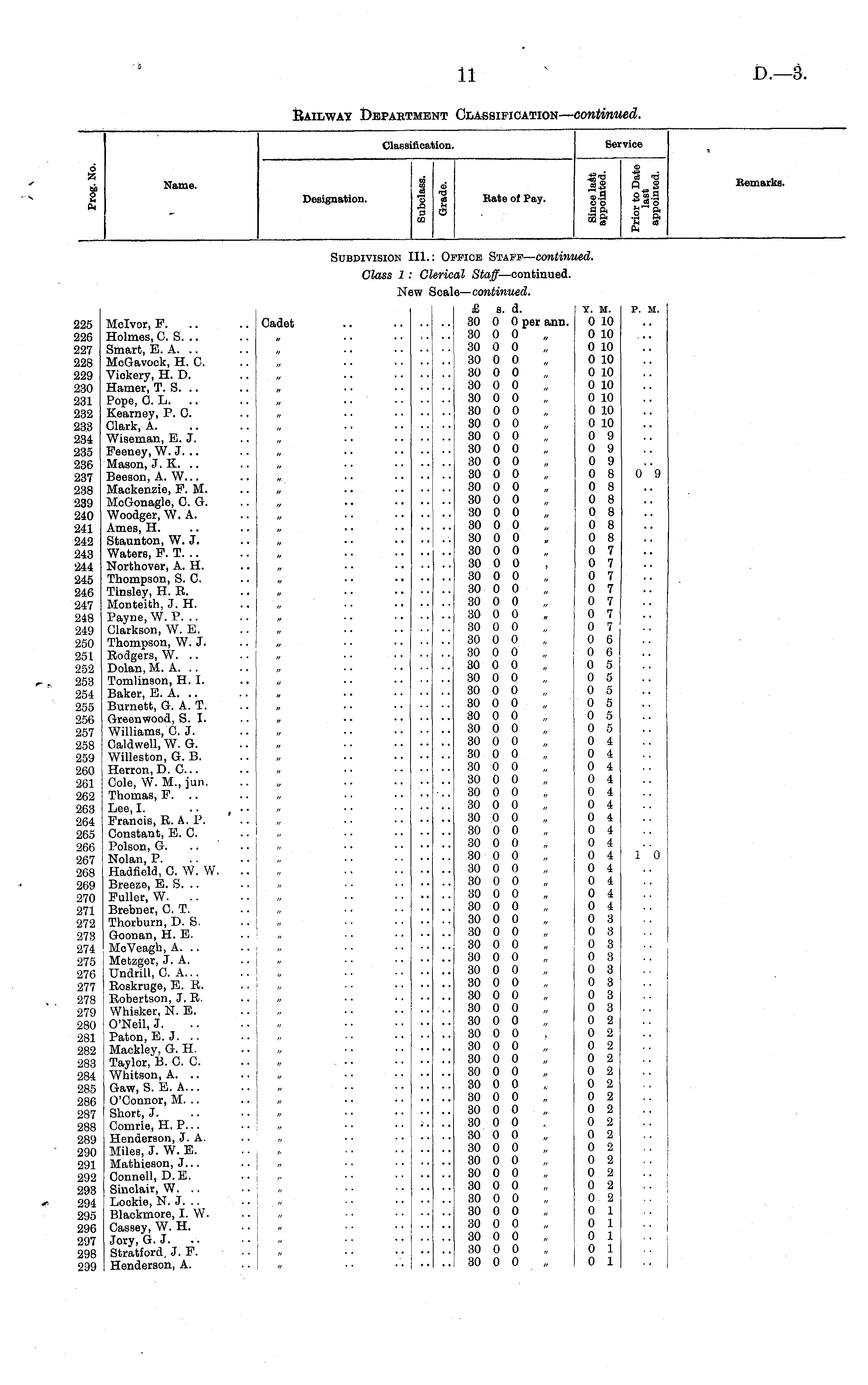 Clas! .cai don. Service I 6 Name. Designation. i I U2 ■8 $ Bate of Fay. si *is Bemarke. Subdivision :n. : O: FFicE Staff — continu led. Class 1 Gi lerk \al Staff— continued. le — continued. Ni )W i Seal 225 226 227 228 229 230 231 232 233 234 235 236 237 238 239 240 241 242 243 244 245 246 247 248 249 250 251 252 253 254 255 256 257 258 259 260 261 262 263 264 265 266 267 268 269 270 271 272 273 274 275 276 277 278 279 280 281 282 283 284 285 286 287 288 289 290 291 292 293 294 295 296 297 298 299 Mclvor, F. Holmes, G. S. .. Smart, E. A. .. MoGavock, H. C. Viokery, H. D. Hamer, T. S. Pope, 0. L. Kearney, P. 0. Clark, A. Wiseman, E. J. Feeney, W. J. .. Mason, J. K. Beeson, A. W... Mackenzie, F. M. MoGonagle, 0. G. Woodger, W. A. Ames, H. Staunton, W. J. Waters, F. T. .. Northover, A. H. Thompson, S. 0. Tinsley, H. E. Monteith, J. H. Payne, W. P. .. Clarkson, W. E. Thompson, W. J. Eodgers, W. .. Dolan, M. A. .. Tomlinson, H. I. Baker, E. A. Burnett, G. A. T. Greenwood, S. I. Williams, G. J. Oaldwell, W. G. Willeston, G. B. Herron, D. C... Cole, W. M., jun. Thomas, F. .. Lee, I. Francis, R. A. P. Constant, E. C. Poison, G. Nolan, P. Hadfield, C. W. W. Breeze, E. S. Fuller, W. Brebner, G. T. Thorburn, D. S. Goonan, H. E. McVeagh, A. .. Metzger, J. A. Undrill, C. A... Eoskruge, E. R. Robertson, 3. R. Whisker, N. E. O'Neil, J. Paton, E. J. Maokley, G. H. Taylor, B. 0. C. Whitson, A. .. Gaw, S. E. A... O'Connor, M. .. Short, J. Comrie, H. P... Henderson, J. A. Miles, J. W. E. Mathieson, J.. . Connell, D.E. Sinclair, W. .. Lookie, N. J. .. Blackmore, I. W. Caseey, W. H. Jory, G. J. Stratford, J. F. Henderson, A. Cadet £ s. d. 30 0 0 per ann. 30 0 0 30 0 0 30 0 0 30 0 0 30 0 0 30 0 0 30 0 0 30 0 0 30 0 0 30 0 0 30 0 0 30 0 0 30 0 0 30 0 0 30 0 0 30 0 0 30 0 0 30 0 0 30 0 0 30 0 0 30 0 0 30 0 0 30 0 0 30 0 0 30 0 0 80 0 0 30 0 0 30 0 0 30 0 0 30 0 0 30 0 0 30 0 0 30 0 0 30 0 0 30 0 0 30 0 0 30 0 0 30 0 0 30 0 0 30 0 0 30 0 0 30 0 0 30 0 0 30 0 0 30 0 0 30 0 0 30 0 0 30 0 0 30 0 0 30 0 0 30 0 0 30 0 0 30 0 0 30 0 0 30 0 0 30 0 0 30 0 0 30 0 0 30 0 0 30 0 0 30 0 0 30 0 0 30 0 0 30 0 0 30 0 0 30 0 0 30 0 0 30 0 0 30 0 0 30 0 0 30 0 0 30 0 0 30 0 0 30 0 0 „ I Y. M. 0 10 0 10 0 10 0 10 0 10 0 10 0 10 0 10 0 10 0 9 0 9 0 9 0 8 0 8 0 8 0 8 0 8 0 8 0 7 0 7 0 7 0 7 0 7 0 7 0 7 0 6 0 6 0 5 0 S 0 5 0 5 0 5 0 5 0 4 0 4 0 4 0 4 0 4 0 4 0 4 0 4 j 0 4 ! 0 4 0 4 0 4 0 4 0 4 : 0 3 0 3 0 3 0 3 0 3 0 3 0 3 0 3 0 2 0 2 0 2 0 2 0 2 0 2 0 2 0 2 0 2 0 2 0 2 0 2 0 2 0 2 0 2 0 1 0 1 0 1 i 0 1 P. M. 0 - 9 I 0