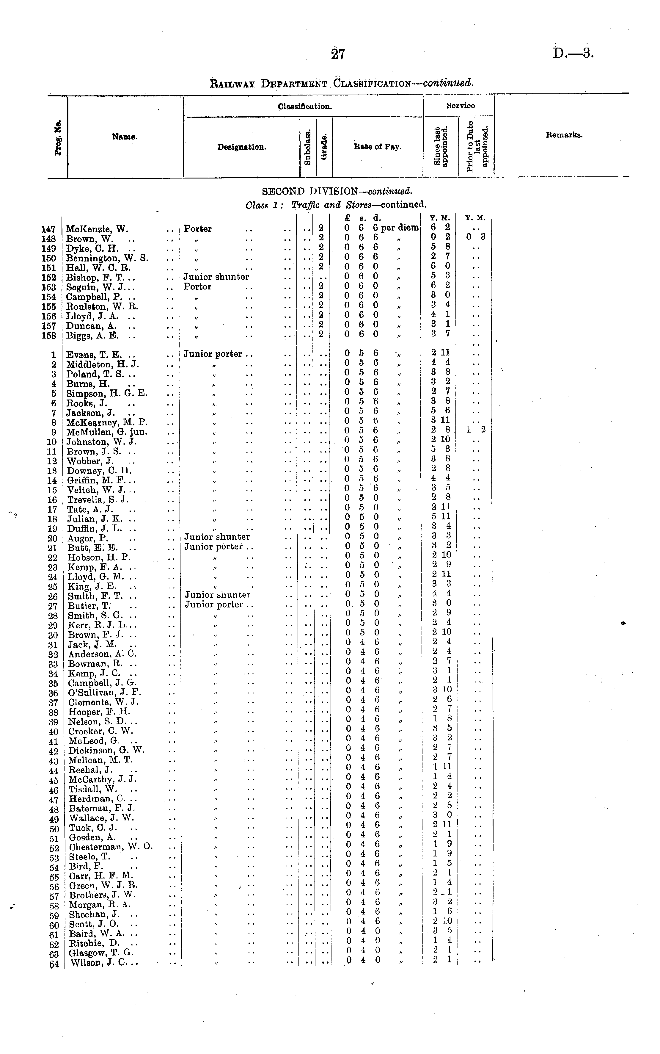 Classi iflcal sion. Service I Name. Designation. I I ! Bate of Fay. II y I" I Remarks. SECOE )iv: SION— continued. Class 1: 'i !c a d Stores —oontinuei L. .47 .48 149 L50 L51 L52 153 154 155 156 L57 158 MeKenzie, W. Brown, W. .. Dyke, 0. H. Bennington, W. S. Hall, W. G. B. Bishop, P. T. .. Seguin, W. J. .. Campbell, P. .. Roulaton, W. R. Lloyd, J. A. .. Duncan, A. Biggs, A. E. .. Porter Junior shunter Porter 2 2 2 2 2 2 2 2 2 2 2 £ 9. a. 0 6 6 per aiem 0 6 6 0 6 6 0 6 6 0 6 0 0 6 0 0 6 0 0 6 0 0 6 0 0 6 0 0 6 0 0 6 0 i Y. M. 6 2 0 2 5 8 2 7 6 0 5 3 6 2 3 0 3 4 4 1 3 1 3 7 Y. M. 0 3 „ • . . . 1 2 3 4 5 6 7 8 9 10 11 12 13 14 15 16 17 18 19 20 21 22 23 24 25 26 27 28 29 30 31 32 33 34 35 36 37 38 39 40 41 42 43 44 45 46 47 48 49 50 51 52 53 54 55 56 57 58 59 60 61 62 63 64 Evans, T. E. .. Miadleton, H. J. Poland, T. S. .. Burns, H. Simpson, H. G. E. Rooks, J. Jackson, J. McKearney, M. P. McMullen, G. jun. Johnston, W. j. Brown, J. S. Webber, J. .. Downey, C. H. Griffin, M. F. .. Veitch, W. J. .. Trevella, S. J. Tate, A. J. Julian, J. K. Duffin, J. L. Auger, P. Butt, E. E. .. Hobson, H. P. Kemp, P. A. .. Lloyd, G. M. King, J. B. .. Smith, P. T. .. Butler, T. Smith, S. G. Kerr, R.J. L... Brown, P. J. Jack, J. M. Anderson, A. 0. Bowman, R. .. Kemp, J. C. .. Campbell, J. G. O'Sullivan, J. F. Clements, W. J. Hooper, P. H. Nelson, S. D. .. Crocker, C. W. McLeod, G. .. Dickinson, G. W. Melican, M. T. Reehal, J. McCarthy, J. J. Tisdall, W. .. Herdman, C. .. Bateman, P. J. Wallace, J. W. Tuck, C. J. Gosden, A. Chesterman, W. O. Steele, T. Bird, P. Carr, H. P. M. Green, W. J. R. Brother*, J. W. Morgan, R. A. Sheehan, J. Scott, J. O. .. Baird, W. A. Ritchie, D. .. Glasgow, T. G. Wilson, J. C. .. Junior porter Junior shunter Junior porter Junior shunter Junior porter .. j ■• ••! 0 5 6 0 5 6 0 5 6 0 5 6 0 5 6 0 5 6 0 5 6 0 5 6 0 5 6 0 5 6 0 5 6 0 5 6 0 5 6 0 5 6 0 5 6 0 5 0 0 5 0 0 5 0 0 5 0 0 5 0 0 5 0 0 5 0 0 5 0 0 5 0 0 5 0 0 5 0 0 5 0 0 3 0 0 5 0 0 5 0 0 4 6 0 4 6 0 4 6 0 4 6 0 4 6 0 4 6 0 4 6 0 4 6 0 4 6 0 4 6 0 4 6 0 4 6 0 4 6 0 4 6 0 4 6 0 4 6 0 4 6 0 4 6 0 4 6 0 4 6 0 4 6 0 4 6 0 4 6 0 4 6 0 4 6 0 4 6 0 4 6 0 4 6 0 4 6 0 4 6 0 4 0 0 4 0 0 4 0 0 4 0 I 2 11 4 4 3 8 3 2 2 7 3 8 5 6 3 11 2 8 2 10 5 3 3 8 2 8 4 4 3 5 2 8 2 11 5 11 3 4 3 3 3 2 2 10 2 9 2 11 3 3 4 4 3 0 2 9 2 4 a io 2 4 2 4 2 7 3 1 2 1 3 10 2 6 a 7 1 8 3 5 3 2 2 7 2 7 1 11 1 4 2 4 2 2 2 8 3 0 2 11 2 1 1 9 1 9 1 5 2 1 1 4 2,1 3 2 1 6 2 10 3 5 1 4 2 1 2 1 12 " j • .• • • „ „ „