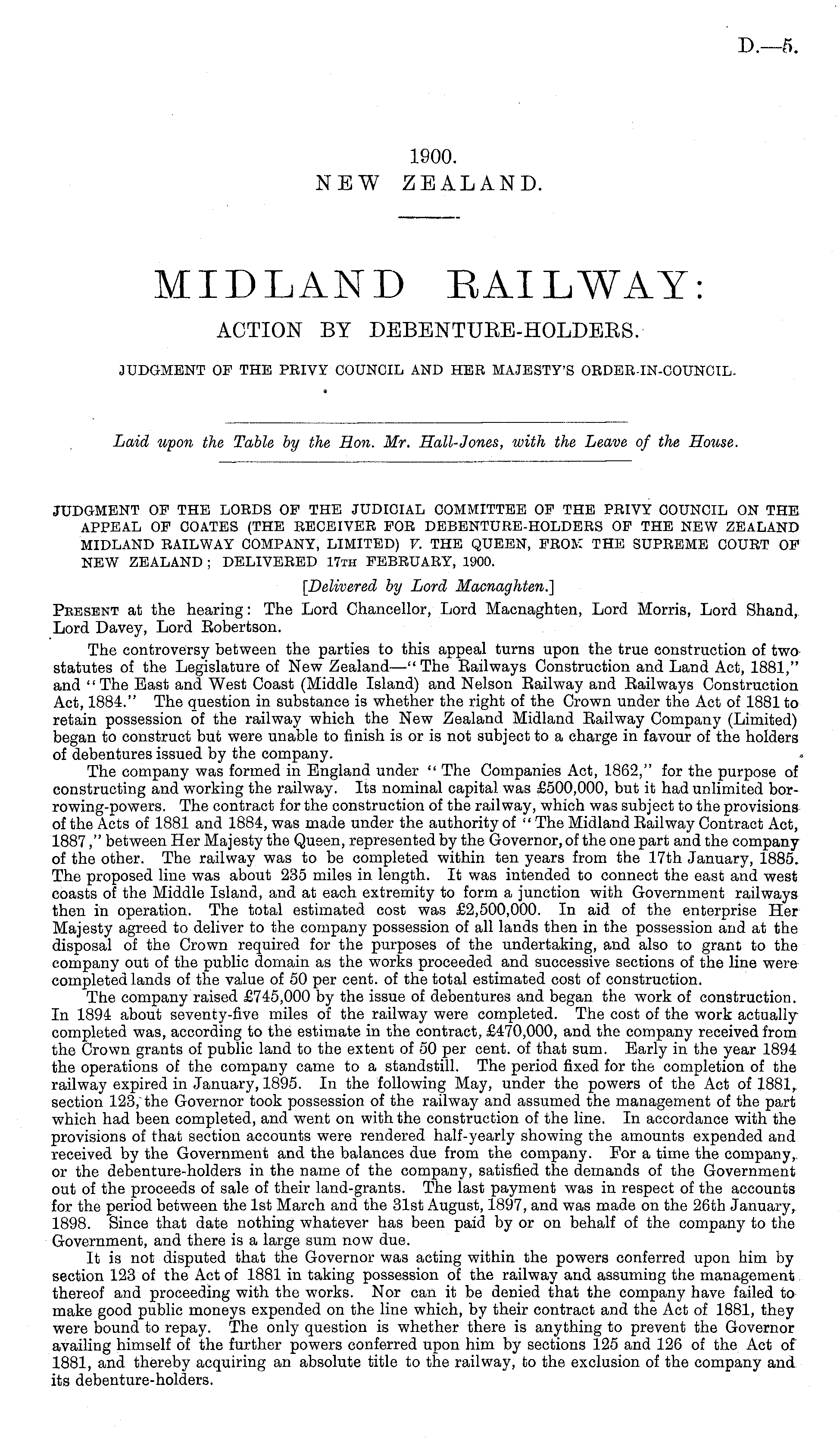 JUDGMENT OP THE LORDS OF THE JUDICIAL COMMITTEE OF THE PRIVY COUNCIL ON THE APPEAL OF COATES (THE RECEIVER FOR DEBENTURE-HOLDERS OF THE NEW ZEALAND MIDLAND RAILWAY COMPANY, LIMITED) V. THE QUEEN, FROK THE SUPREME COURT OF NEW ZEALAND ; DELIVERED 17th FEBRUARY, 1900. [Delivered by Lord Macnaghten.] Peesbnt at the hearing: The Lord Chancellor, Lord Macnaghten, Lord Morris, Lord Shand, Lord Davey, Lord Robertson. The controversy between the parties to this appeal turns upon the true construction of two statutes of the Legislature of New Zealand—" The Railways Construction and Land Act, 1881," and "The Bast and West Coast (Middle Island) and Nelson Railway and Railways Construction Act, 1884." The question in substance is whether the right of the Crown under the Act of 1881 to retain possession of the railway which the New Zealand Midland Railway Company (Limited) began to construct but were unable to finish is or is not subject to a charge in favour of the holders of debentures issued by the company. . The company was formed in England under " The Companies Act, 1862," for the purpose of constructing and working the railway. Its nominal capital was £500,000, but it had unlimited bor-rowing-powers. The contract for the construction of the railway, which was subject to the provisions of the Acts of 1881 and 1884, was made under the authority of " The Midland Railway Contract Act, 1887," between Her Majesty the Queen, represented by the Governor, of the one part and the company of the other. The railway was to be completed within ten years from the 17th January, 1885. The proposed line was about 235 miles in length. It was intended to connect the east and west coasts of the Middle Island, and at each extremity to form a junction with Government railways then in operation. The total estimated cost was £2,500,000. In aid of the enterprise Her Majesty agreed to deliver to the company possession of all lands then in the possession and at the disposal of the Crown required for the purposes of the undertaking, and also to grant to the company out of the public domain as the works proceeded and successive sections of the line were completed lands of the value of 50 per cent, of the total estimated cost of construction. The company raised £745,000 by the issue of debentures and began the work of construction. In 1894 about seventy-five miles of the railway were completed. The cost of the work actually completed was, according to the estimate in the contract, £470,000, and the company received from the Crown grants of public land to the extent of 50 per cent, of that sum. Early in the year 1894 the operations of the company came to a standstill. The period fixed for the completion of the railway expired in January, 1895. In the following May, under the powers of the Act of 1881, section. 123, the Governor took possession of the railway and assumed the management of the part which had been completed, and went on with the construction of the line. In accordance with the provisions of that section accounts were rendered half-yearly showing the amounts expended and received by the Government and the balances due from the company. For a time the company, or the debenture-holders in the name of the company, satisfied the demands of the Government out of the proceeds of sale of their land-grants. The last payment was in respect of the accounts for the period between the Ist March and the 31st August, 1897, and was made on the 26th January, 1898. Since that date nothing whatever has been paid by or on behalf of the company to the Government, and there is a large sum now due. It is not disputed that the Governor was acting within the powers conferred upon him by section 123 of the Act of 1881 in taking possession of the railway and assuming the management thereof and proceeding with the works. Nor can it be denied that the company have failed to make good public moneys expended on the line which, by their contract and the Act of 1881, they were bound to repay. The only question is whether there is anything to prevent the Governor availing himself of the further powers conferred upon him by sections 125 and 126 of the Act of 1881, and thereby acquiring an absolute title to the railway, to the exclusion of the company and its debenture-holders.