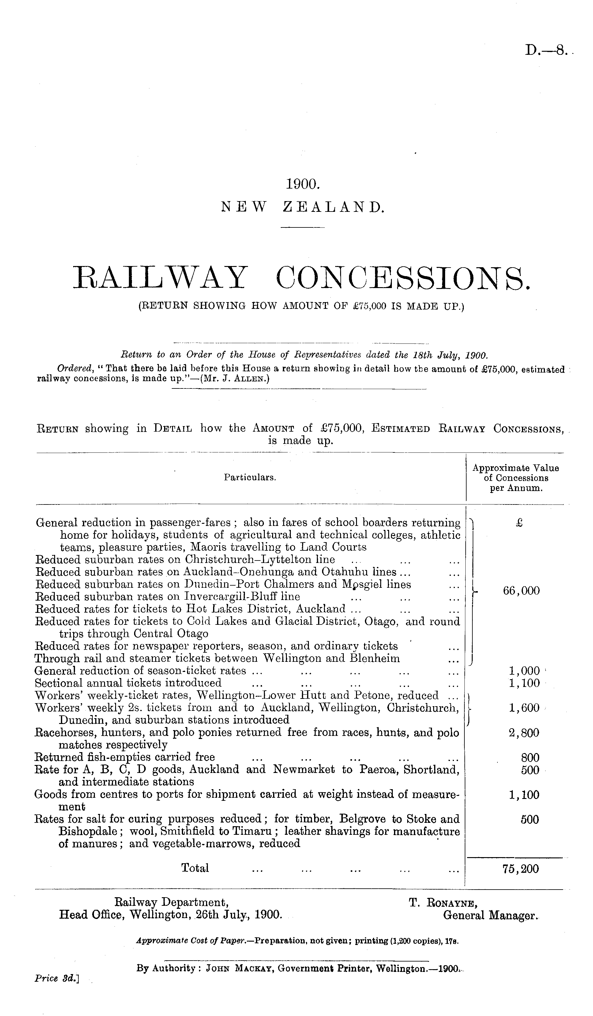 Railway Department, T. Ronaynb, Head Office, Wellington, 26th July, 1900. General Manager. Approximate Cost of Paper.— Preparation, not given; printing (1,200 copies), 17s.